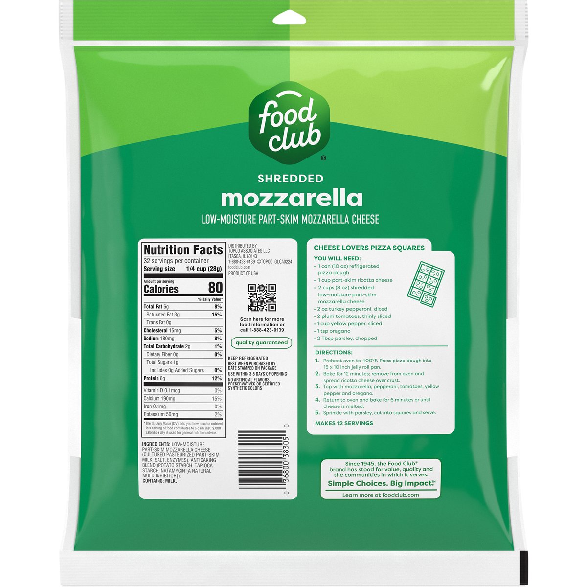 8 cups. No artificial flavors, preservatives or synthetic colors. Good source of protein. Good source of calcium. See nutrition information for saturated fat content. Since 1945, the Food Club brand has stood for value, quality and the communities in which it serves. Simple Choices. Big Impact. Quality guaranteed. foodclub.com. Scan for more food information or call 1-888-423-0139. 1-888-423-0139. Learn more at foodclub.com. Resealable. Product of USA.