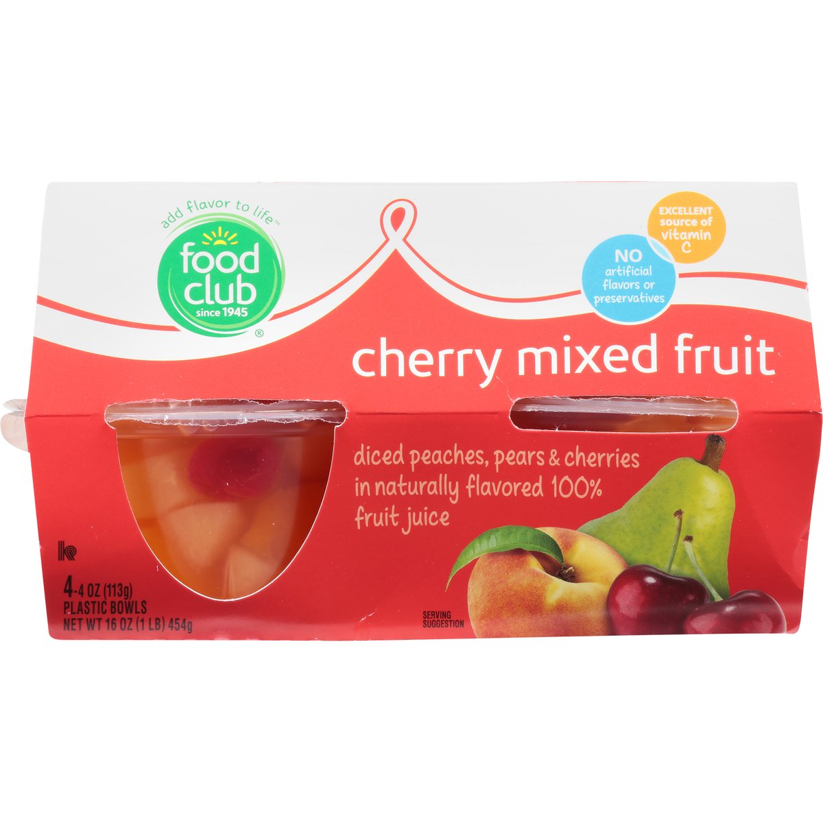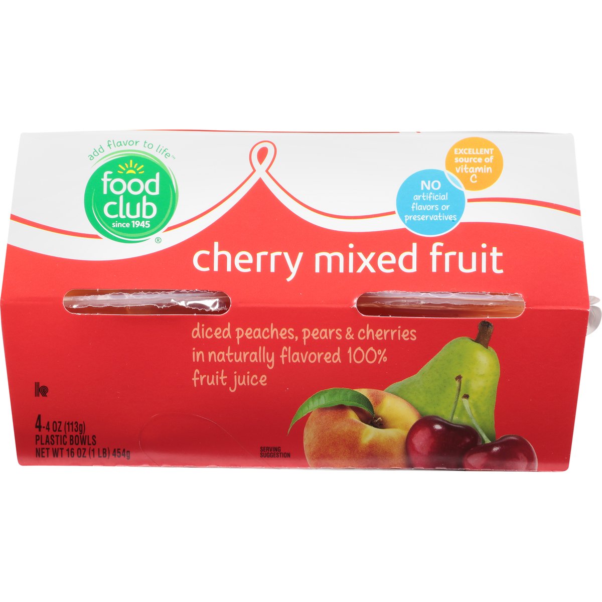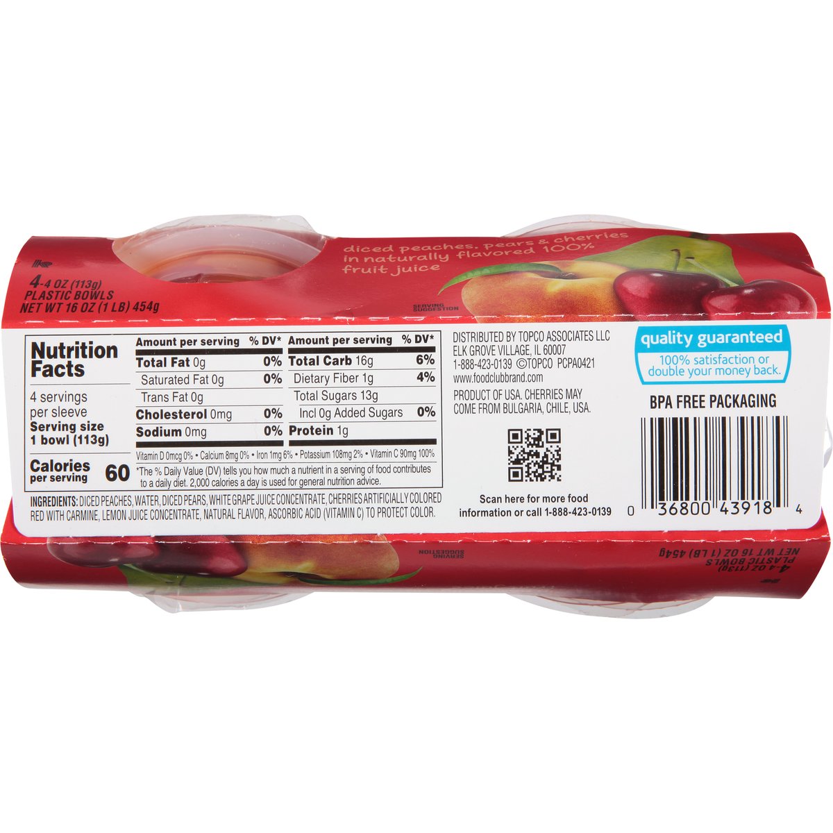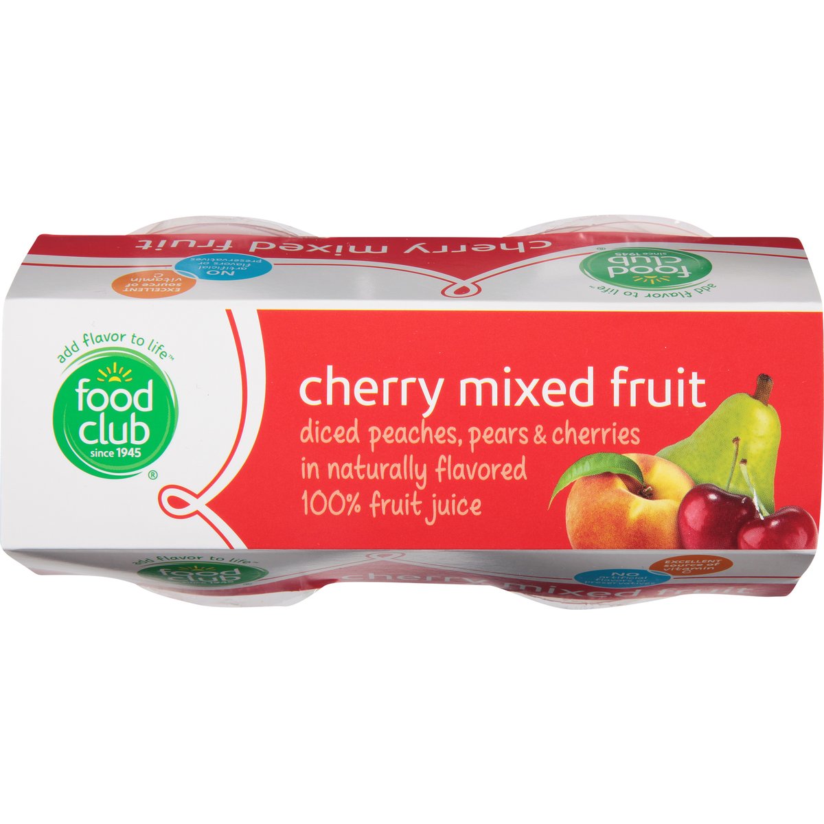 Diced peaches, pears & cherries in naturally flavored 100% fruit juice. No artificial flavors or preservatives. Excellent source of vitamin C. Add flavor to life. Since 1945. Quality Guaranteed: 100% satisfaction or double your money back. www.foodclubbrand.com. Scan for more food information or call 1-888-423-0139. BPA free packaging. Product of USA. Cherries may come from Bulgaria, Chile, USA.