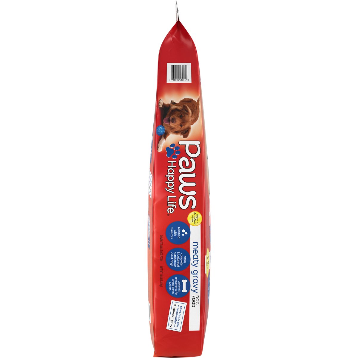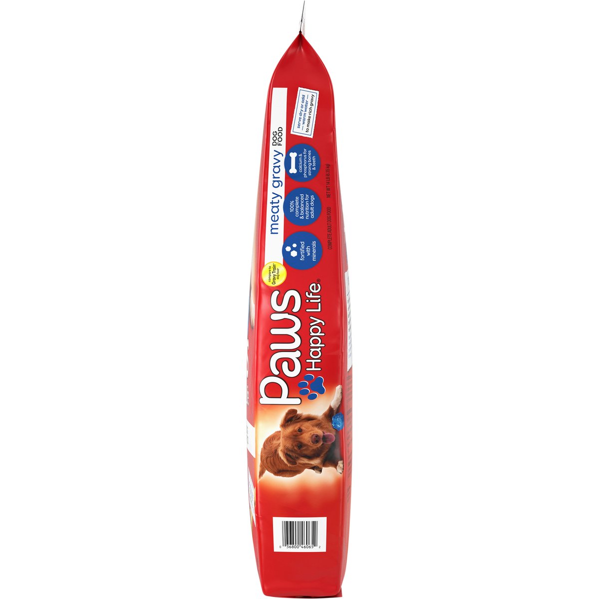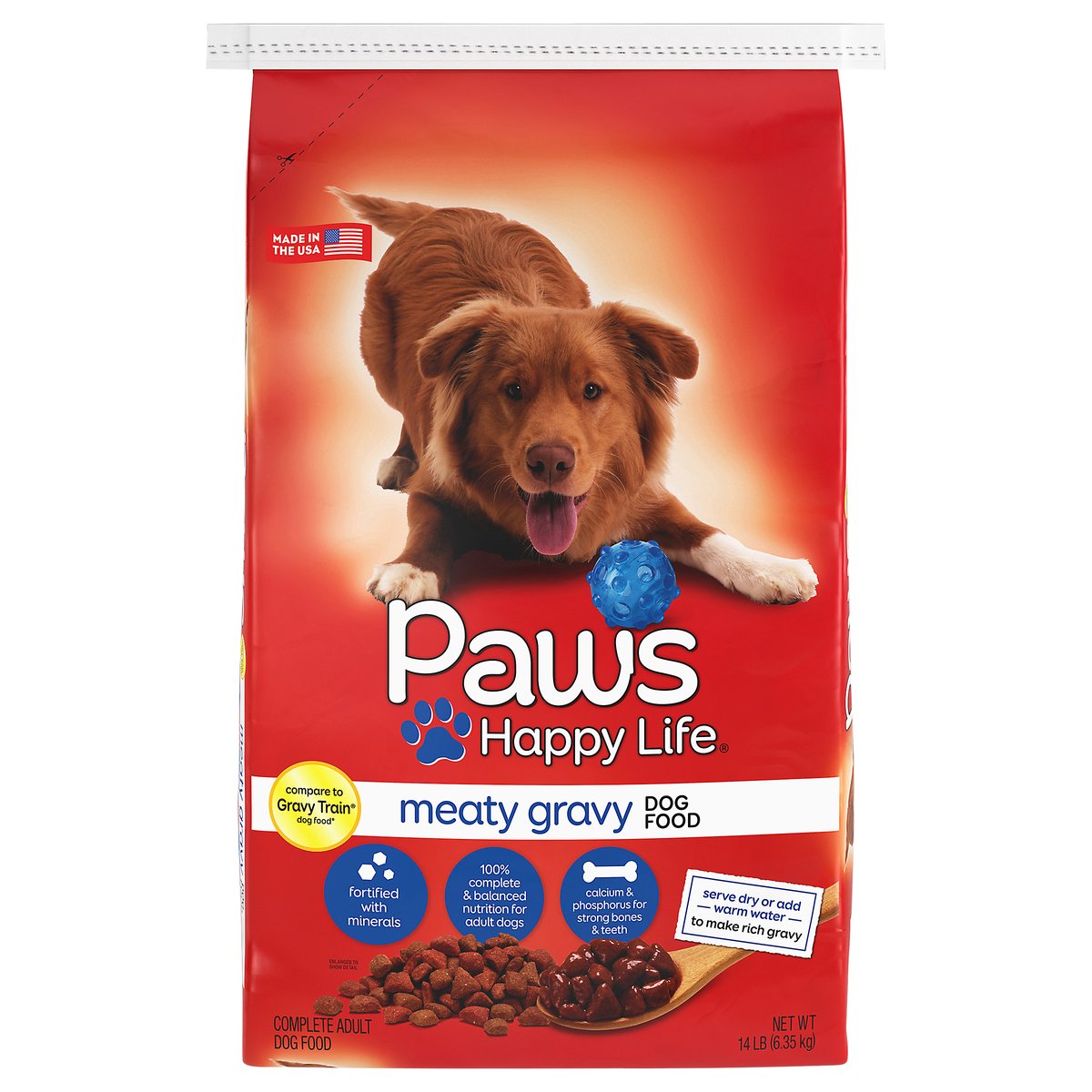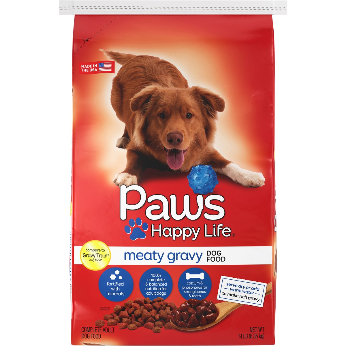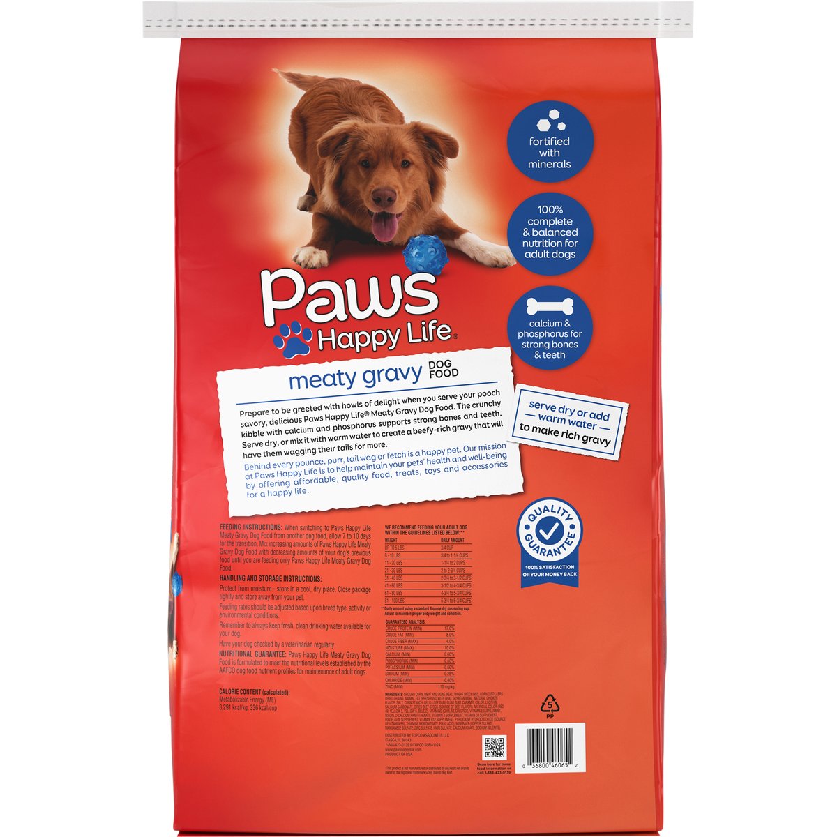 Calorie Content (calculated): Metabolizable Energy (ME) 3,291 kcal/kg; 336 kcal/cup. Nutritional Guarantee: Paws Happy Life Meaty Gravy Dog Food is formulated to meet the nutritional levels established by the AAFCO dog food nutrient profiles for maintenance of adult dogs. 100% complete & balanced nutrition for adult dogs. Compare to Gravy Train dog food*. Fortified with minerals. 100% complete & balanced nutrition for adult dogs. Calcium & phosphorus for strong bones & teeth. Prepare to be greeted with howls of delight when you serve your pooch savory, delicious Paws Happy Life Meaty Gravy Dog Food. The crunchy kibble with calcium and phosphorus gives them stronger bones and teeth. Serve dry, or mix it with warm water to create a beefy-rich gravy that will have them wagging their tails for more. Behind every pounce, purr, tail wag or fetch is a happy pet. Our mission at Paws Happy Life is to help maintain your pets' health and well-being by offering affordable, quality food, treats, toys and accessories for a happy life. *This product is not manufactured or distributed by Big Heart Pet Brands owner of the registered trademark Gravy Train dog food. Quality Guarantee: 100% satisfaction or your money back. www.pawshappylife.com. Scan for more food information or call 1-888-423-0139. 1-888-423-0139. Made in the USA. Product of USA.