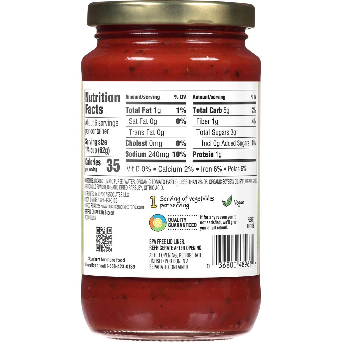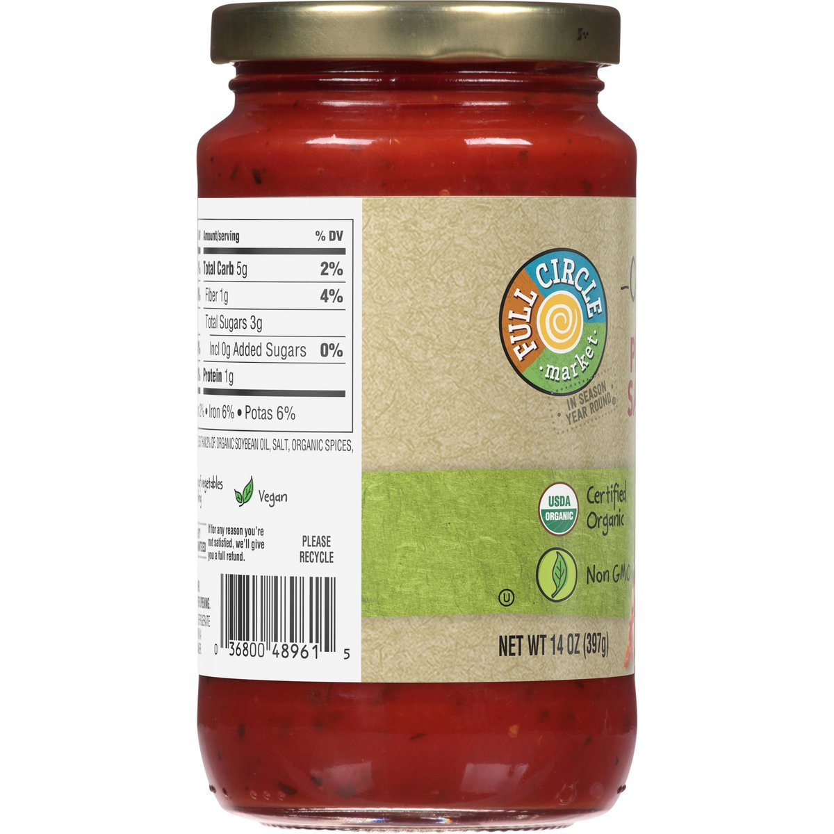 USDA Organic. Certified organic. Certified Organic by Ecocert. Vegan. No sugar added. Non GMO. In season year round. 1 serving of vegetables per serving. Quality Guaranteed: If for any reason you're not satisfied, we'll give you a full refund. www.fullcirclemarketbrand.com. Scan for more food information or call 1-888-423-0139. BPA free lid liner. Please recycle. Packed in USA.
