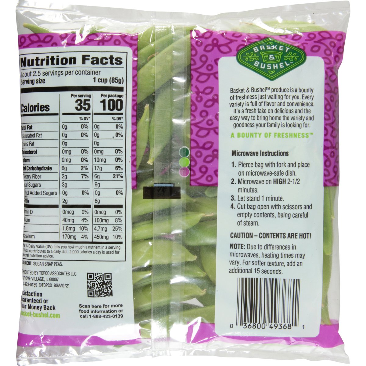 Washed & ready to eat. Microwave in the bag. Basket & Bushel produce is a bounty of freshness just waiting for you. Every variety is full of flavor and convenience. It's a fresh take on delicious and the easy way to bring home the variety and goodness your family is looking for. A bounty of freshness. Satisfaction guarantee or your money back. basket-bushel.com. Scan for more food information or call 1-888-423-0139. Made in USA, Mexico, Guatemala, Peru.