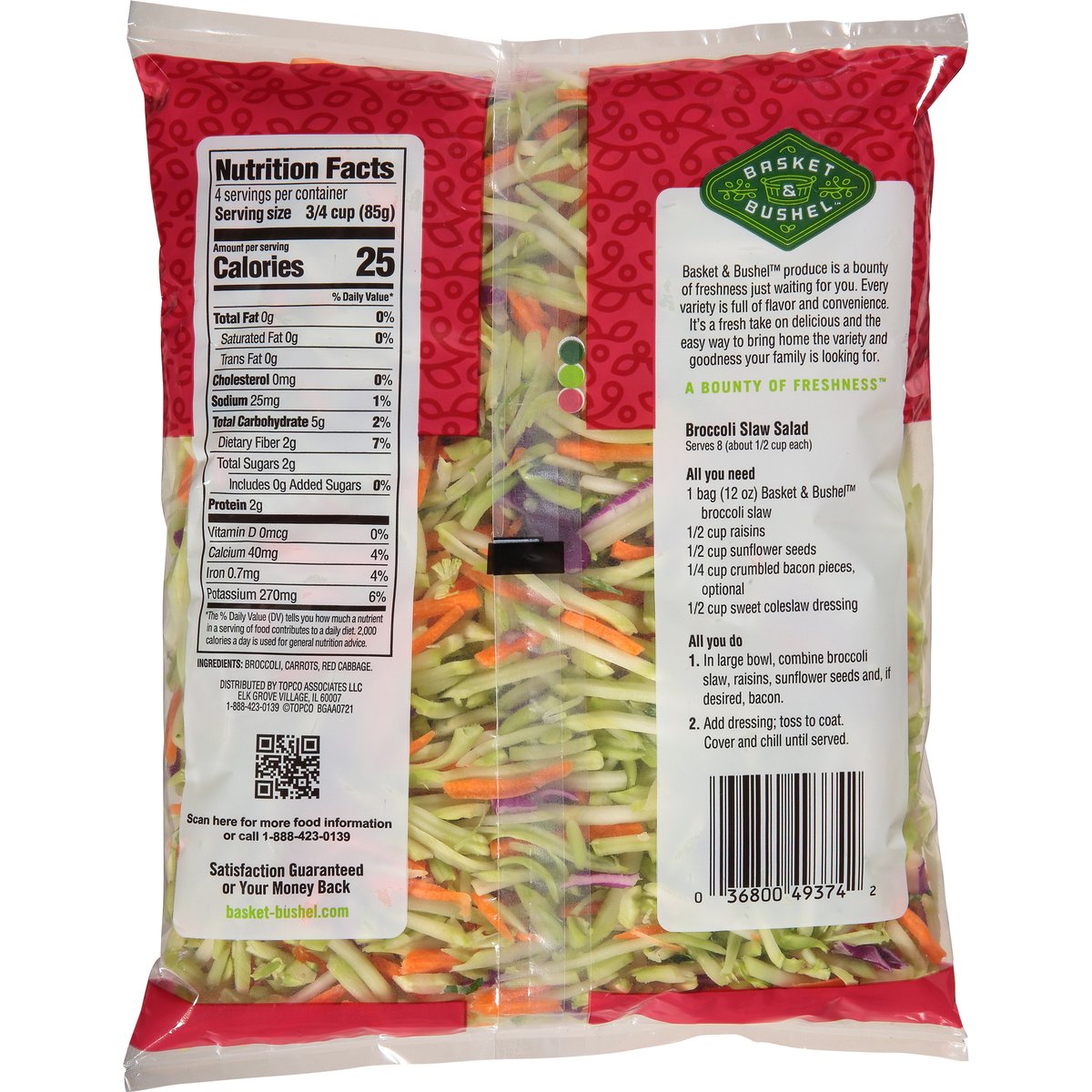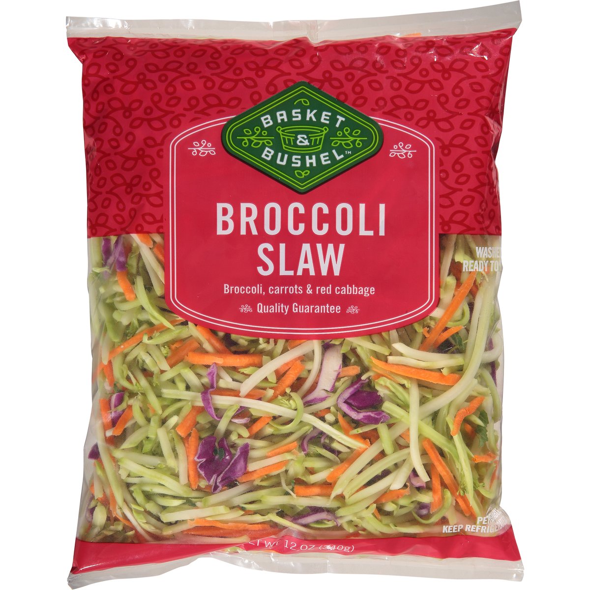 Broccoli, carrots & red cabbage. Washed & ready to eat. Basket & Bushel produce is a bounty of freshness just waiting for you. Every variety is full of flavor and convenience. It's a fresh take on delicious and the easy way to bring home the variety and goodness your family is looking for. A bounty of freshness. Quality guarantee. Satisfaction guaranteed or your money back. basket-bushel.com. Scan for more food information or call 1-888-423-0139.