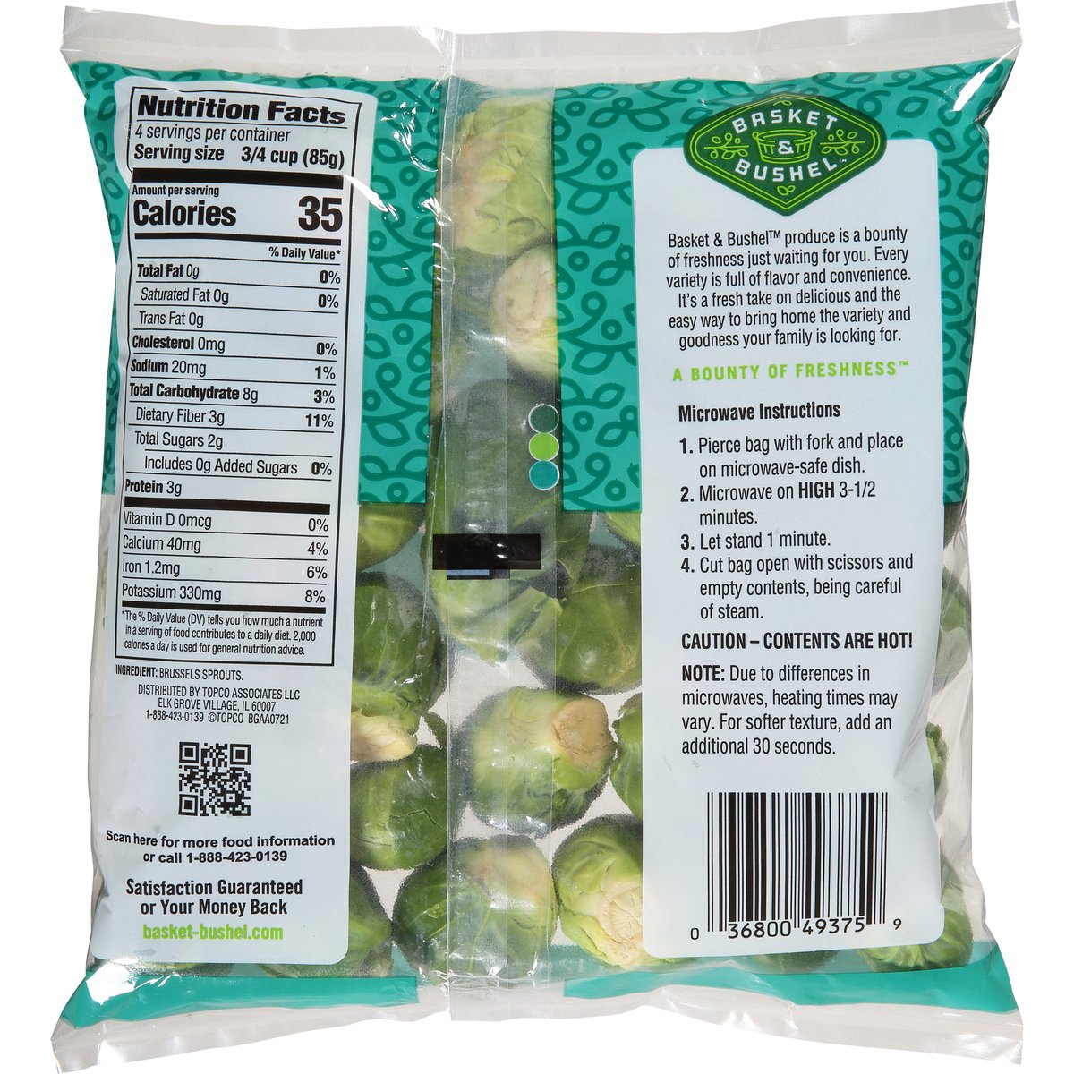 Washed & ready to eat. Microwave in the bag. Basket & Bushel produce is a bounty of freshness just waiting for you. Every variety is full of flavor and convenience. It's a fresh take on delicious and the easy way to bring home the variety and goodness your family is looking for. A bounty of freshness. Quality guarantee. Satisfaction guaranteed or your money back. basket-bushel.com. Scan for more food information or call 1-888-423-0139.