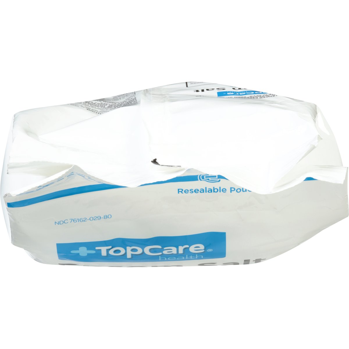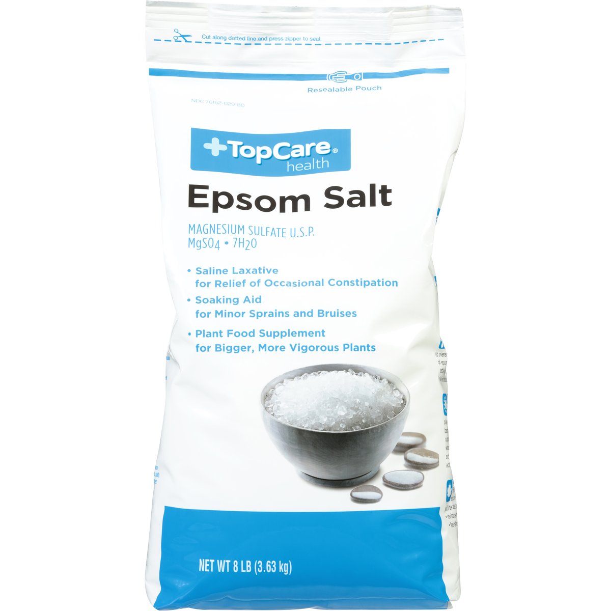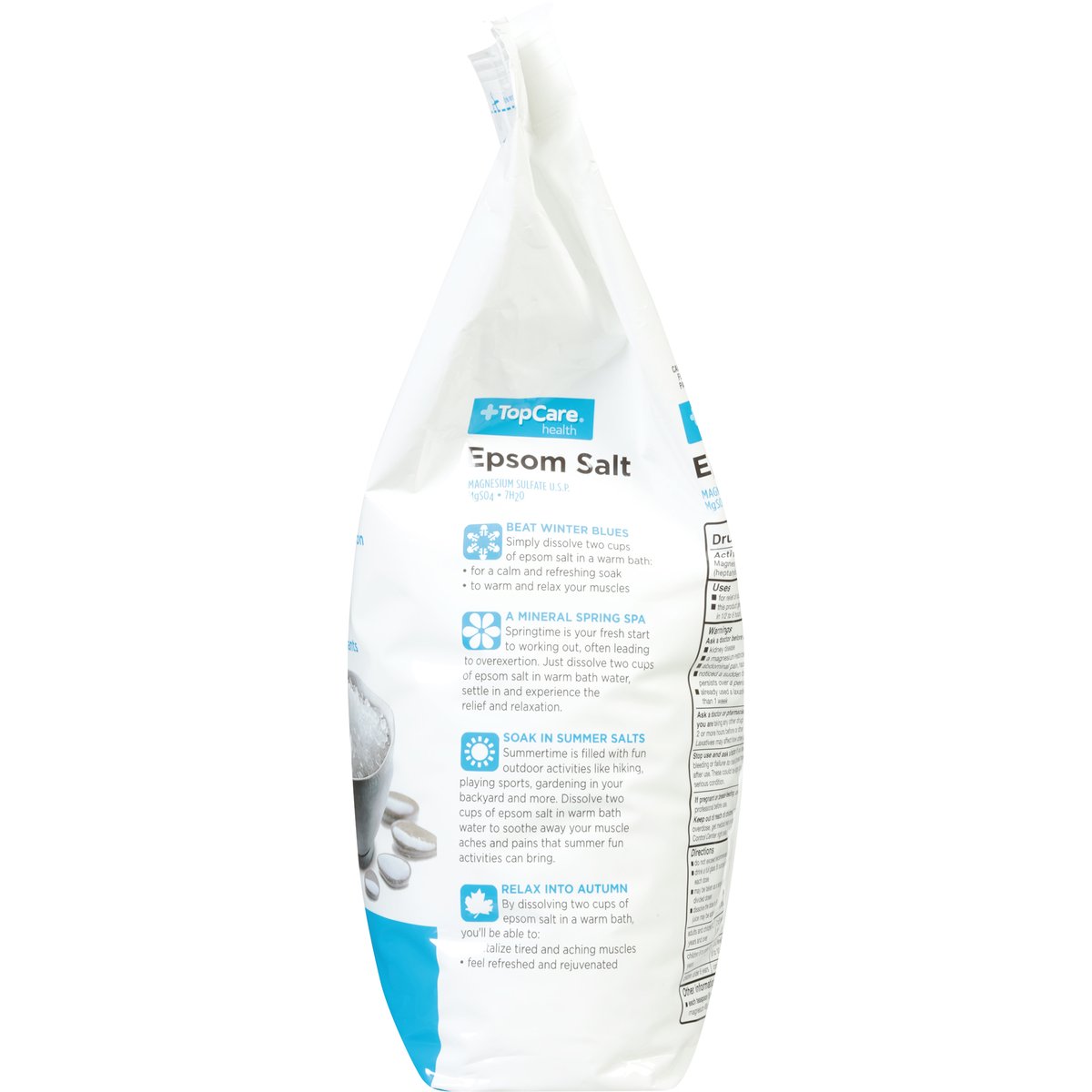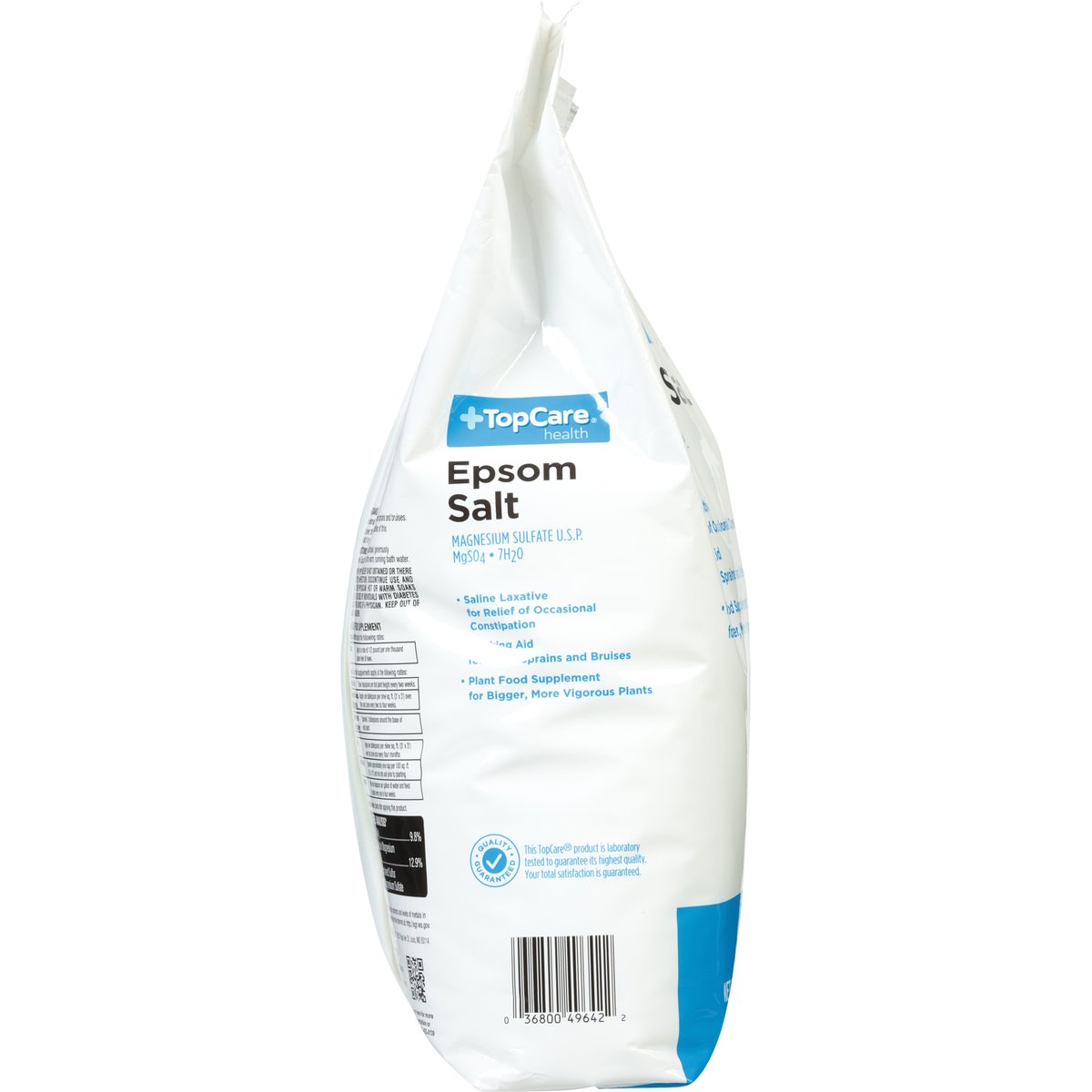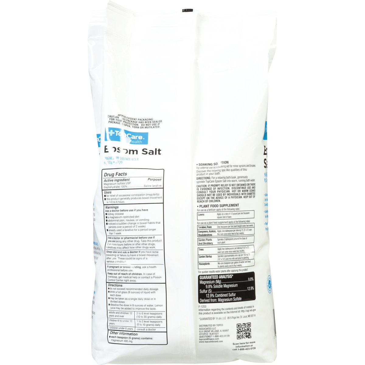 Magnesium sulfate U.S.P. MgS04; 7H20. Guaranteed Analysis (Guaranteed by: Vi-Jon, Inc., 8515 Page Ave., St Louis, MO 63114): Magnesium (Mg) 9.8% (9.8% Soluble Magnesium), Sulfur (S) 12.9% (12.9% Combine Sulfur Derived from: Magnesium Sulfate). Saline laxative for relief of occasional constipation. Soaking aid for minor sprains and bruises. Plant food supplement for bigger, more vigorous plants. Soaking Solution: For external use as a soaking aid for minor sprains and bruises discover the relaxing spa like qualities of his product in your bath. Plant food supplement: For use as a fertilizer apply at the following rates: Lawns: Apply at a rate of 1/2 pound per one thousand square feet of lawn. For use as a plant food supplement apply at the following rates: Tomatoes, Roses: One teaspoon per foot plant height every two weeks. Evergreens, Azaleas, Rhododendrons: Apply one tablespoon per nine sq. ft (3 inch x 3 inch) over the root zone every two to four weeks. Garden Plants and Shrubbery: Sprinkle 2 tablespoons around the base of each plant. Trees: Apply two tablespoons per nine sq. ft (3 inch x 3 inch ) over root zone once every four months. Garden Startup: Sprinkle approximately one cup per 100 sq. ft. (10 inch x 10 inch) and mix into soil prior to planting. Houseplants: Mix one teaspoon per gallon of water and feed to plants every one to four weeks. For quicker results water plants after applying this product. Beat winter blues: simply dissolve two cups of Epsom salt in a warm bath: for a calm and refreshing soak. To warm and relax your muscles. A mineral spring spa: springtime is your fresh start to working out, often leading to overexertion. Just dissolve two cups of Epsom salt in warm bath water, settle in and experience the relief and relaxation. Soak in summer salts: Summertime is filled with fun outdoor activities like hiking, playing sports, gardening in your backyard and more. Dissolve two cups of Epsom salt in warm bath water to soothe away your muscle aches and pains that summer fun activities can bring. Relax into autumn: by dissolving two cups of Epsom salt in a warm bath, you'll be able to: revitalize tired and aching muscles. Feel refreshed and rejuvenated. Quality Guaranteed: This TopCare product is laboratory tested to guarantee its highest quality. Your total satisfaction is guaranteed. www.topcarebrand.com. Scan for more information or call 1-888-423-0139. Information regarding the contents and levels of metals in this product is available on the Internet at: http://agr.wa.gov. Questions? 1-888-423-0139. topcare(at)topco.com. www.topcarebrand.com. Resealable pouch.