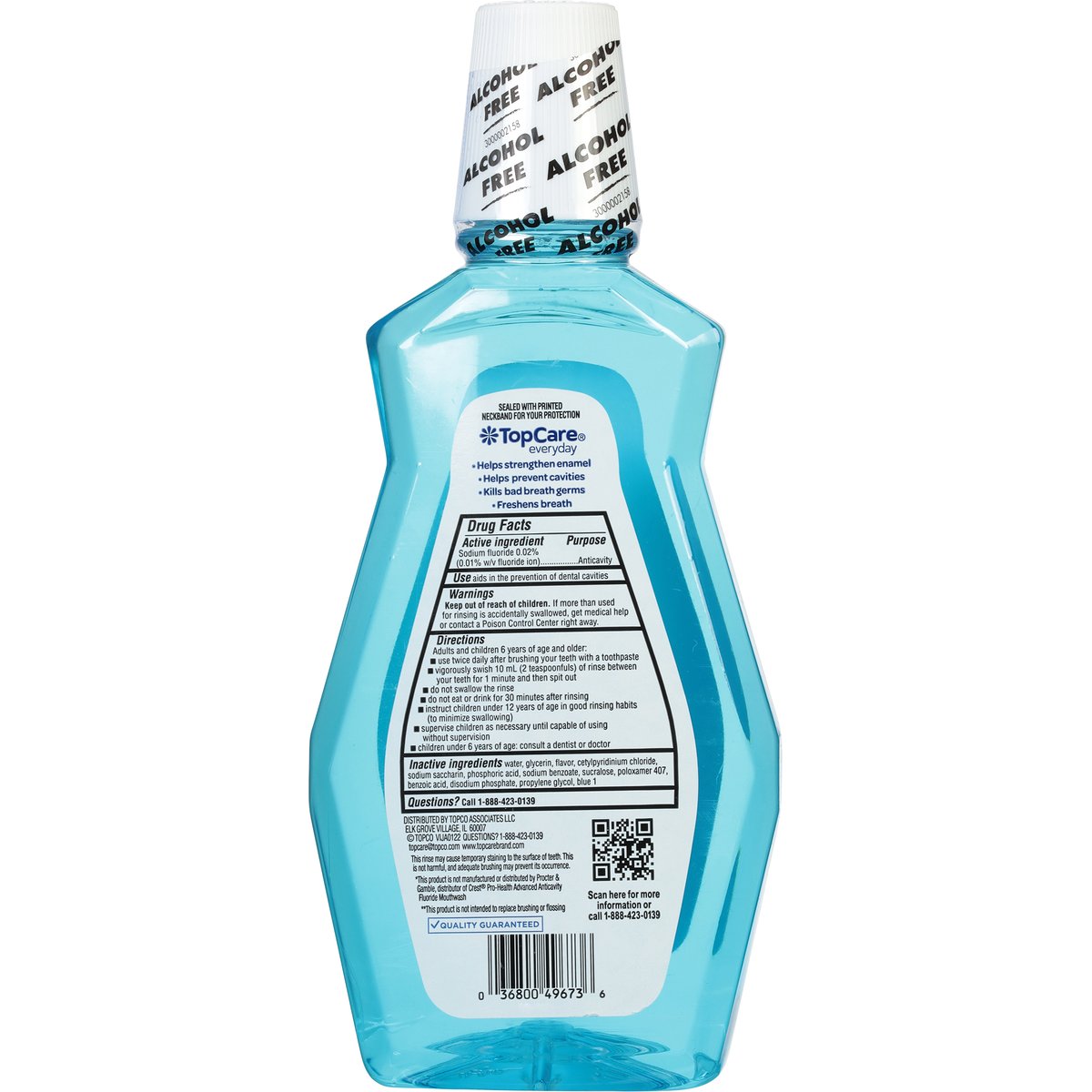 Compare to Crest Pro-Health Advanced Anticavity Fluoride Mouthwash (This product is not manufactured or distributed by Procter & Gamble, distributor of Crest Pro-Health Advanced Anticavity Fluoride Mouthwash). Helps strengthen enamel. Helps prevent cavities. Cleans teeth (This product is not intended to replace brushing or flossing). Kills bad breath germs. Freshens breath. Helps keep mouth feeling clean. This rinse may cause temporary staining to the surface of teeth. This is not harmful, and adequate brushing may prevent its occurrence. Quality guaranteed. www.topcarebrand.com. Scan for more information or call 1-888-423-0139. Questions? Call 1-888-423-0139. Questions? 1-888-423-0139. topcare(at)topco.com. www.topcarebrand.com.