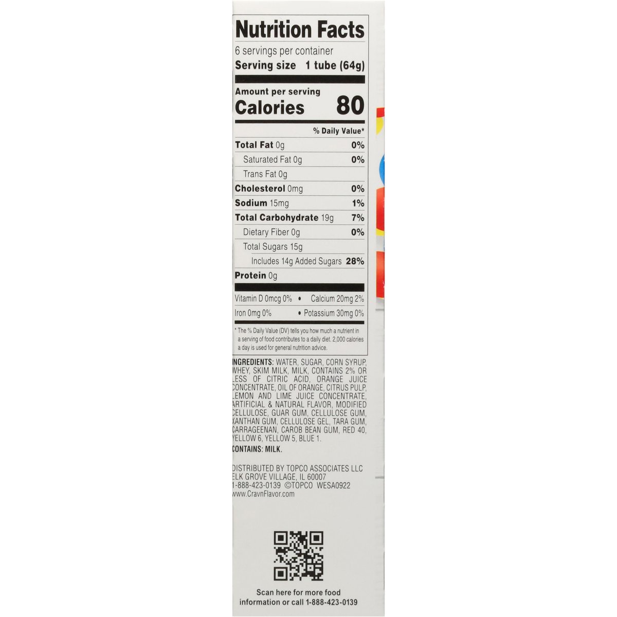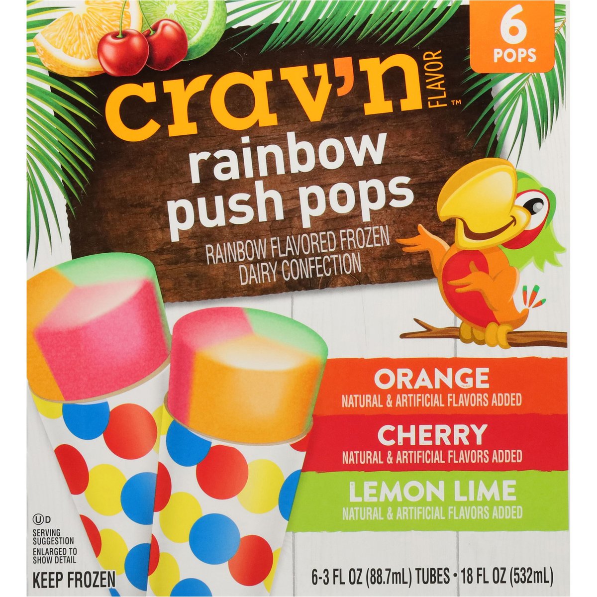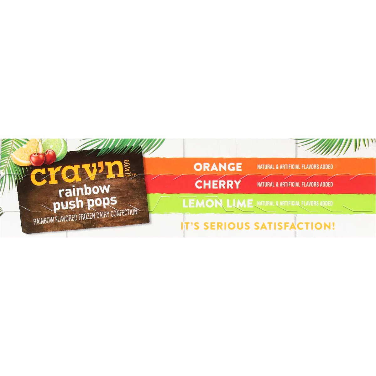 Orange. Cherry. Lemon lime. Rainbow flavored frozen dairy confection. Orange: Natural & artificial flavors added. Cherry: Natural & artificial flavors added. Lemon Lime: Natural & artificial flavors added. It's serious satisfaction! Quality Guaranteed: If for any reason you are not satisfied, we'll give you a full refund. www.CravnFlavor.com. Scan for more food information or call 1-888-423-0139. 1-888-423-0139. Please recycle.
