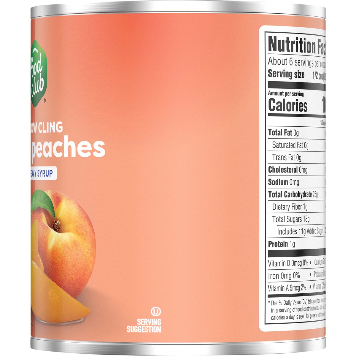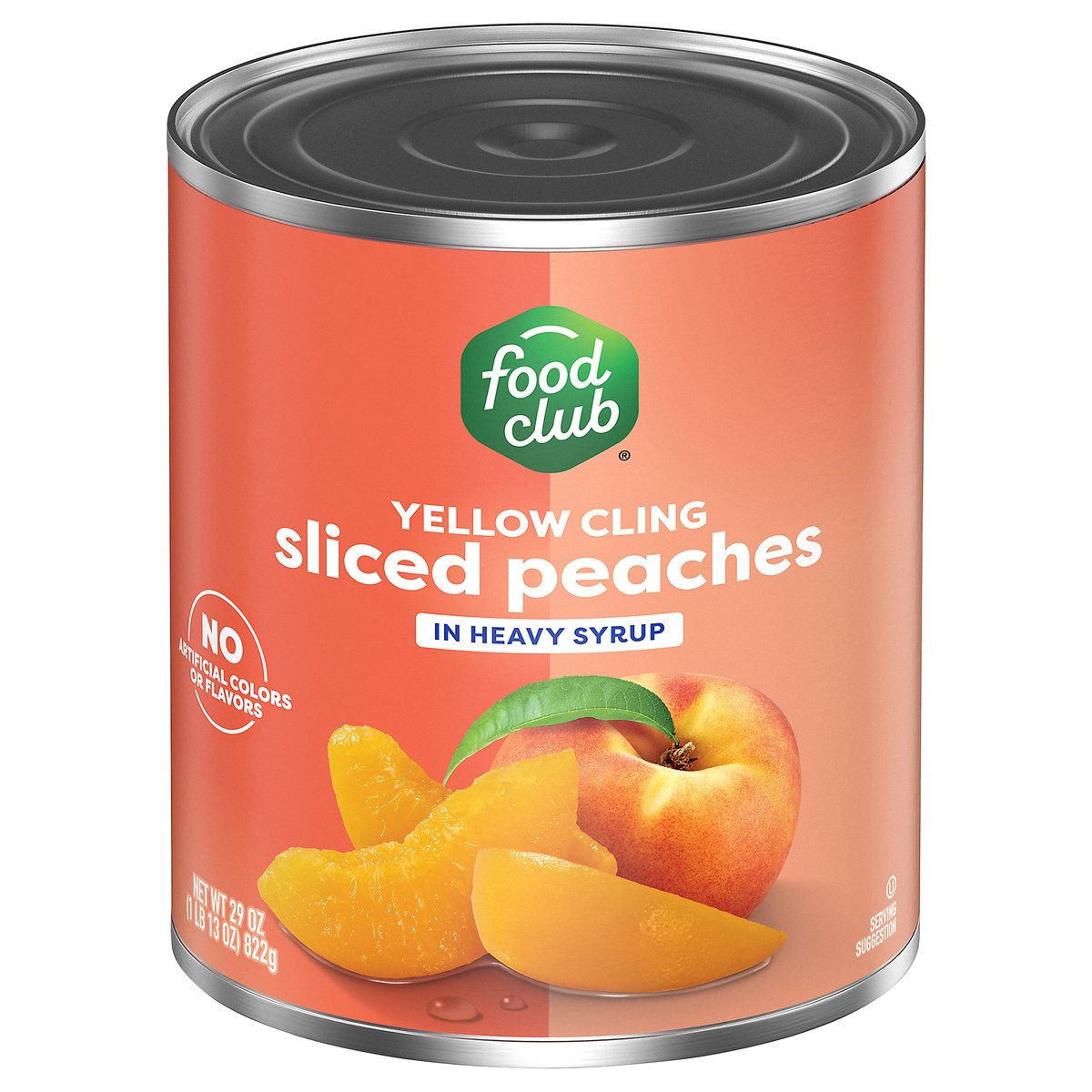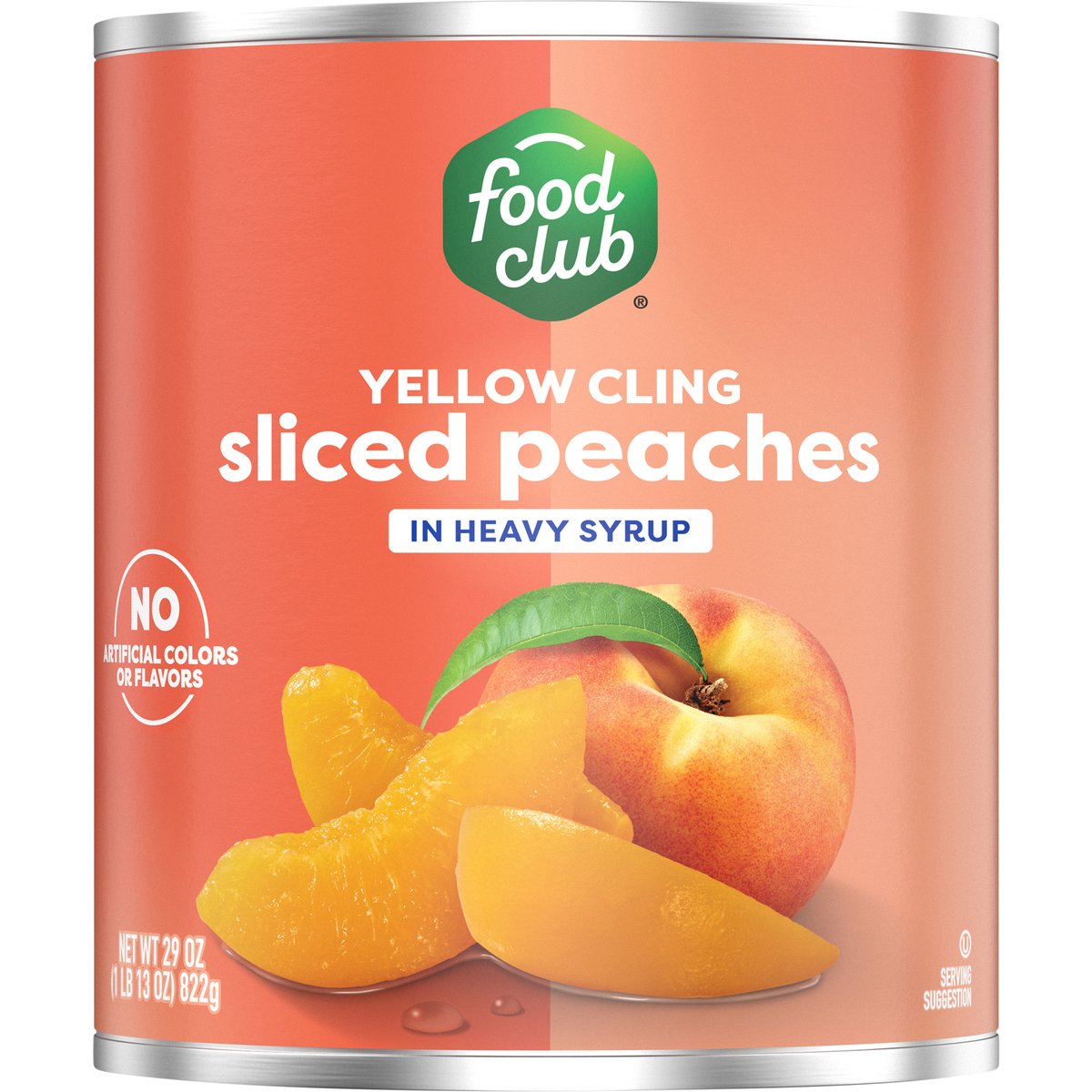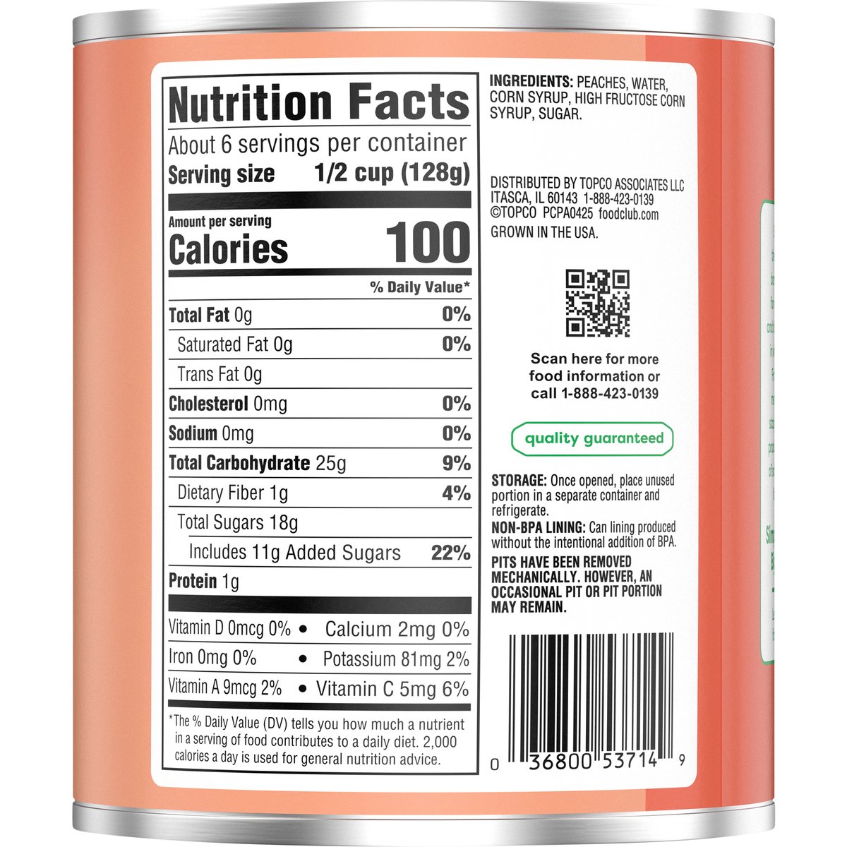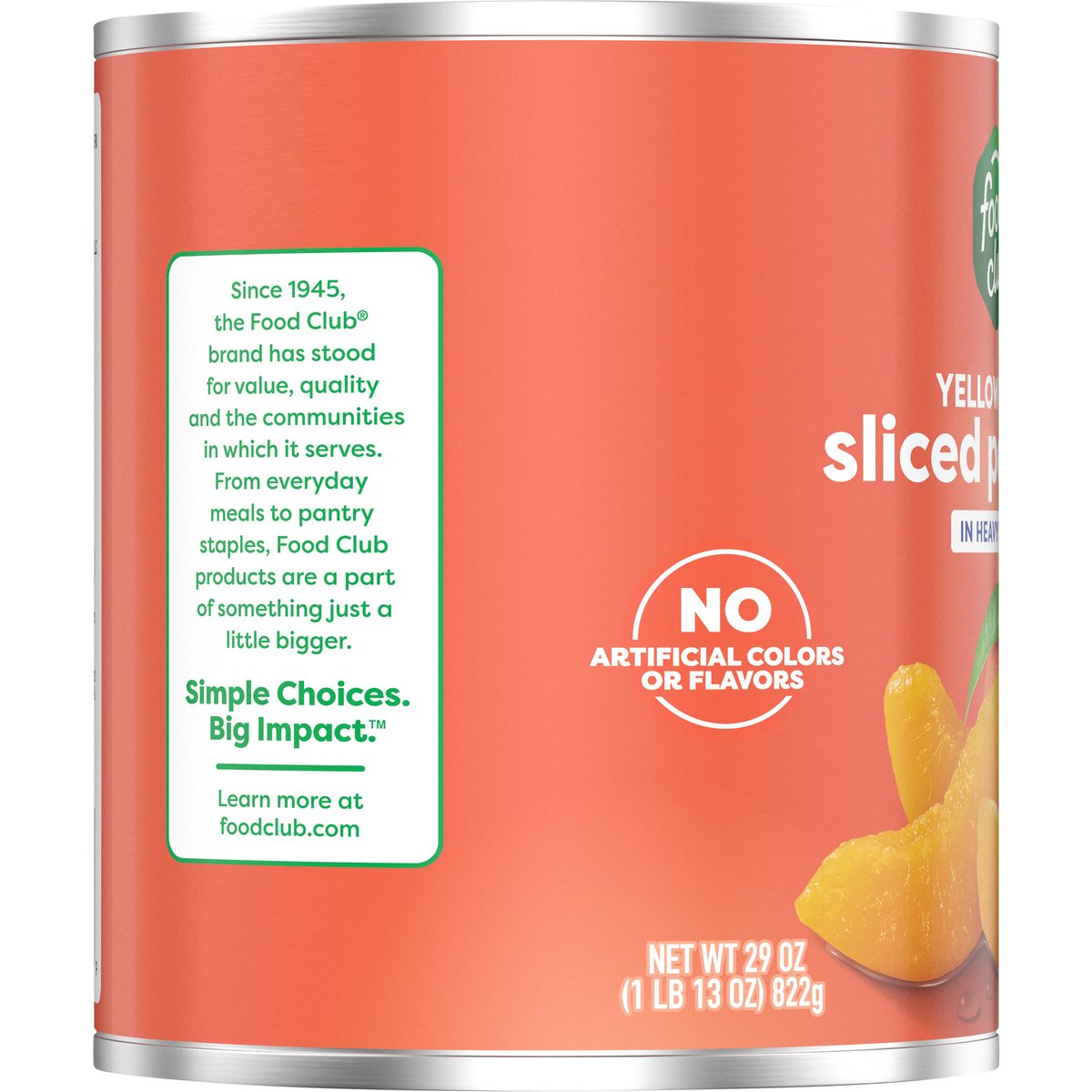 Sliced peaches in heavy syrup. No artificial colors or flavors. Since 1945, the Food Club brand has stood for value, quality and the communities in which it serves. From everyday meals to pantry staples, Food Club products are a part of something just a little bigger. Simple Choices. Big Impact. Quality guaranteed. foodclub.com. Scan for more food information or call 1-888-423-0139. Learn more at foodclub.com. Non-BPA Lining: Can lining produced without the intentional addition of BPA. Grown in the USA.