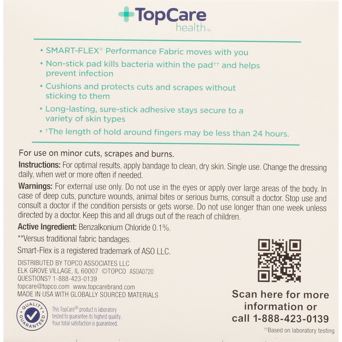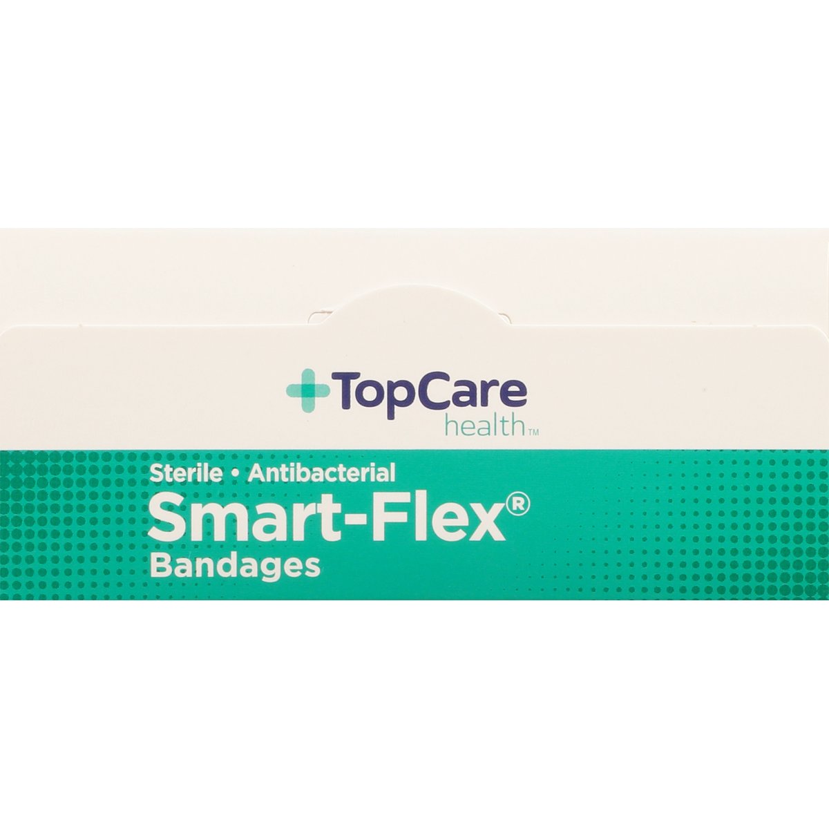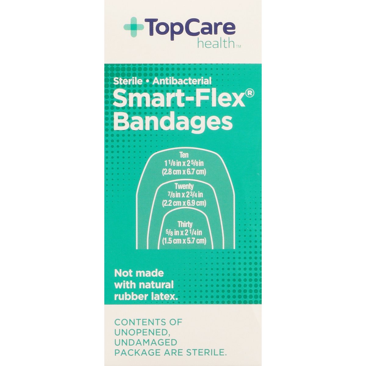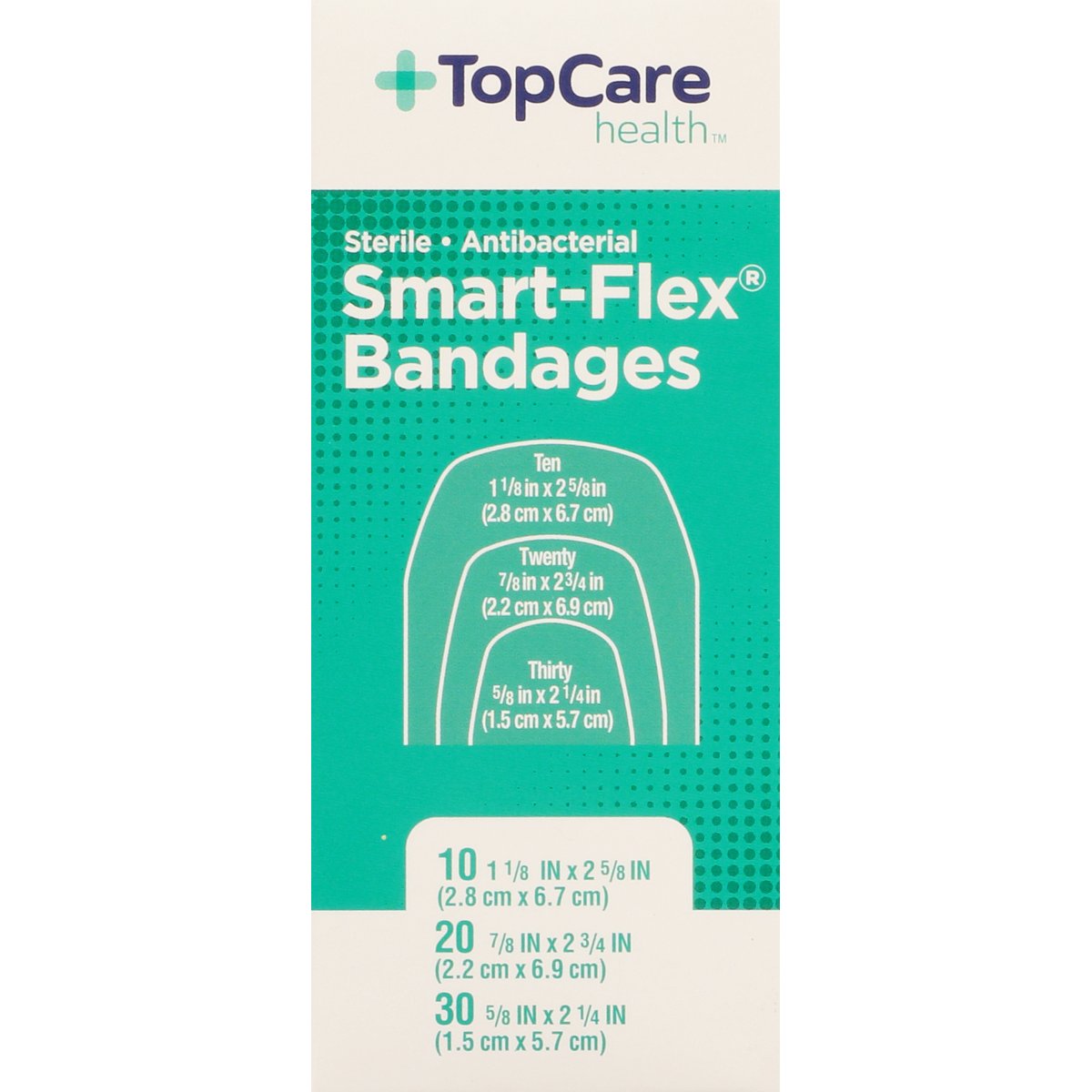 10 - 1-1/8 in x 2-5/8 in (2.8 cm x 6.7 cm). 20 - 7/8 in x 2-3/4 in (2.2 cm x 6.9 cm). 30 - 5/8 in x 2-1/4 in (1.5 cm x 5.7 cm). First aid antiseptic. Sterile. Antibacterial. Smart-Flex Technology: Helps prevent infection. 8x more flexible (Versus traditional fabric bandages). Stays in place when wet. 30% thinner for dry feel comfort (Versus traditional fabric bandages). Stays on 24 hours (The length of hold around fingers may be less than 24 hours). Compare to Band-Aid Skin Flex (This product is not manufactured or distributed by Johnson & Johnson, owners of the trademark, Band-Aid. Compare to Band-Aid in overall performance and quality. Band-Aid does not contain benzalkonium chloride). Smart-Flex performance fabric moves with you. Non-stick pad kills bacteria within the pad (Based on laboratory testing) and helps prevent infection. Cushions and protects cuts and scrapes without sticking to them. Long-lasting, sure-stick adhesive stays secure to a variety of skin types. For use on minor cuts, scrapes and burns. Not made with natural rubber latex. Contents of unopened, undamaged are sterile. Quality Guaranteed: This TopCare product is laboratory tested to guarantee its highest quality. Your total satisfaction is guaranteed. www.topcarebrand.com. Scan for more information or call 1-888-423-0139. Questions? 1-888-423-0139. topcare(at)topco.com. www.topcarebrand.com. Made in USA with globally sourced materials.