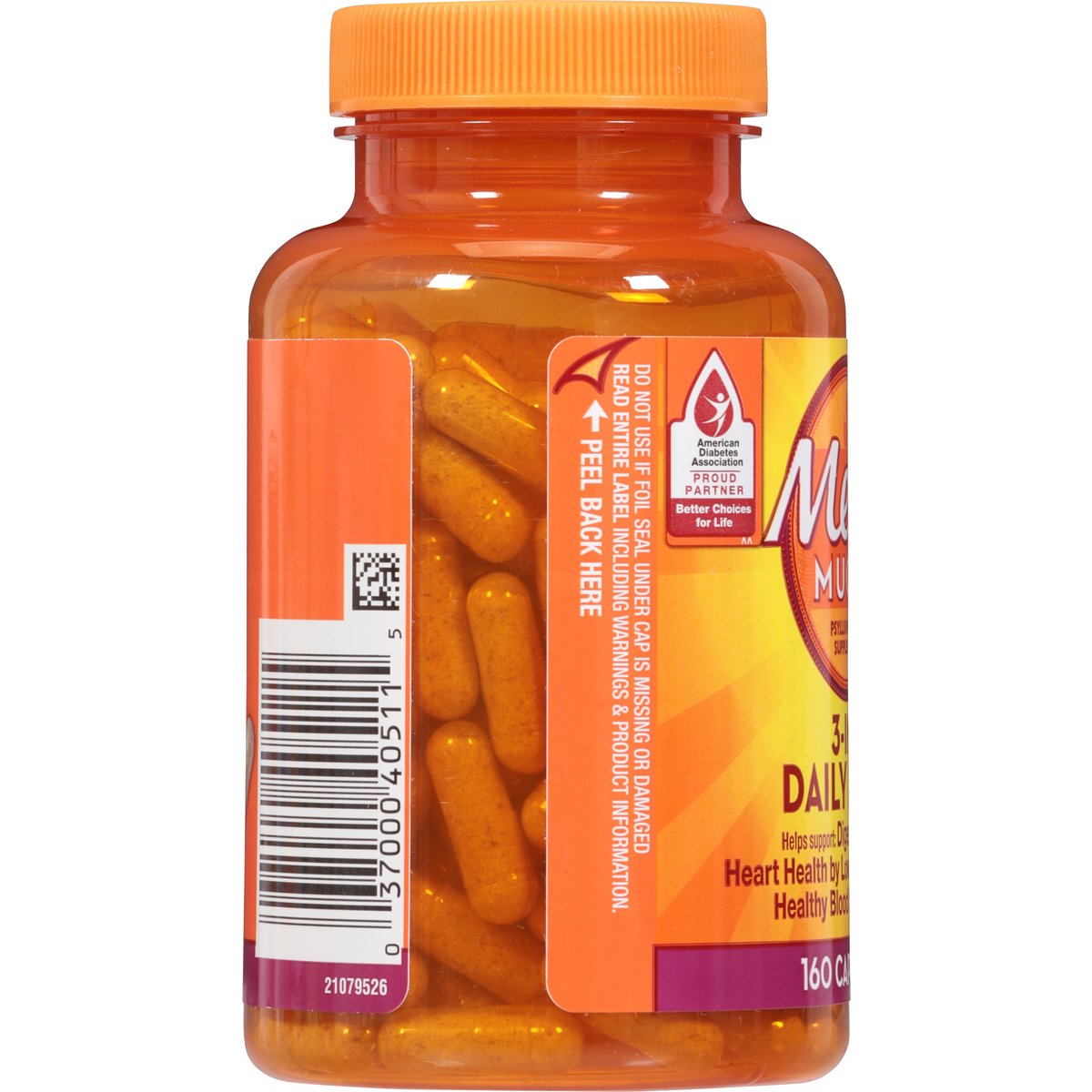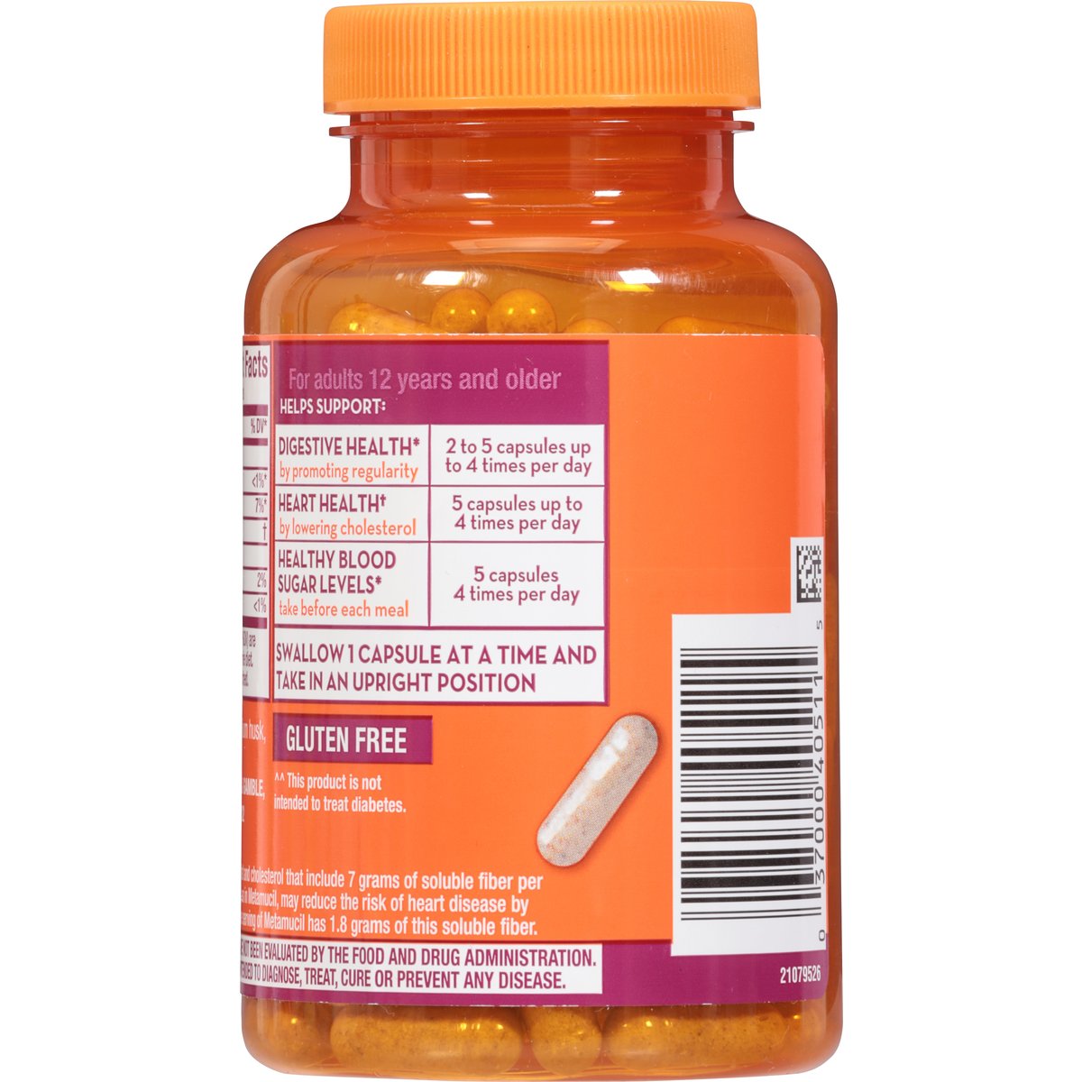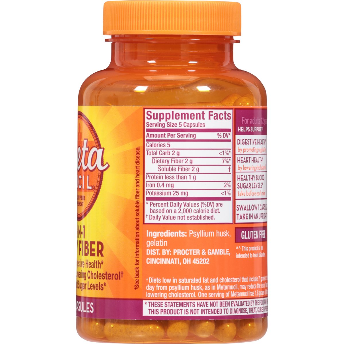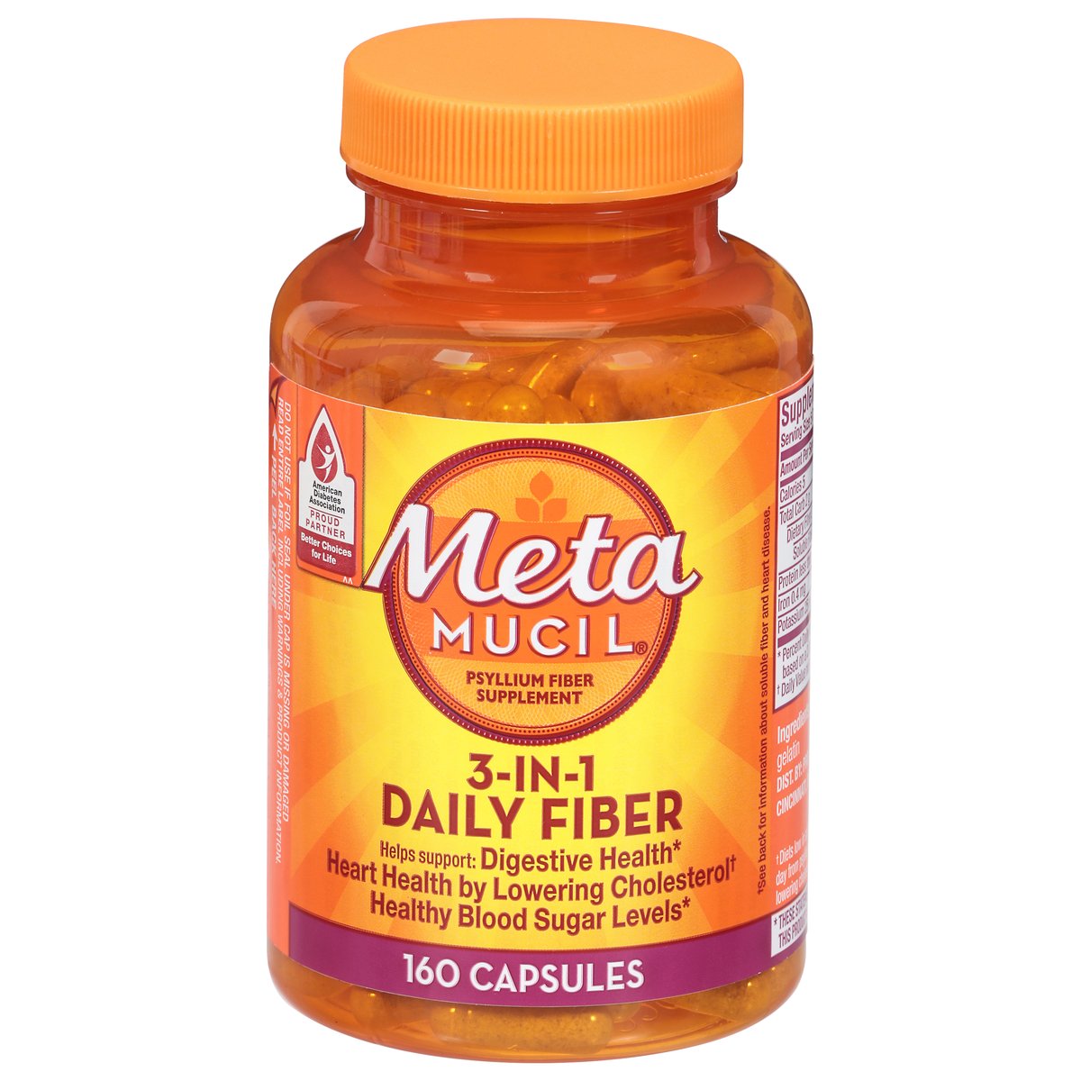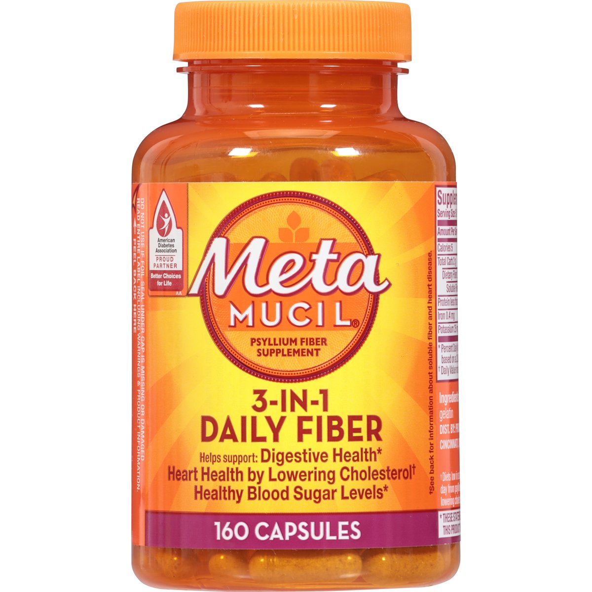Psyllium Fiber Supplement. Gluten free. Hearth health by lowering cholesterol(1). (1)See back for information about soluble fiber and heart disease. (1)Diets low in saturated fat and cholesterol that include 7 grams of soluble fiber per day from psyllium husk, as in Metamucil, may reduce the risk of heart disease by lowering cholesterol. One serving of Metamucil has 1.8 grams of this soluble fiber. Helps Support: Digestive health*. Heart healthy by lowering cholesterol(1). Healthy blood sugar levels. Bulk-forming fibers like psyllium husk may affect how well medicines work. American Diabetes Association: Proud partner. Better choices for life(2). (2)This product is not intended to treat diabetes. www.pg.com. www.metamucil.com. Questions? 1-800-983-4237. *These statements have not been evaluated by the Food and Drug Administration. This product is not intended to diagnose, treat, cure or prevent any disease.