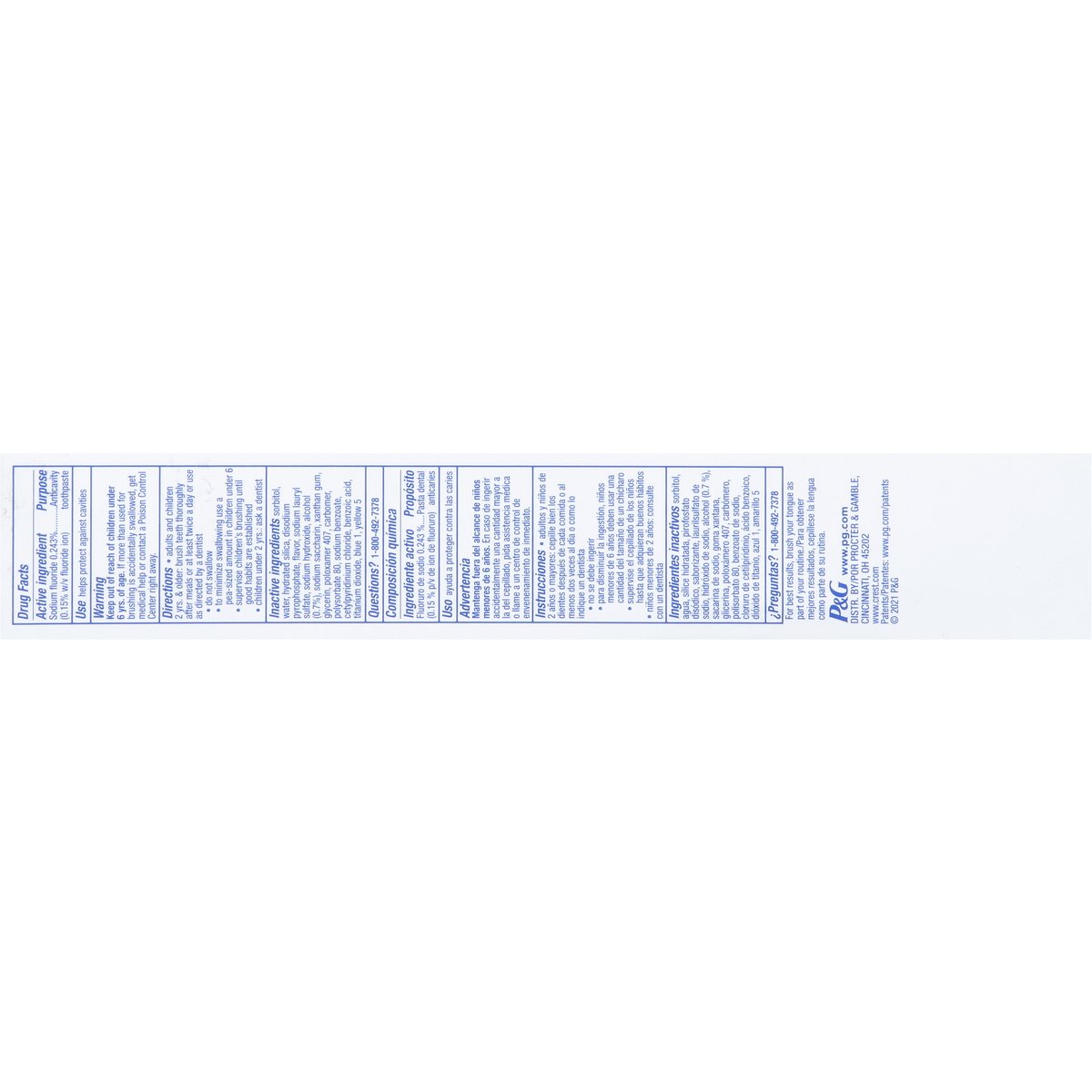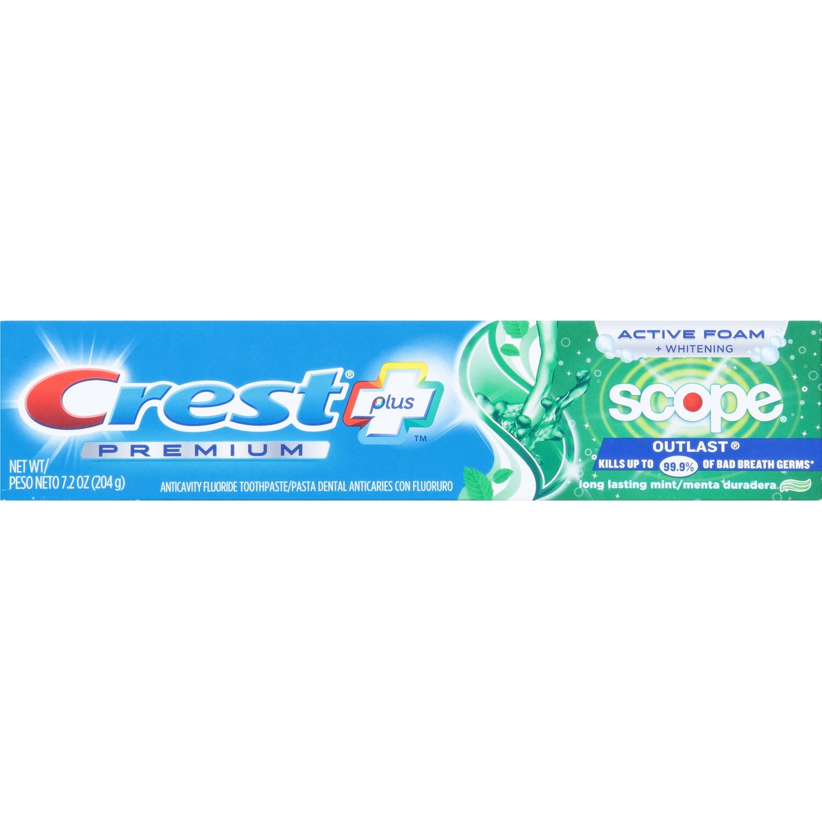 Anticavity fluoride toothpaste. Active foam + whitening. Outlast. Kills up to 99.9% of bad breath germs (in laboratory tests). Active Foam Cleaning: Fights cavities; Removes surface stains; Fights tartar plus Scope Freshness: Lasting freshness of Scope Outlast. www.pg.com. www.crest.com. Questions? 1-800-492-7378.