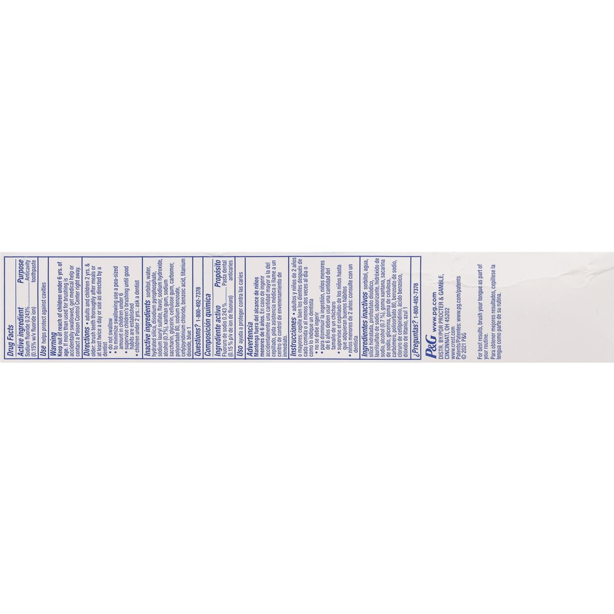 Anticavity fluoride toothpaste. Gluten free. DualBlast. Blasts away up to 99.9% of bad breath germs (In laboratory tests). Some toothpastes stop working after you brush. Upgrade to crest pro-health. Protects for 12 hours (Helps prevent plaque bacteria that can cause gingivitis; among stannous fluoride toothpastes vs sodium fluoride). Fights cavities & removes surfaces stains + Freshens breath with the power of scope. www.pg.com. www.crest.com. Questions? 1-800-492-7378. Use together for fresher breath & a healthier mouth. Better together! Use with Oral-B IO rechargeable brush + Use with Crest Pro-Health Mouthwash + Use with Oral-B Glide Floss. Recycle ready. Learn about recycling options at crest.com/recycling.