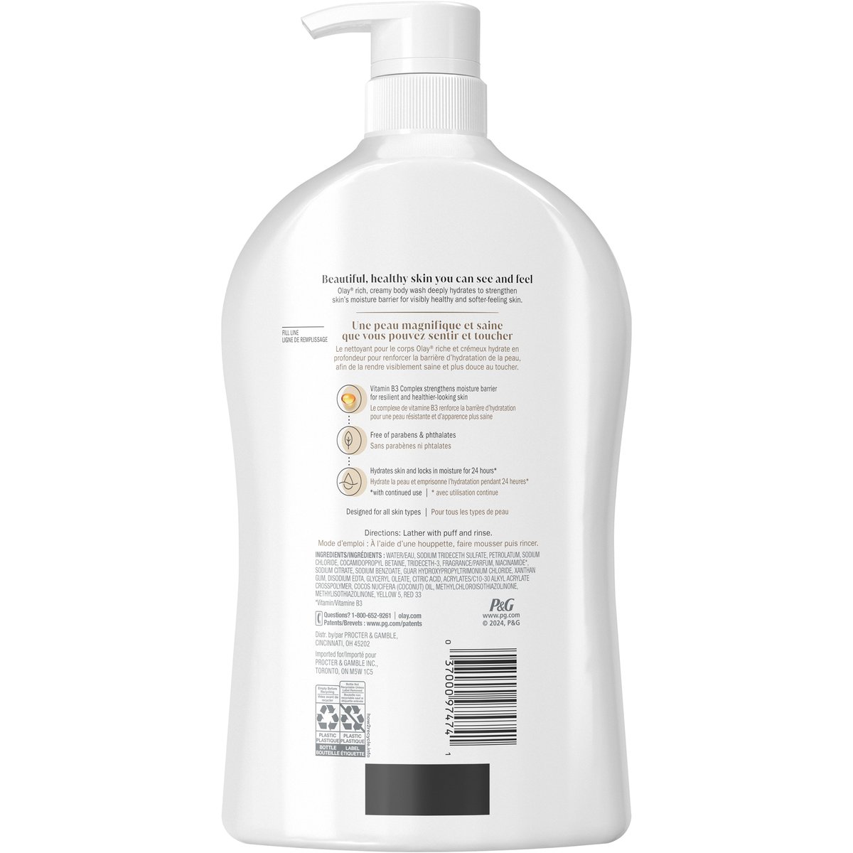 35% more (vs. Olay 22 oz Body Wash). Beautiful, healthy skin you can see and feel. Olay's proprietary skin care formula, made with Vitamin B3 complex, hydrates to plump surface skin cells, locking in natural moisture. Immerse yourself in pampering moisture. Our advanced formula, with Coconut Oil and Olay moisturizers, indulges skin to leave it spa-soft and touchably smooth. B3 Complex. olay.com. www.pg.com Questions? 1-800-652-9261. www.olay.com.