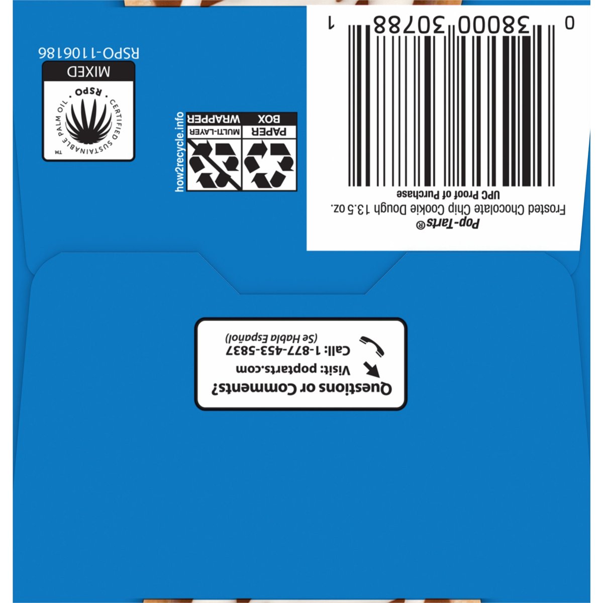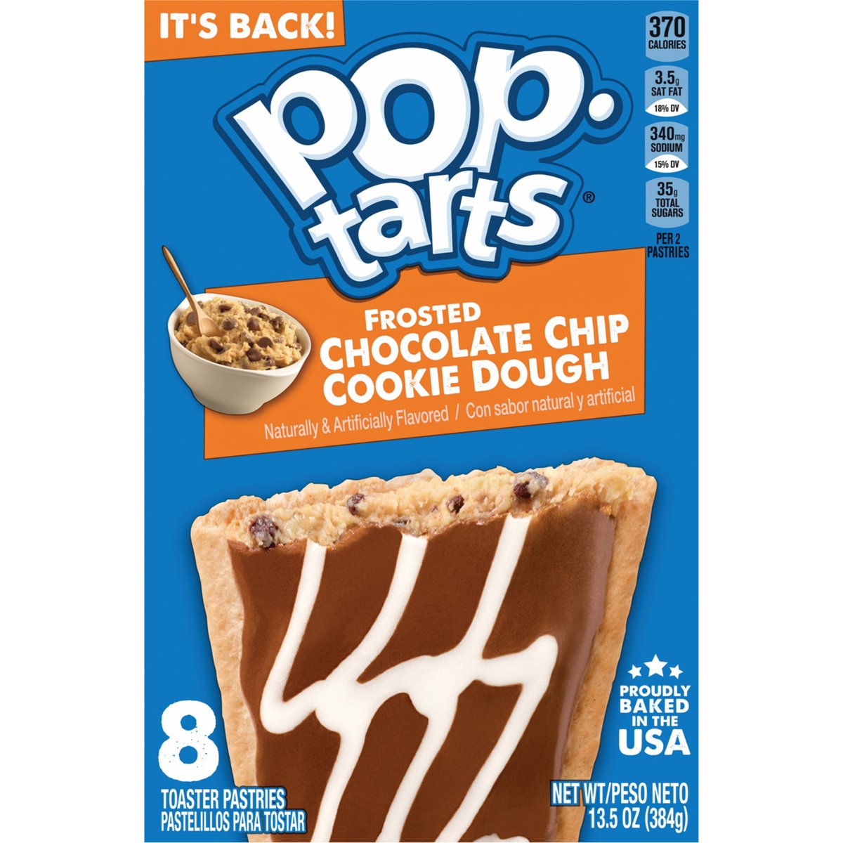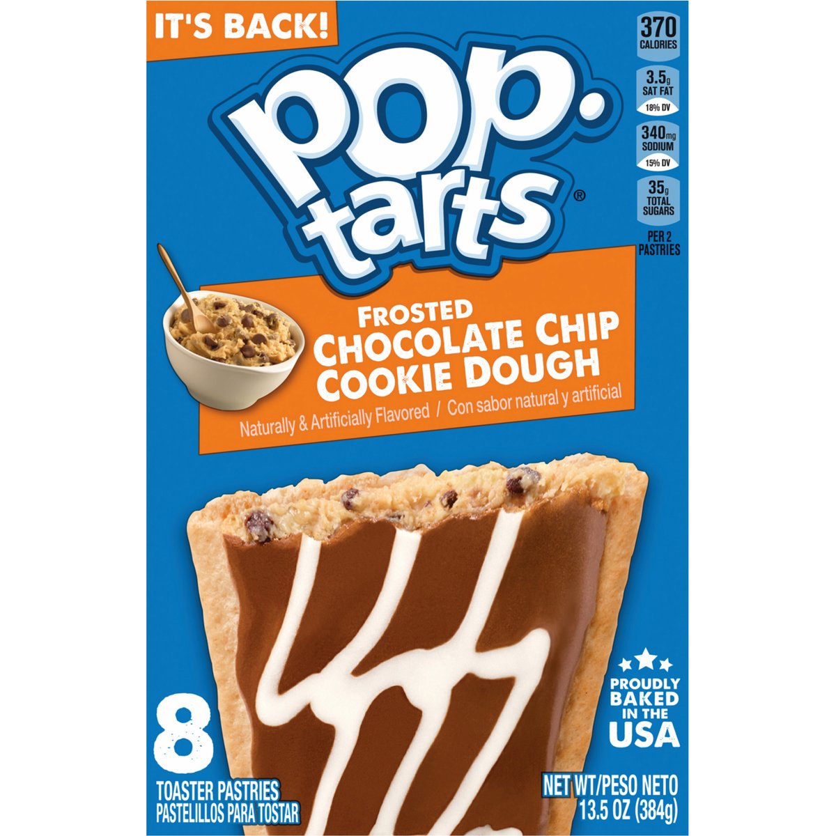 Naturally & artificially flavored. Per 2 Pastries: 370 calories; 3.5 g sat fat (18% DV); 340 mg sodium (15% DV); 35 g total sugars. Good source of 3 B vitamins. Contains a bioengineered food ingredient. It's back! Some people never toast'em (unless you count freezer burn). Fully baked & ready to eat! Or heat. Or freeze. Or stack. poptarts.com. how2recycle.info. Visit us at poptarts.com. Questions or comments? Visit: poptarts.com. Call: 1-877-453-5837. K Vets & Supporters: Supporting veteran recruitment at Kellanova. RSPO: Certified sustainable palm oil. Mixed. Proudly baked in the USA.