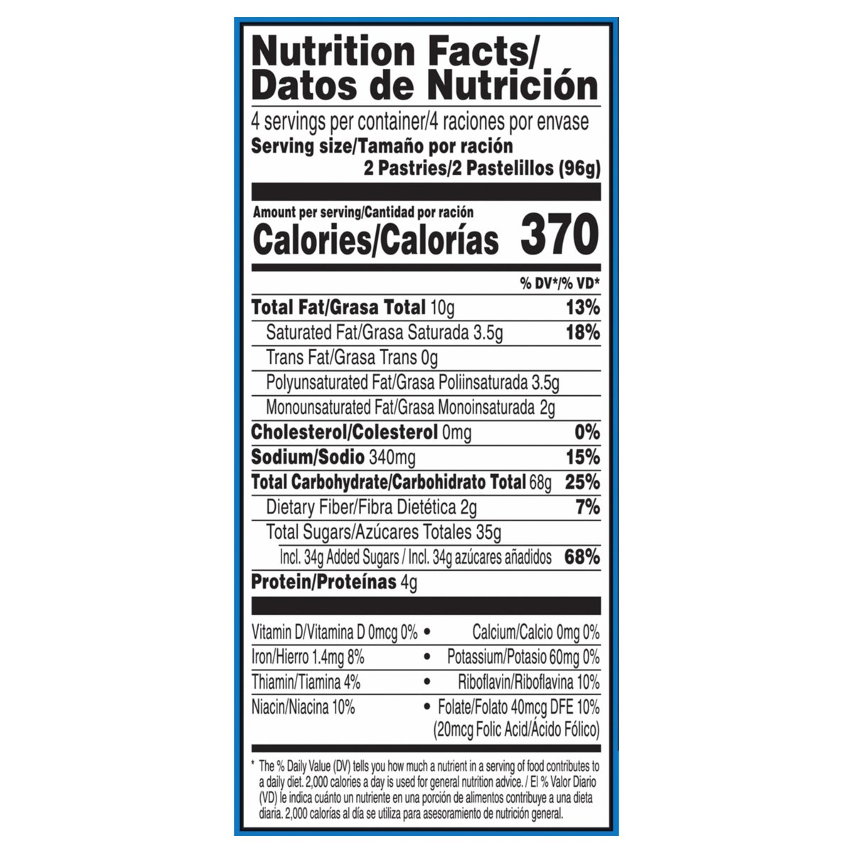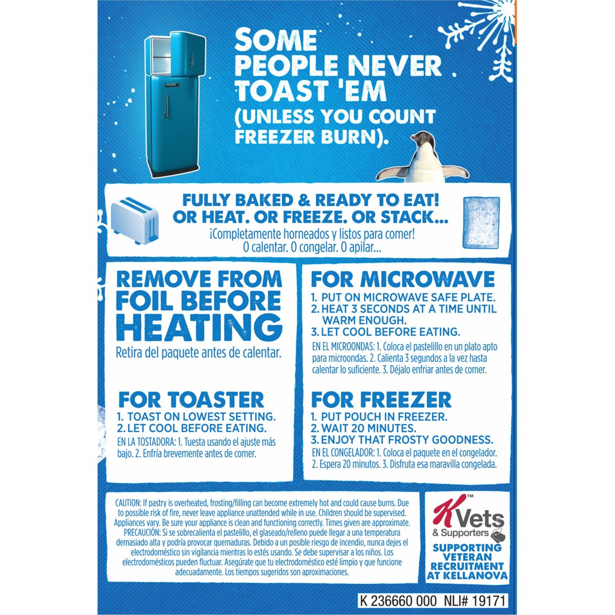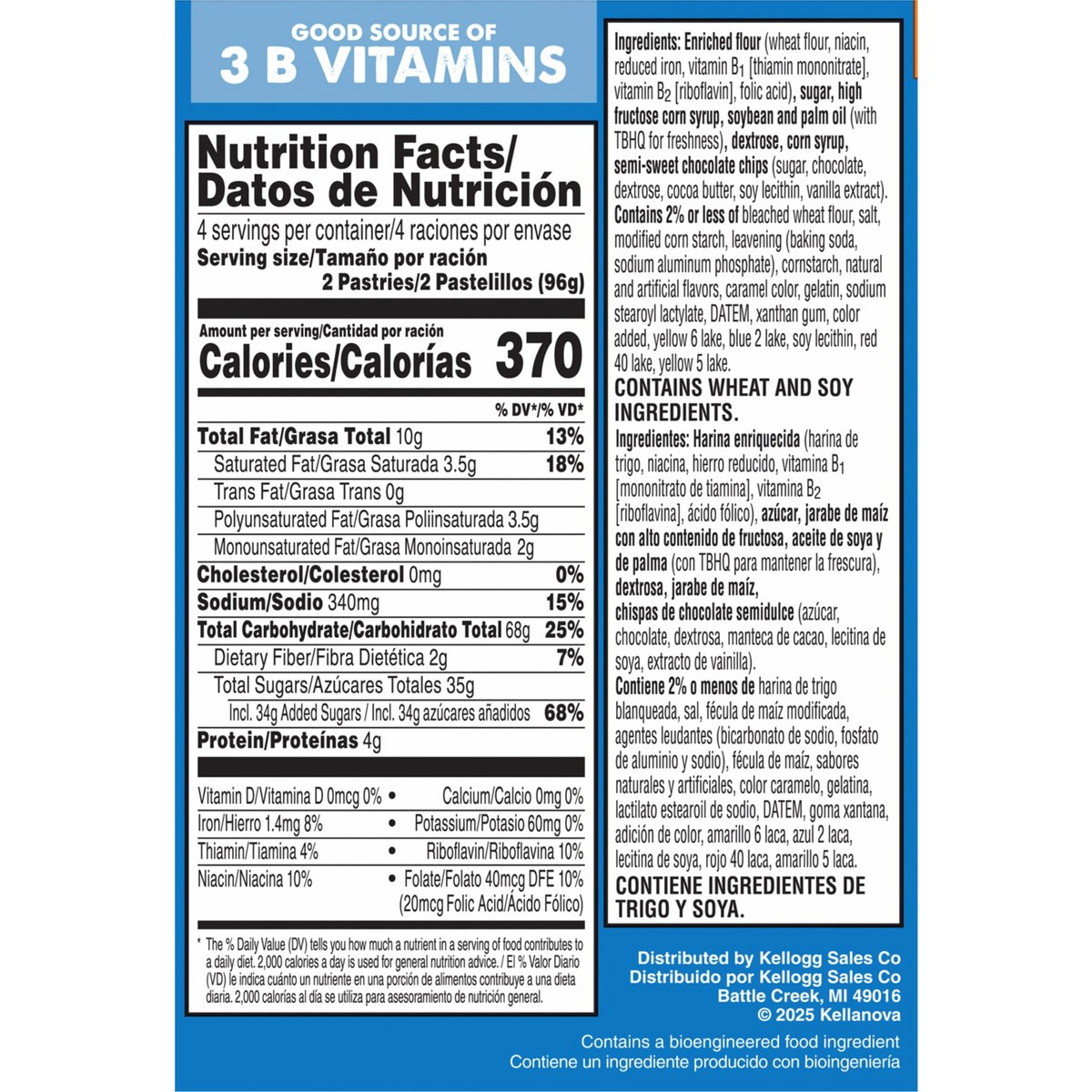 Naturally & artificially flavored. Per 2 Pastries: 370 calories; 3.5 g sat fat (18% DV); 340 mg sodium (15% DV); 35 g total sugars. Good source of 3 B vitamins. Contains a bioengineered food ingredient. It's back! Some people never toast'em (unless you count freezer burn). Fully baked & ready to eat! Or heat. Or freeze. Or stack. poptarts.com. how2recycle.info. Visit us at poptarts.com. Questions or comments? Visit: poptarts.com. Call: 1-877-453-5837. K Vets & Supporters: Supporting veteran recruitment at Kellanova. RSPO: Certified sustainable palm oil. Mixed. Proudly baked in the USA.