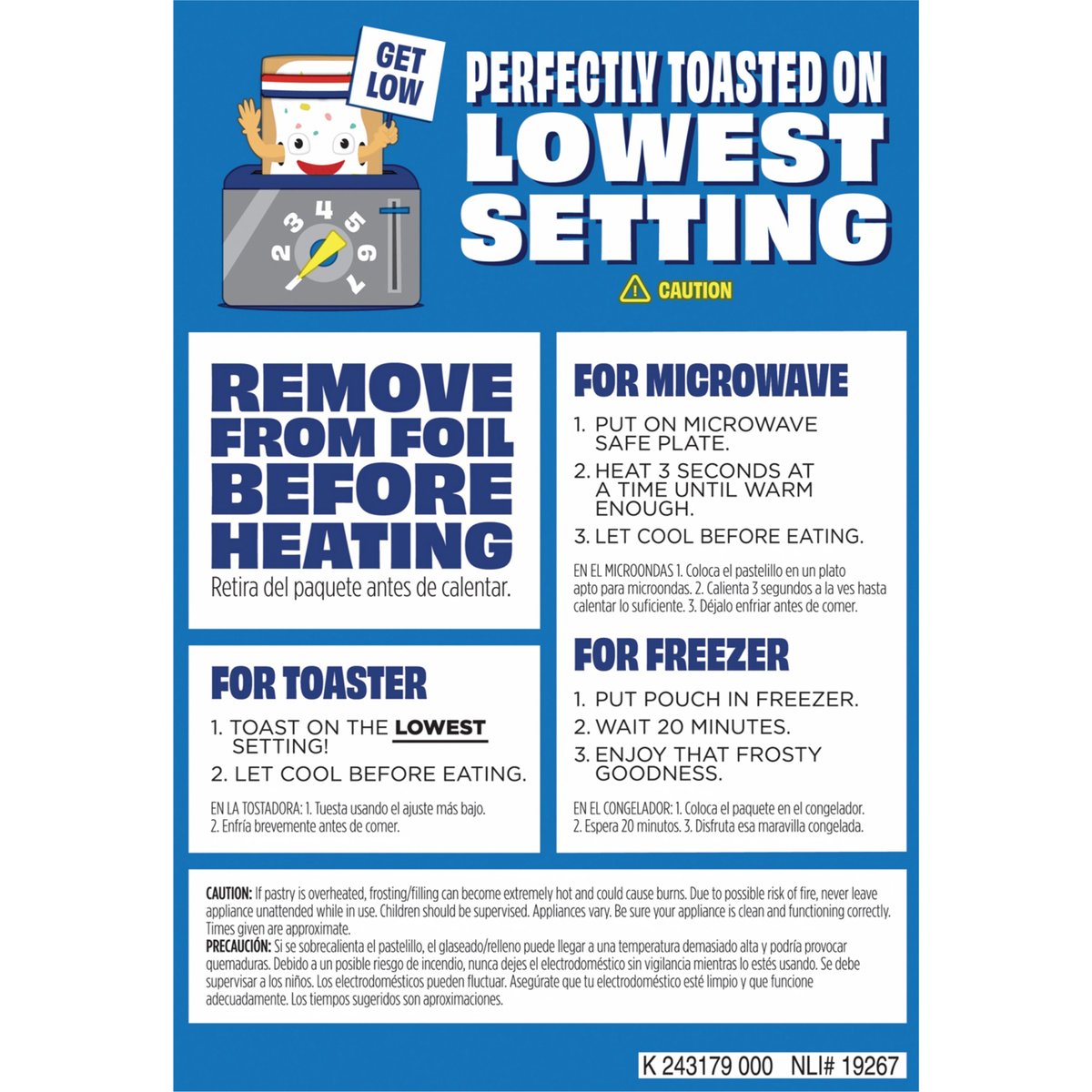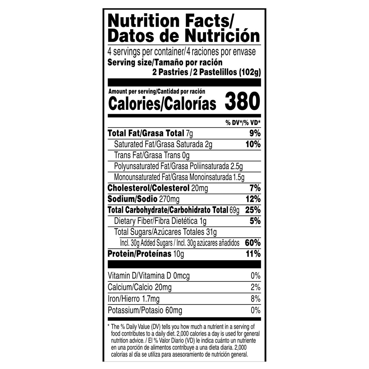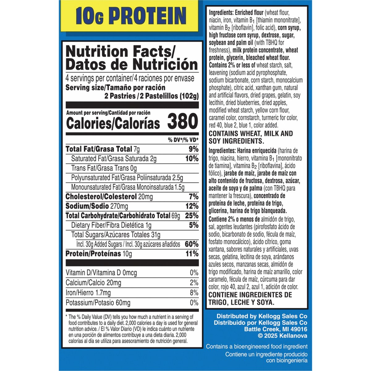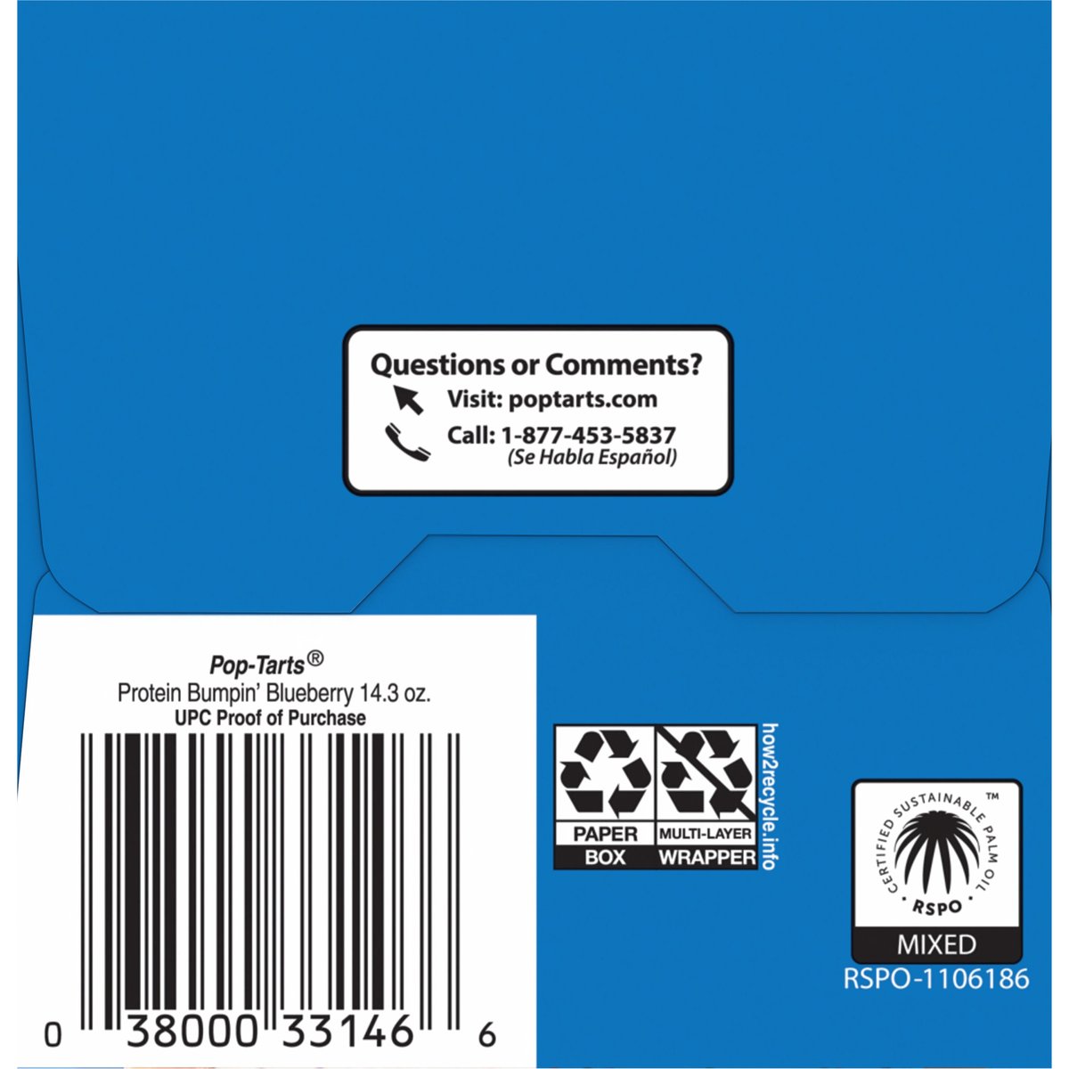 Limited Edition 8 toaster pastries. Naturally & artificially flavored. Per 2 Pastries: 380 calories; 2 g sat fat (10% DV); 270 mg sodium (12% DV); 31 g total sugars. 10 g protein. Contains a bioengineered food ingredient. poptarts.com. how2recycle.info. Visit us at poptarts.com. Questions or comments? Visit: poptarts.com. Call: 1-877-453-5837. RSPO: Certified sustainable palm oil. Mixed.