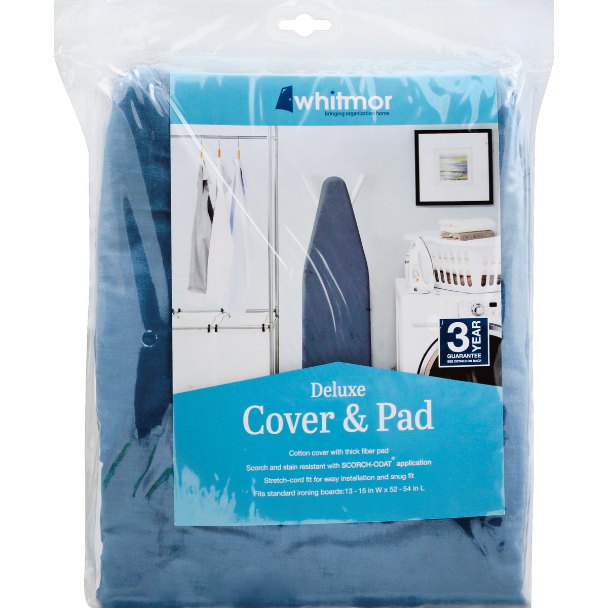 Cotton cover with thick fiber pad. Scorch and stain resistant with Scorch-coat application. Stretch-cord fit for easy installation and snug fit. Fits standard ironing boards: 13 -15 in W x 52-54 in L. 3 year guarantee. The cover and pad are unconditionally guaranteed against any defect in fit for 3 years from the date of purchase. If you are not completely satisfied for any reason within 3 years of purchase. simply return the cover and pad to Manor along with your dated purchase receipt and reason for return. This guarantee gives you specific legal rights that may vary from stale to state. Cover & Coating: Our Scorch-Coat application treats the cover's fabric with an additional coating for maximum protection against burns, stains and moisture. Thick Fiber Pad: Thick A thick fiber pad is sewn to the cotton cover creating a smooth ironing surface. The one piece construction is optimal for fit and alignment. Snug Fit & Easy Installation: Tailored nose pocket and heavy-duty stretch cord binding provide a snug, secure fit and make installation easy. 1-888-Whitmor. www.whitmor.com. Made in China.