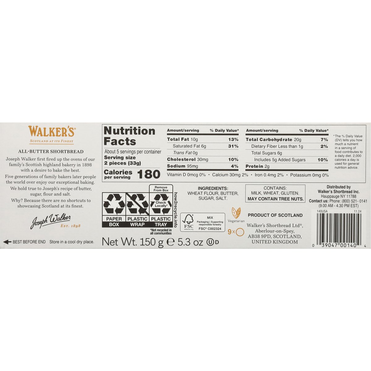 Deliciously creamy all-butter rounds decorated with the national flower. Vegetarian. By appointment to her majesty the Queen shortbread & oatcake. Manufacturer, Walker's Shortbread Ltd, Aberlour, Scotland. Speyside – Est. 1898. Joseph Walker. Scotland at its finest. All-butter shortbread. Joseph Walker first fired up the ovens of our family's Scottish highland bakery in 1898 with a desire to bake the best. Five generations of family bakers later people the world over enjoy our exceptional baking. We hold true to Joseph's recipe of butter, sugar, flour and salt. Why? Because there are no shortcuts to showcasing Scotland at its finest. how2recycle.info. us.walkersshortbread.com. Part of our range of fine baking. Hungry for more? Explore the range at us.walkersshortbread.com. Contact us: Phone: (800) 521-0141 (9.00 AM - 4.30 PM EST). FSC: Mix - Packaging | Supporting responsible forestry. www.fsc.org. Baked in Scotland. Product of Scotland.