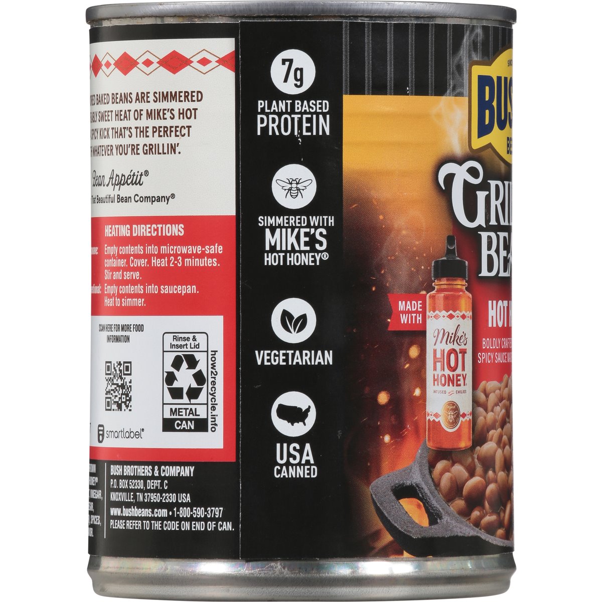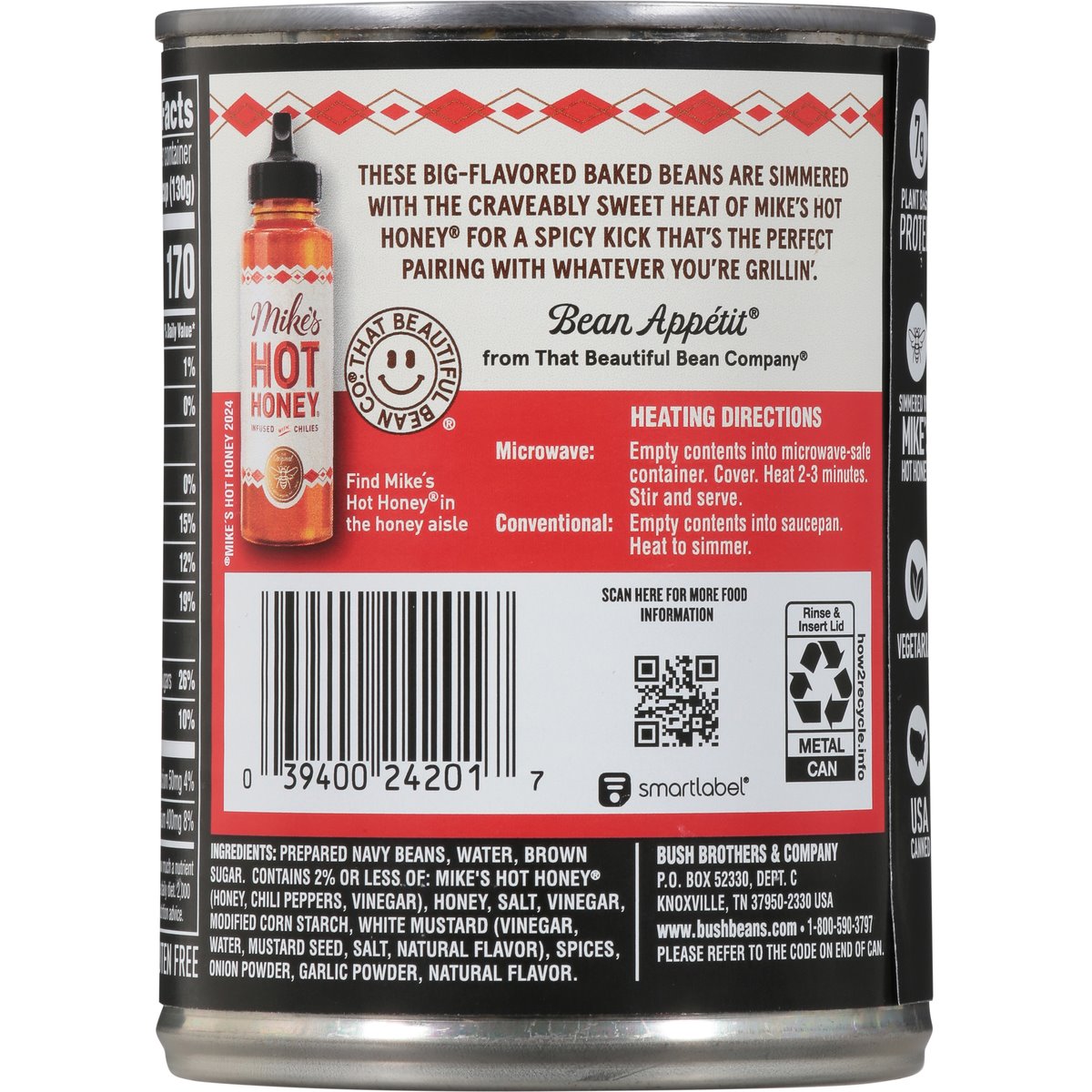 Boldly crafted in a sweet and spicy sauce made with hot honey. 7 g plant based protein. Gluten free. Vegetarian. Since 1908. These big-flavored baked beans are simmered with the craveably sweet heat of Mike's Hot Honey for a spicy kick that's the perfect pairing with whatever you're grillin'. Bean Appetit from that beautiful Bean Company. www.bushbeans.com. how2recycle.info. SmartLabel: Scan for more food information. 1-800-590-3797. Find Mike's Hot Honey in the honey aisle. USA canned.