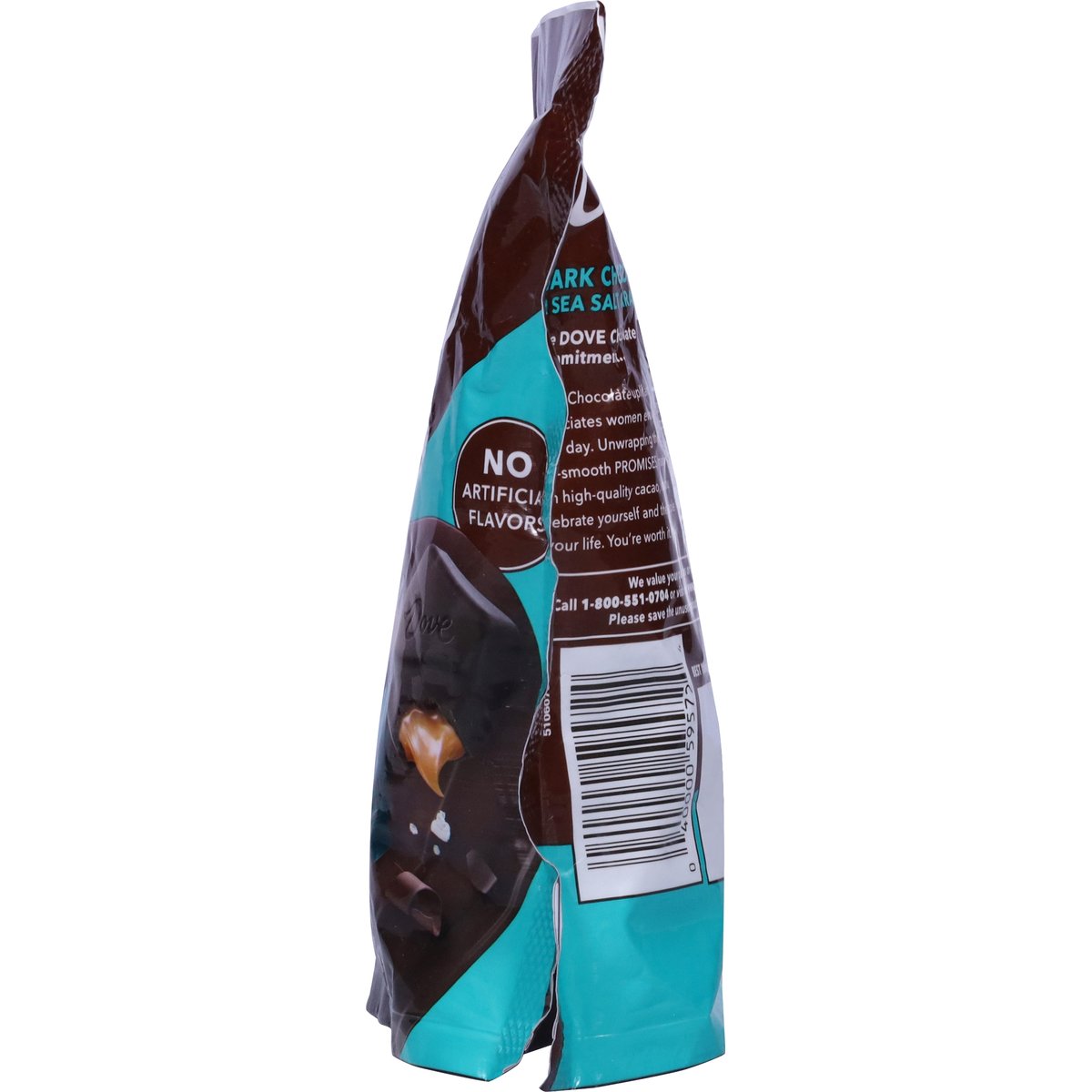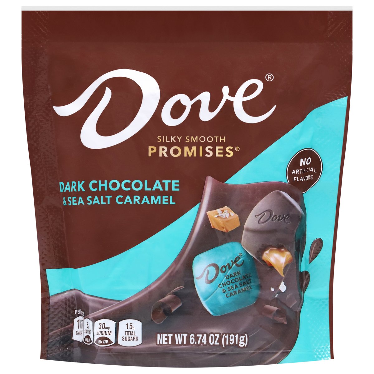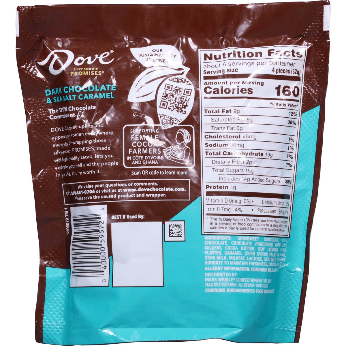 Dark chocolate & sea salt caramel. No artificial flavors. Per 4 Pieces: 160 calories; 6 g sat fat (30% DV); 30 mg sodium (1% DV); 15 g total sugars. Contains bioengineered food ingredients. Silky smooth promises. The Dove Chocolate Commitment...Dove Chocolate uplifts and appreciates women everywhere, every day. Unwrapping these silky-smooth promises, made with high-quality cacao, lets you celebrate yourself and the people in your life. You're worth it. www.dovechocolate.com. Scan QR code to learn more. We value your questions or comments. Call 1-800-551-0704 or visit us at www.dovechocolate.com. Please save the unused product and wrapper. Our sustainability journey. Supporting Female Cocoa farmers in Cote d'ivoire and Ghana. Scan QR code to learn more.