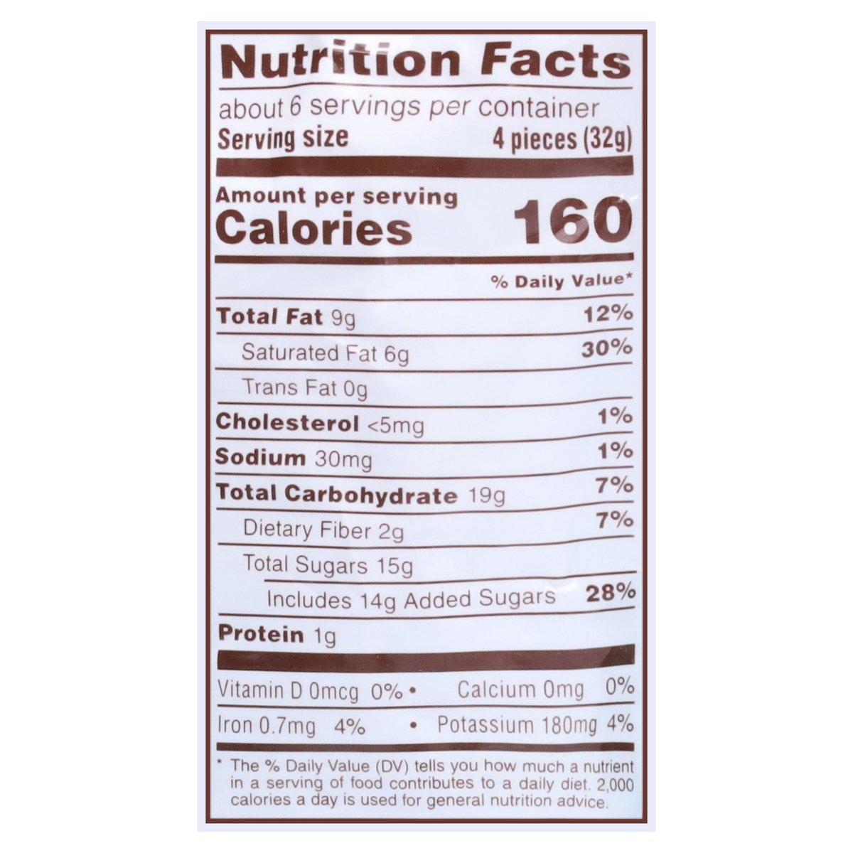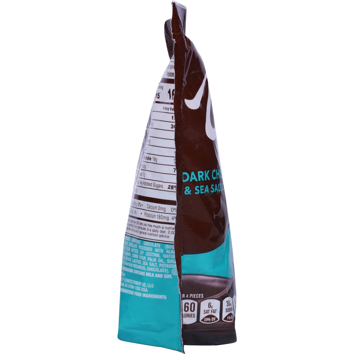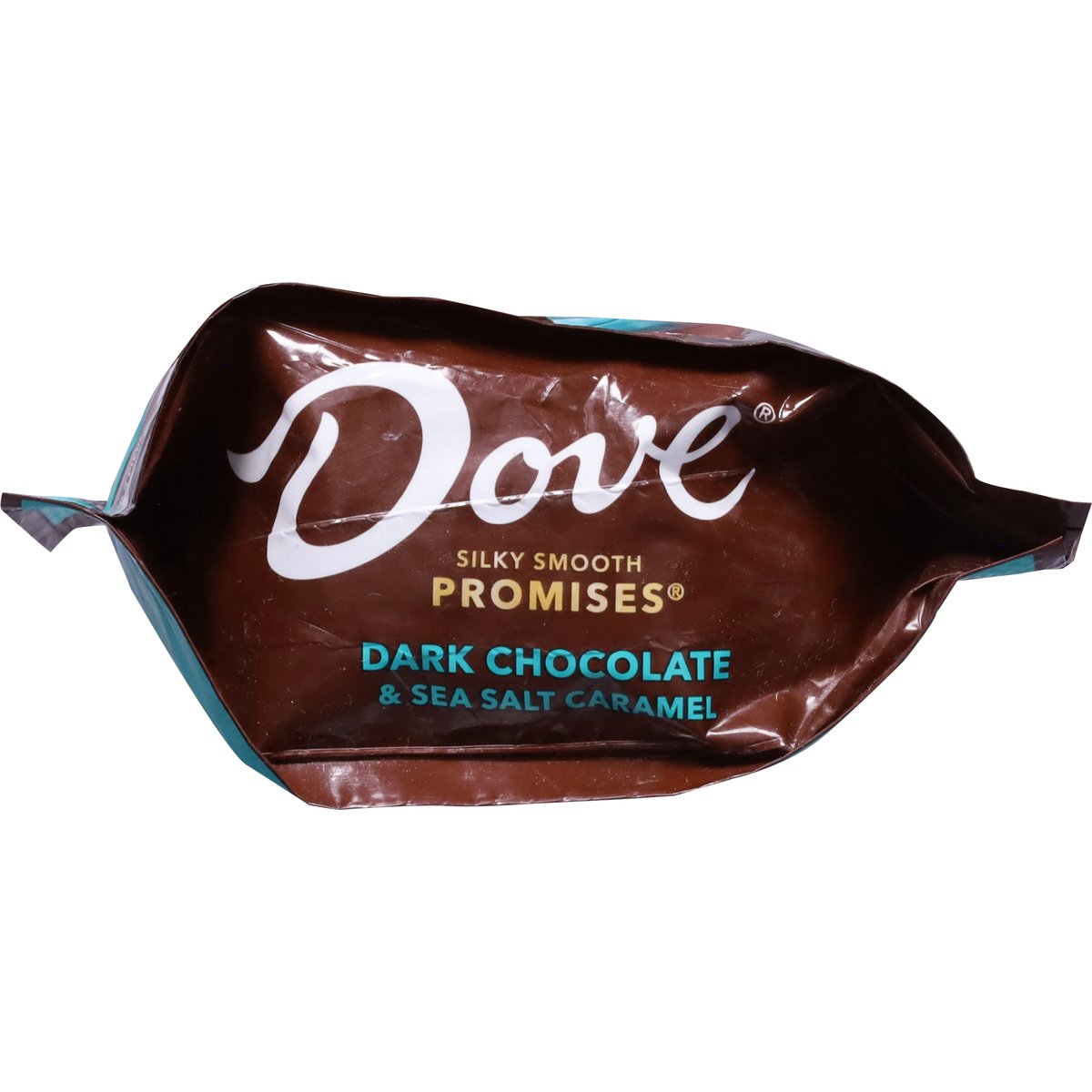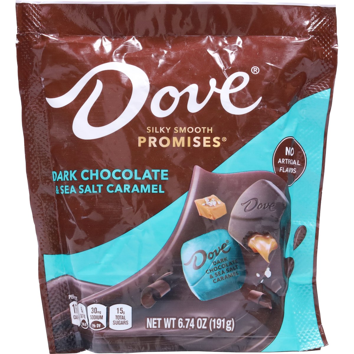 Dark chocolate & sea salt caramel. No artificial flavors. Per 4 Pieces: 160 calories; 6 g sat fat (30% DV); 30 mg sodium (1% DV); 15 g total sugars. Contains bioengineered food ingredients. Silky smooth promises. The Dove Chocolate Commitment...Dove Chocolate uplifts and appreciates women everywhere, every day. Unwrapping these silky-smooth promises, made with high-quality cacao, lets you celebrate yourself and the people in your life. You're worth it. www.dovechocolate.com. Scan QR code to learn more. We value your questions or comments. Call 1-800-551-0704 or visit us at www.dovechocolate.com. Please save the unused product and wrapper. Our sustainability journey. Supporting Female Cocoa farmers in Cote d'ivoire and Ghana. Scan QR code to learn more.