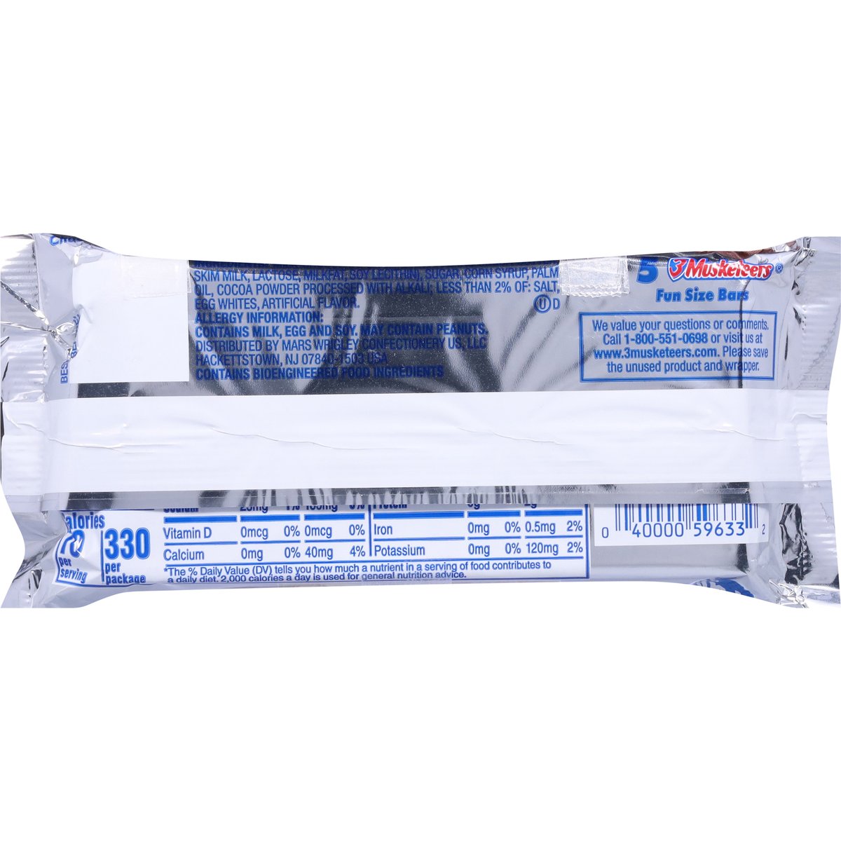 70 calories per bar. Contains bioengineered food ingredients. Whipped up, fluffy chocolate-on-chocolate taste. www.3musketeers.com. We value your questions or comments. Call 1-800-551-0698 or visit us at www.3musketeers.com. Please save the unused product and wrapper.