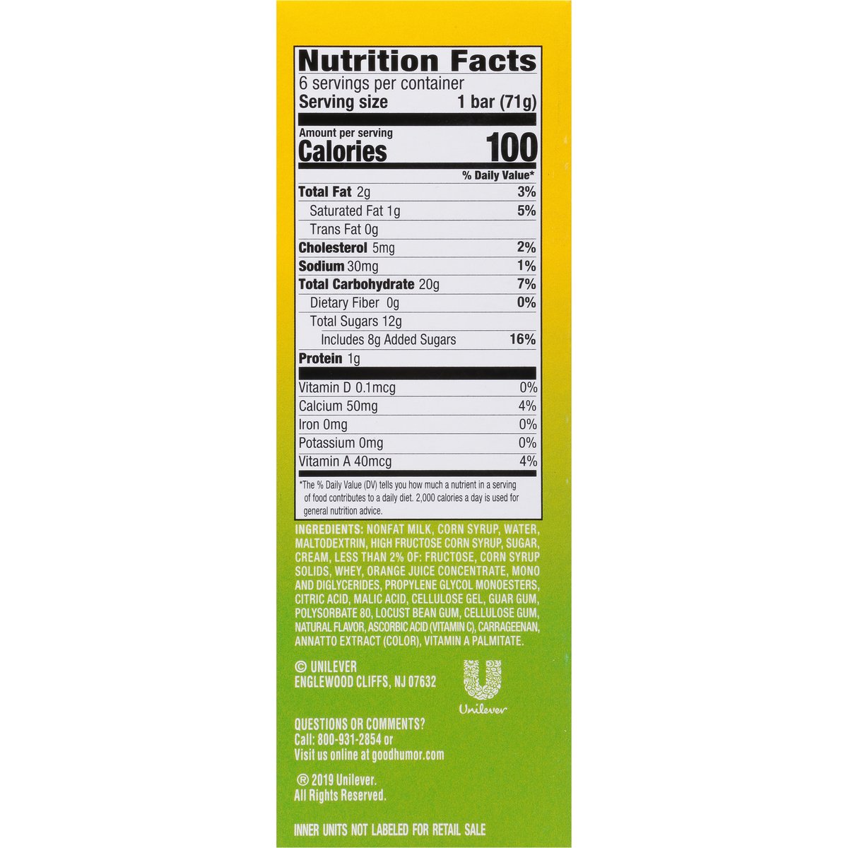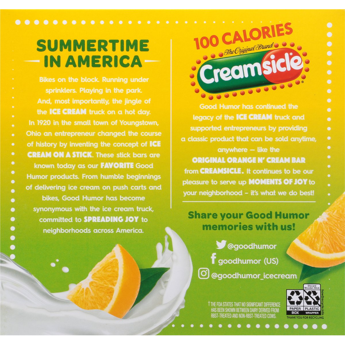 Vanilla flavored low fat ice cream bars coated with orange flavored sherbet. Artificial color and artificial flavor added. Per 1 Bar: 100 calories; 1 g sat fat (5% DV); 30 mg sodium (1% DV); 12 g total sugars. Low fat. No artificial growth hormones (the FDA states that no significant difference has been shown between dairy derived from rBST-treated and non-rBST-treated cows) used on cows. Ice cream truck favorites. Same original taste. The original brand. Summertime in America: Bikes on the block. Running under sprinklers. Playing In the park. And, most Importantly, the jingle of the ice cream truck on a hot day. In 1920 in the small town of Youngstown, Ohio an entrepreneur changed the course of history by inventing the concept of ice cream on a stick. These stick bars are known today as our favorite Good Humor products. From humble beginnings of delivering ice cream on push carts and bikes, Good Humor has become synonymous with the ice cream truck, committed to spreading joy to neighborhoods across America. Good Humor has continued the legacy of the Ice Cream truck and supported entrepreneurs by providing a classic product that can be sold anytime, anywhere - like the Original Orange n' Cream Bar from Creamsicle. It continues to be our pleasure to serve up Moments of Joy to your neighborhood - it's what we do best! Inner units not labeled for retail sale. goodhumor.com. Share your good humor memories with us! Twitter: (at)goodhumer. Facebook: goodhumor (US). Instagram: (at)goodhumor_icecream. Questions or comments? Call: 800-931-2854 or Visit us online at goodhumor.com.