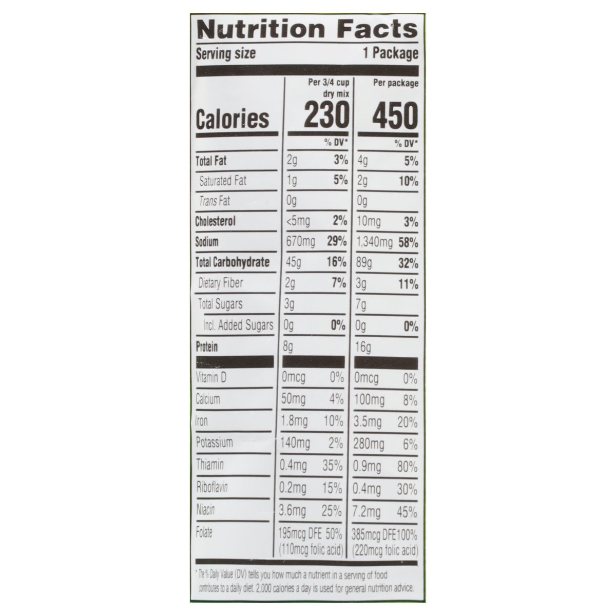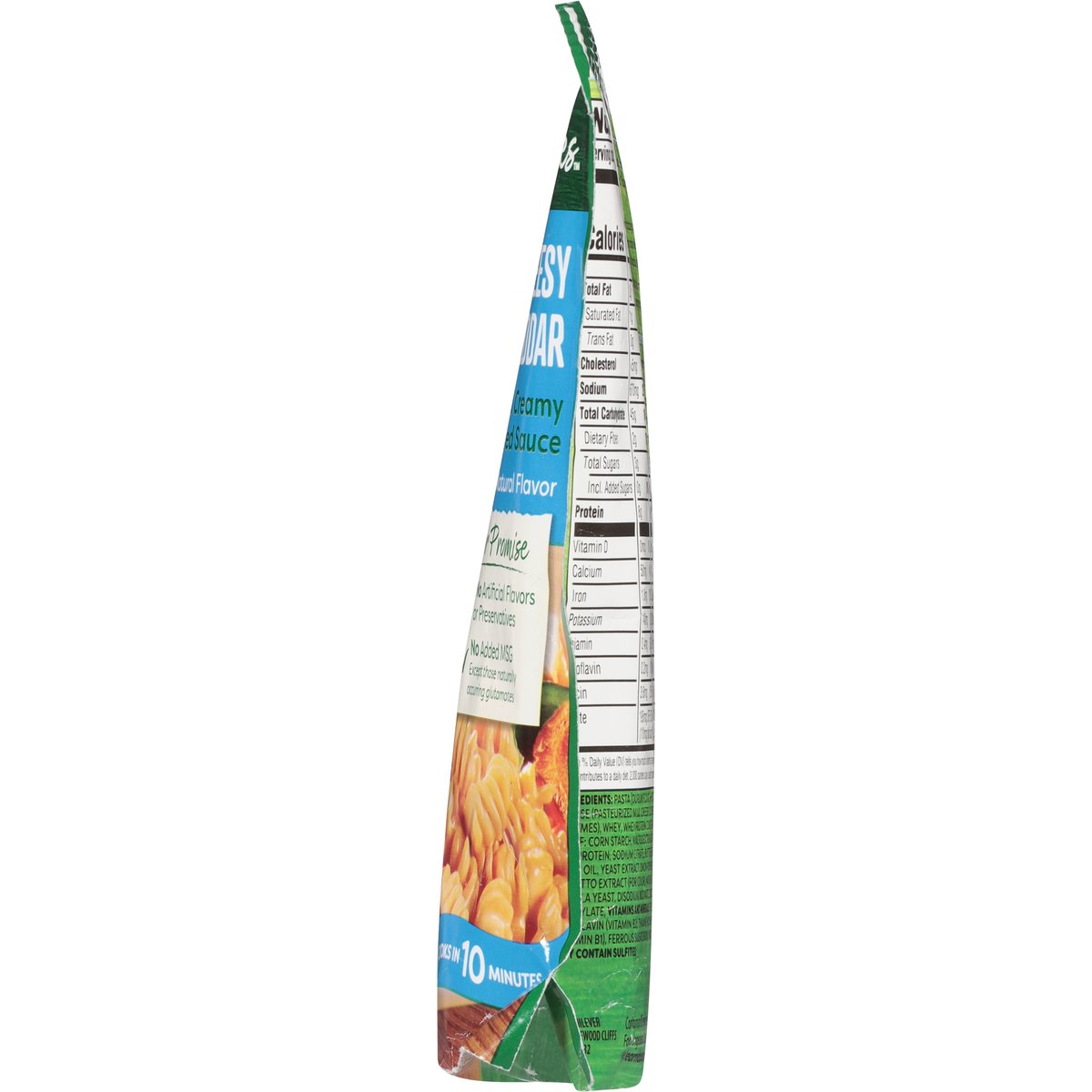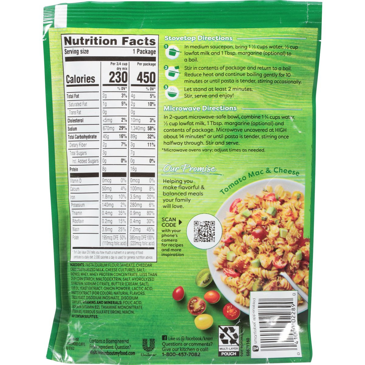 Spiral pasta in a cheesy cheddar sauce with other natural flavor. No artificial flavors or preservatives. Per 1/2 Cup Dry Mix Serving: 230 calories; 1 g sat fat (5% DV); 670 mg sodium (29% DV); 3 g total sugars. No added MSG. Except those naturally occurring glutamates. Contains a bioengineered food ingredient. Question? Visit learnaboutmyfood.com. Since 1838. Cooks in 10 minutes. Our Promise: Helping you make flavorful & balanced meals your family will love. learnaboutmyfood.com. how2recycle.info. Scan code with your phone's camera for recipes and more inspiration. Facebook: Like us (at) facebook/knorr. SmartLabel app enabled. Questions or comments? Give our kitchen a call! 1-800-457-7082.