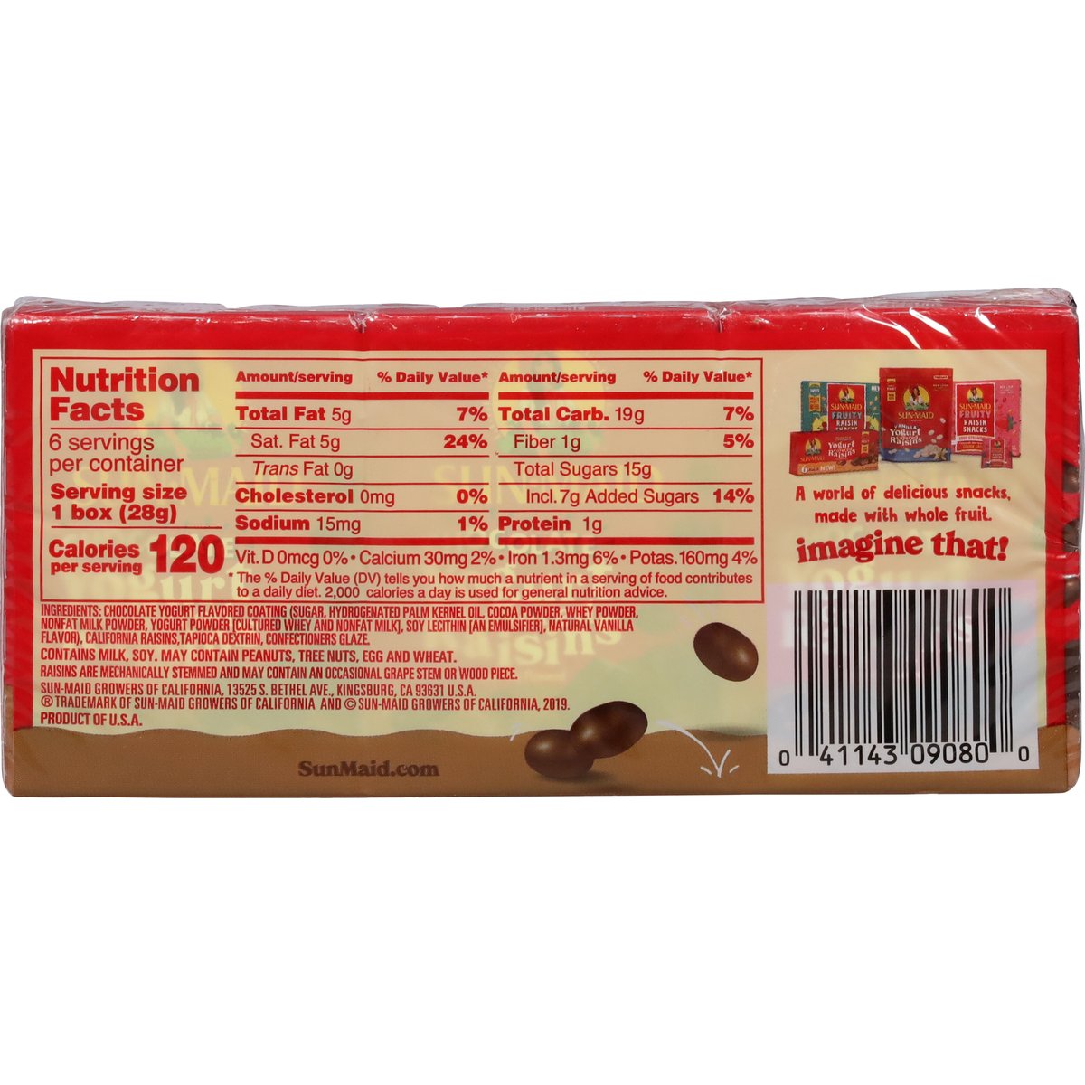 Naturally flavored. Non GMO. New look same great taste! Not labeled for individual retail sale. SunMaid.com. Fruity Raisins Snacks; Vanilla Yogurt Covered Raisins. A world o delicious snacks, made with whole fruit. Imagine that? Product of U.S.A.