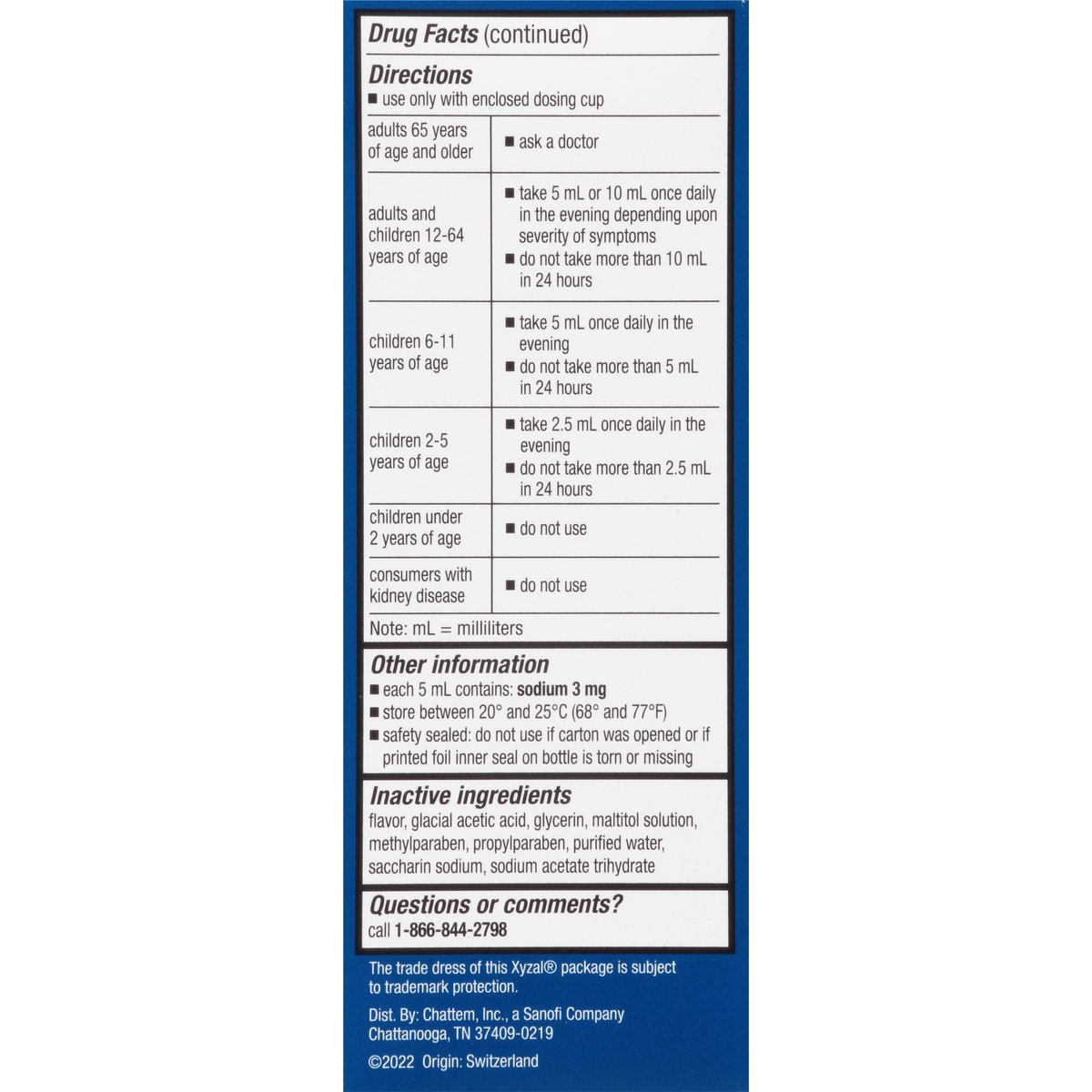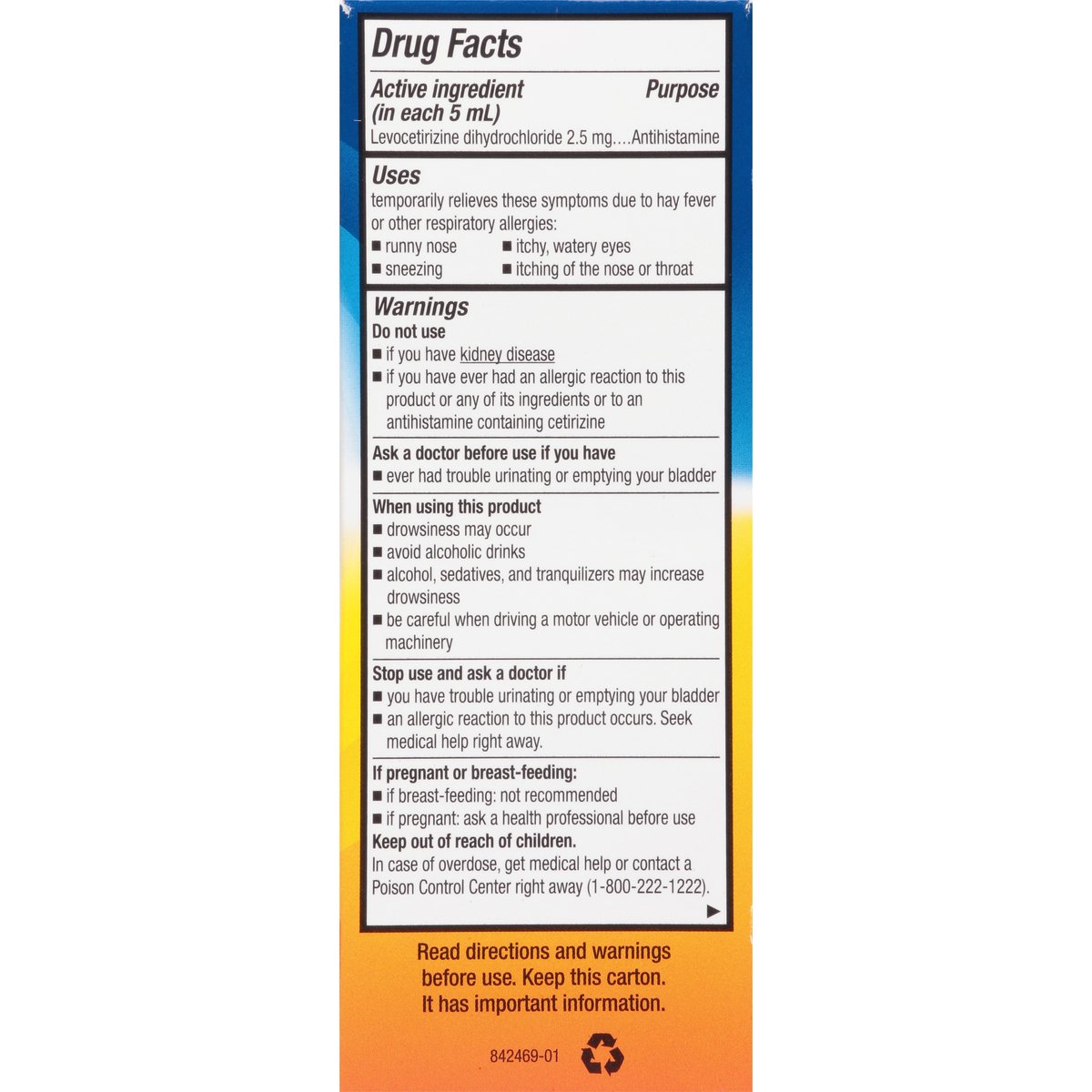 Ages 2 years & older. 2+. Levocetirizine dihydrochloride oral solution 2.5 mg / 5 ml antihistamine. Sugar free. New flavor! Alcohol free. Dye free. 24 Hour Relief: Runny nose; sneezing; itchy, watery eyes; itchy nose or throat. Clinically proven relief for 24 hours. Clinically proven relief from indoor and outdoor allergies. Questions or comments? Call 1-866-844-2798. Origin: Switzerland.