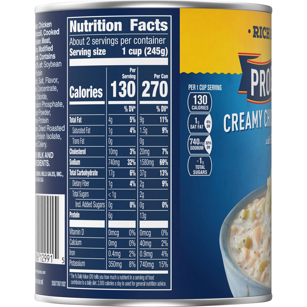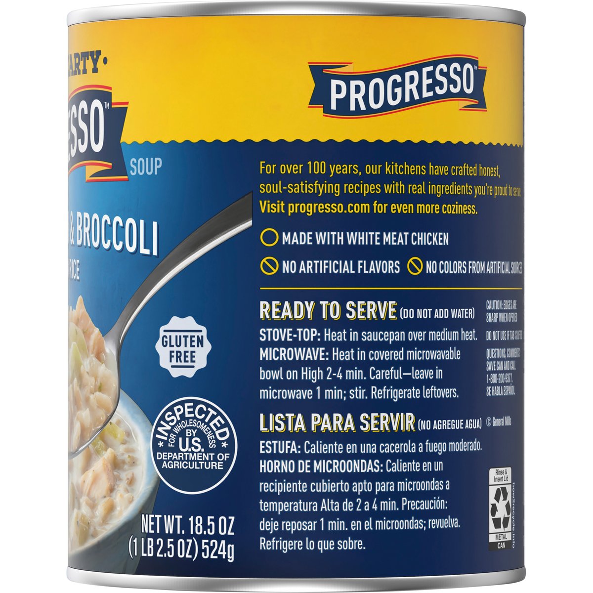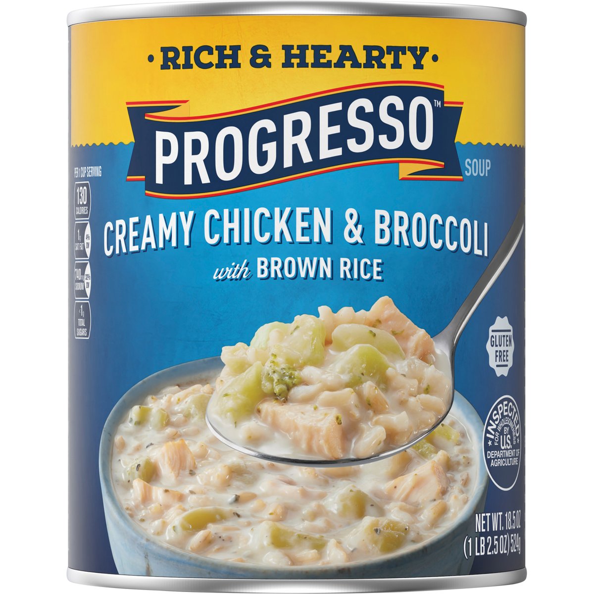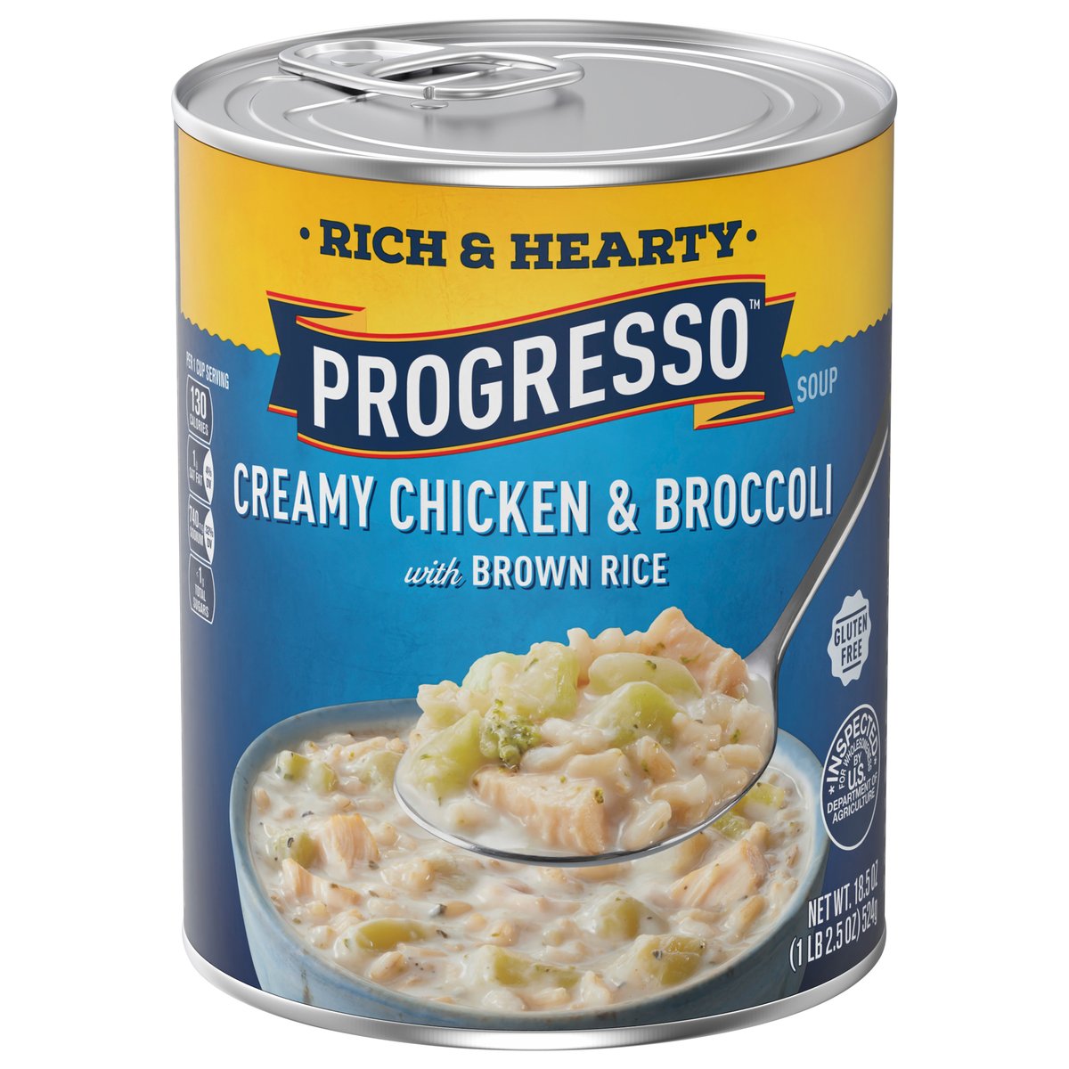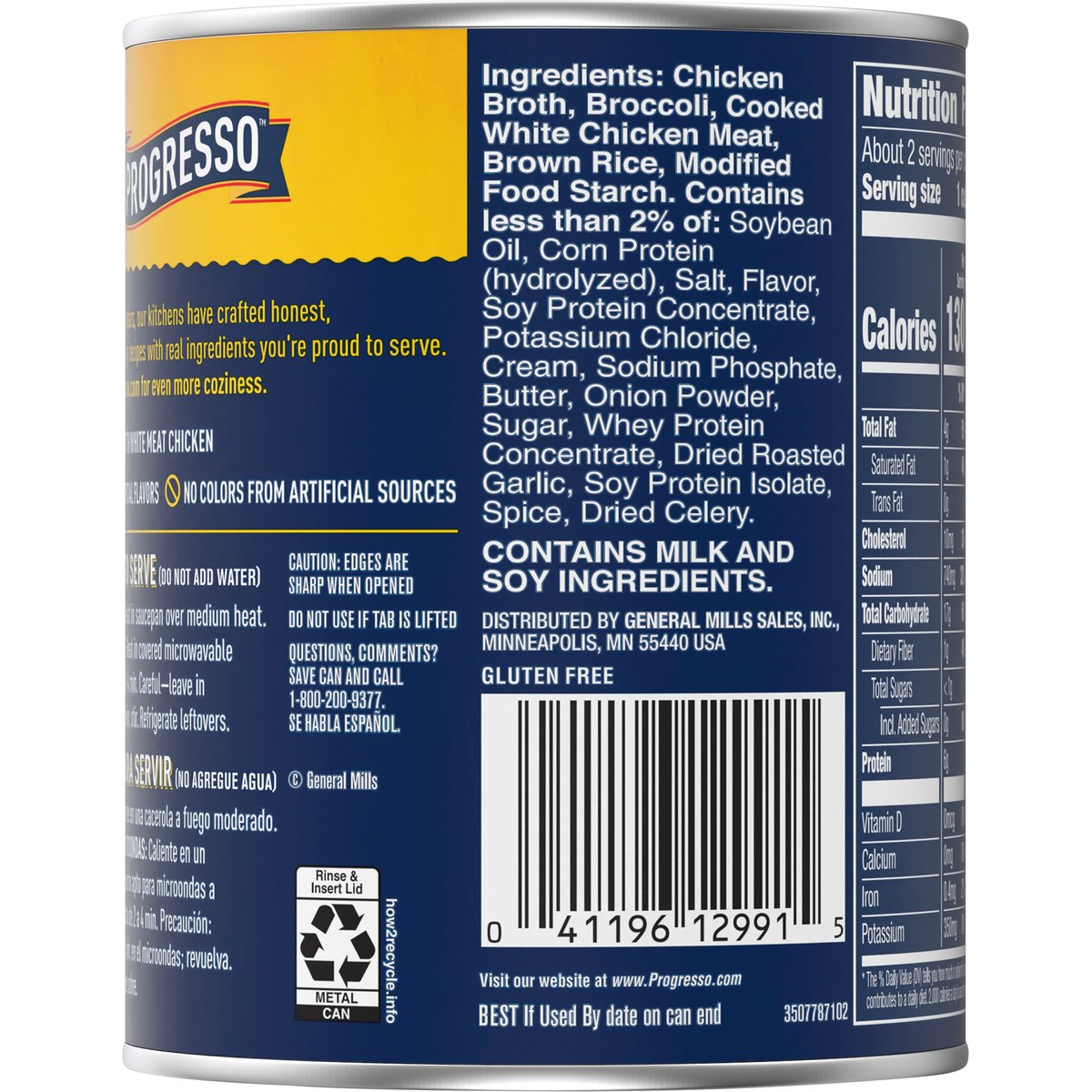 Creamy chicken & broccoli with brown rice. No artificial flavors. Per 1 Cup Serving: 130 calories; 1 g sat fat (4% DV); 740 mg sodium (32% DV); less than 1 g total sugars. Gluten free. Rich & hearty. For over 100 years, our kitchens have crafted honest, soul-satisfying recipes with real ingredients you're proud to serve. No colors from artificial sources. Inspected for wholesomeness by U.S. Department of Agriculture. how2recycle.info. www.Progresso.com. Questions, comments? Save can and call 1-800-200-9377. Visit our website at www.Progresso.com. Visit progresso.com for even more coziness.