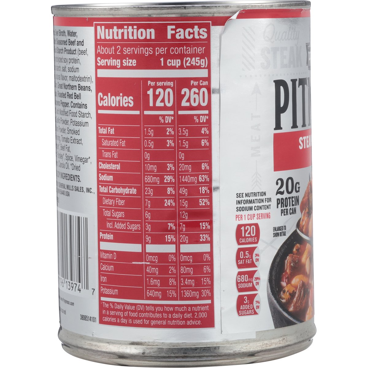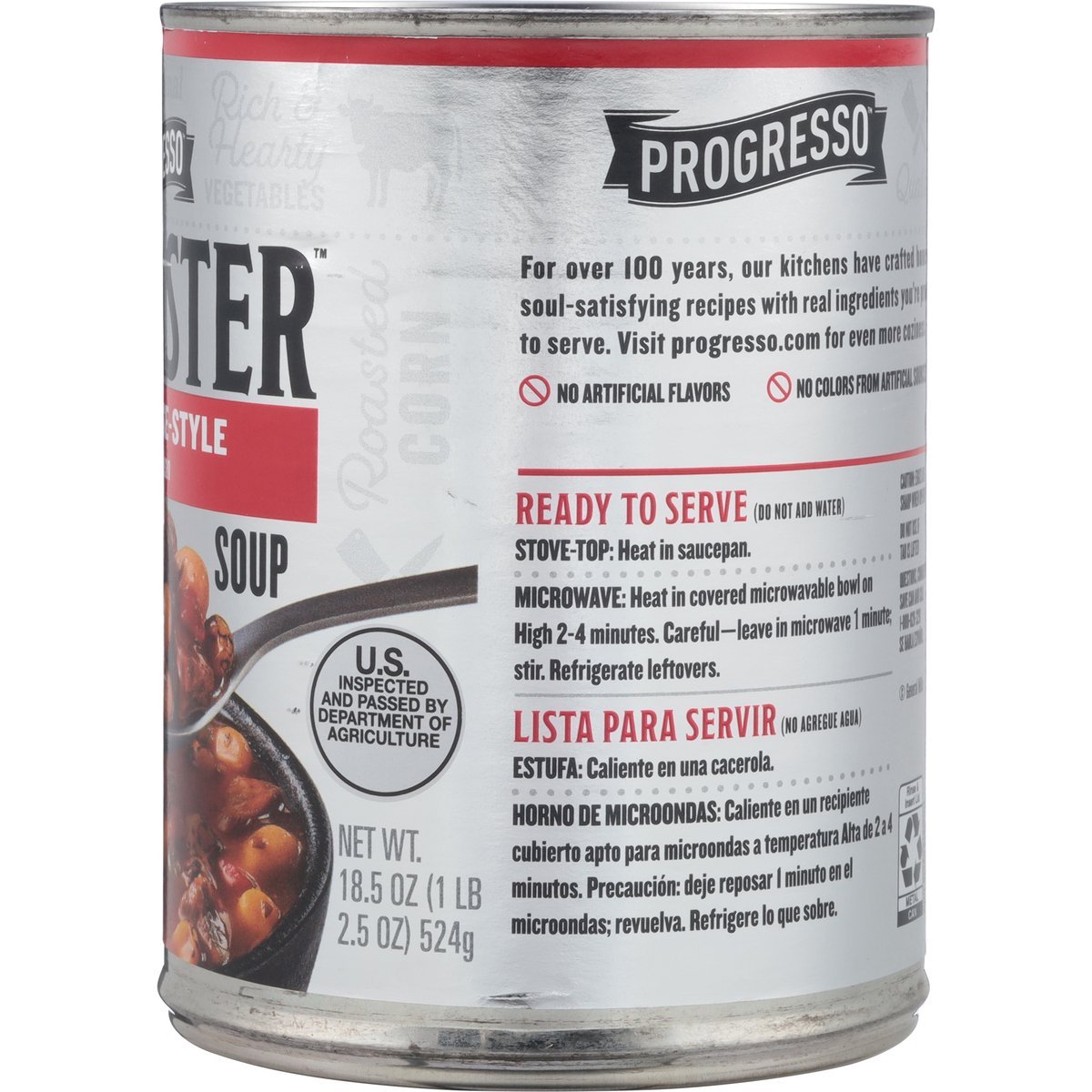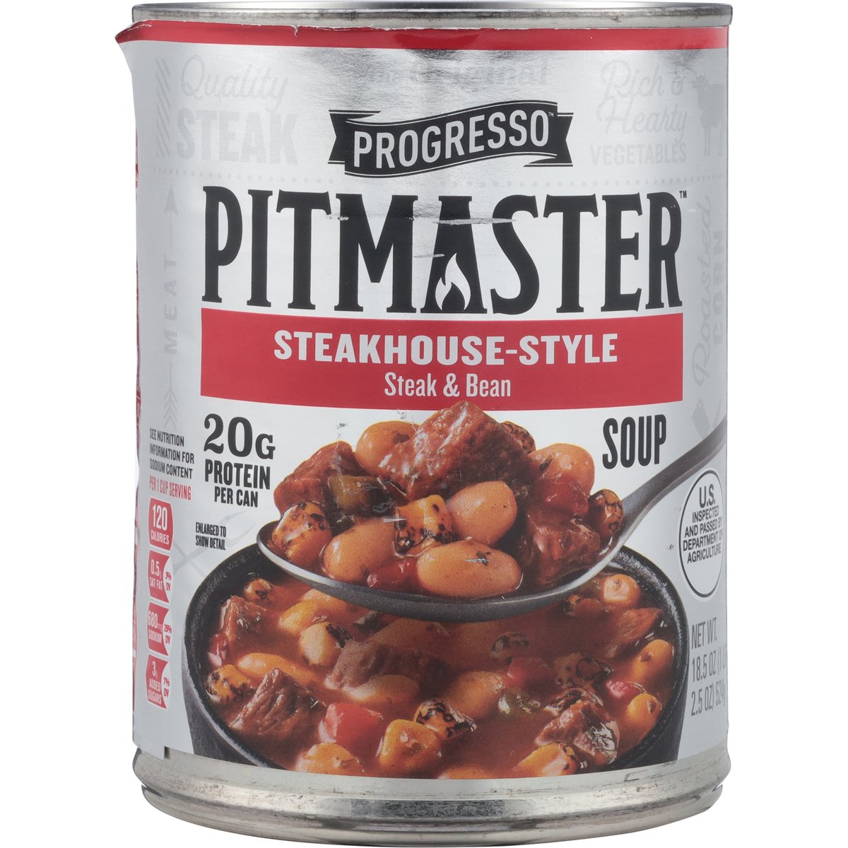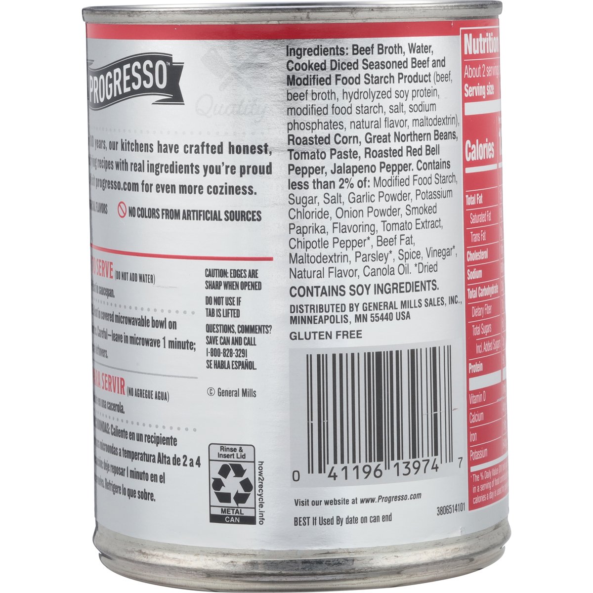 Steak & bean. No artificial flavors. 20 g protein per can. Per 1 Cup Serving: 120 calories; 0.5 g sat fat (3% DV); 680 mg sodium (29% DV); 3 g added sugars (7 %DV). Gluten free. See nutrition information for sodium content. For over 100 years, our kitchens have crafted honest, soul-satisfying recipes with real ingredients you're proud to serve. No colors from artificial sources. U.S. inspected and passed by Department of Agriculture. www.progresso.com. how2recycle.info. Questions, comments? Save can and call 1-800-828-3291. Visit our website at www.progresso.com. Visit our website at www.progresso.com.
