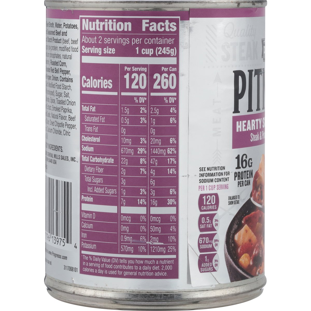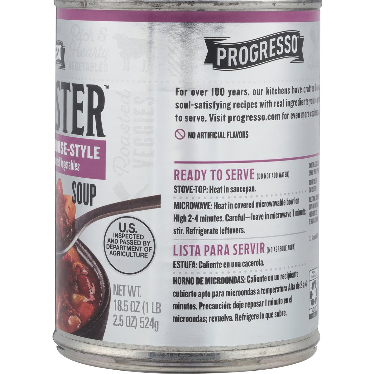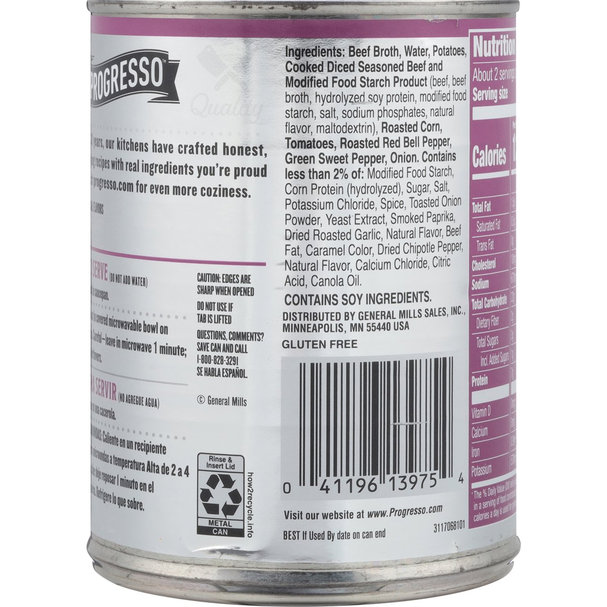 Steak & potatoes with roasted vegetables. No artificial flavors. 16 g protein per can. Per 1 Cup Serving: 120 calories; 0.5 g sat fat (3% DV); 670 mg sodium (29% DV); 1 g added sugars (3%DV). Gluten free. See nutrition information for sodium content. For over 100 years, our kitchens have crafted honest soul-satisfying recipes with real ingredients you're proud to serve. U.S. inspected and passed by Department of Agriculture. how2recycle.info. www.Progresso.com. Visit progresso.com for even more coziness. Questions, Comments? Save can and call 1-800-828-3291. Visit our website at www.Progresso.com.