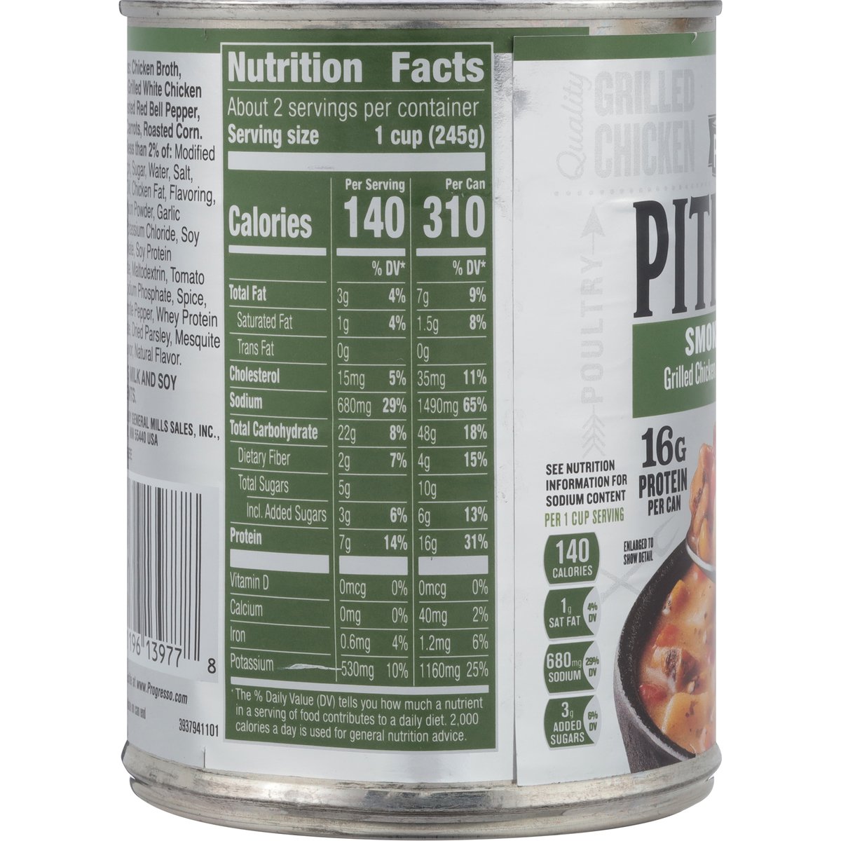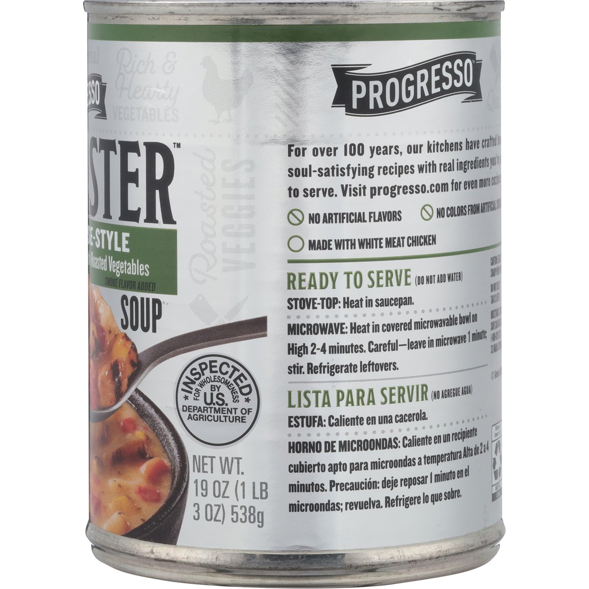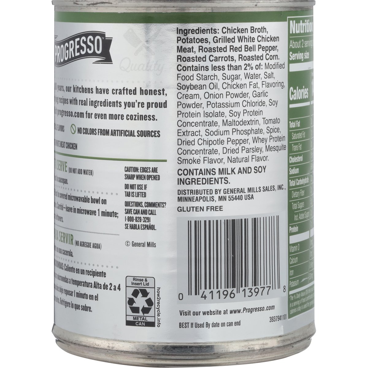 Grilled chicken & potato with roasted vegetables. No artificial flavors. 16 g protein per can. Per 1 Cup Serving: 140 calories; 1 g sat fat (4% DV); 680 mg sodium (29% DV); 3 g added sugars (6% DV). Gluten free. See nutrition information for sodium content. For over 100 years, our kitchens have crafted honest soul-satisfying recipes with real ingredients you're proud to serve. No colors from artificial sources. Inspected for wholesomeness by U.S. Department of Agriculture. www.progresso.com. how2recycle.info. Visit progresso.com for even more coziness. Questions, Comments? Save can and call 1-800-828-3291. Visit our website at www.Progresso.com.
