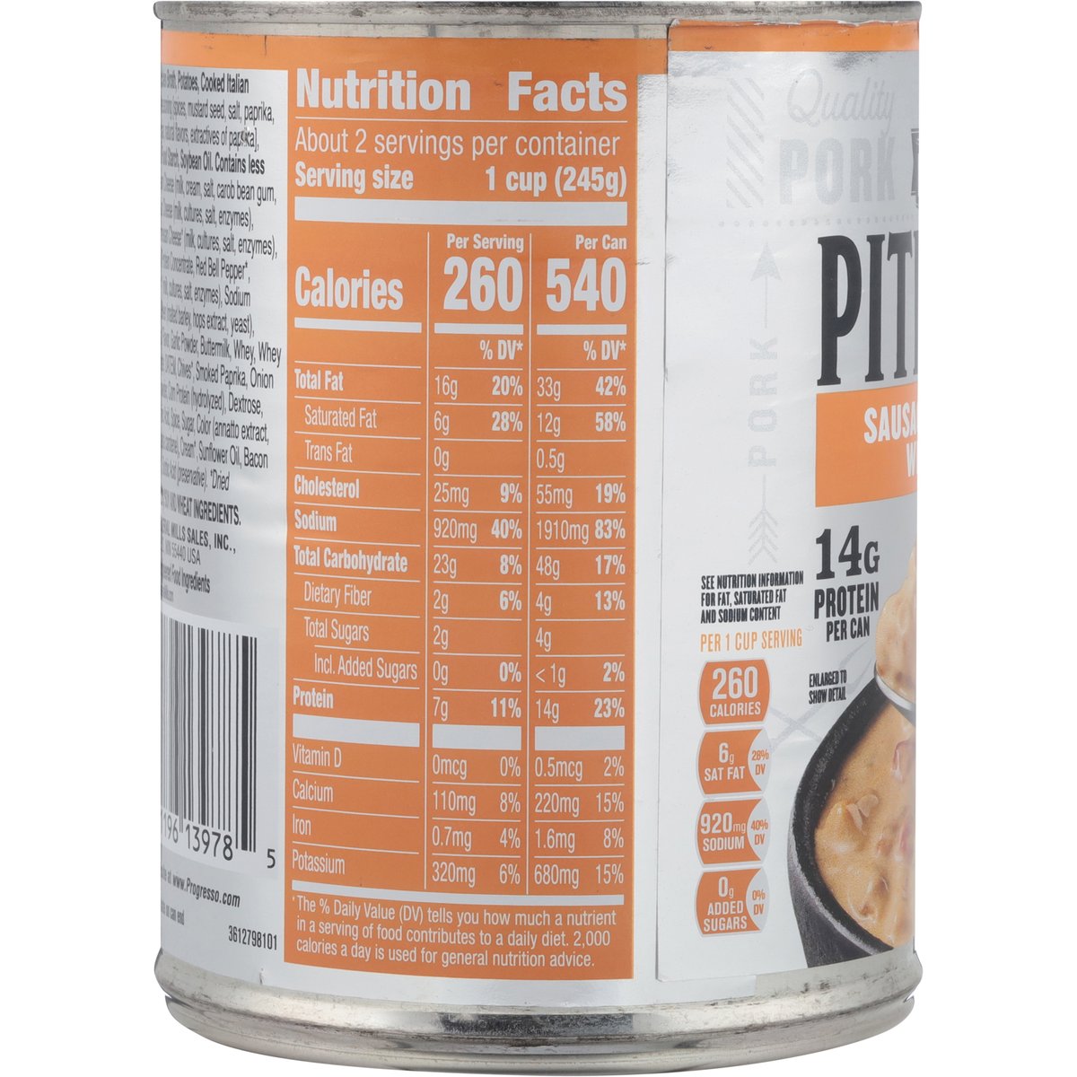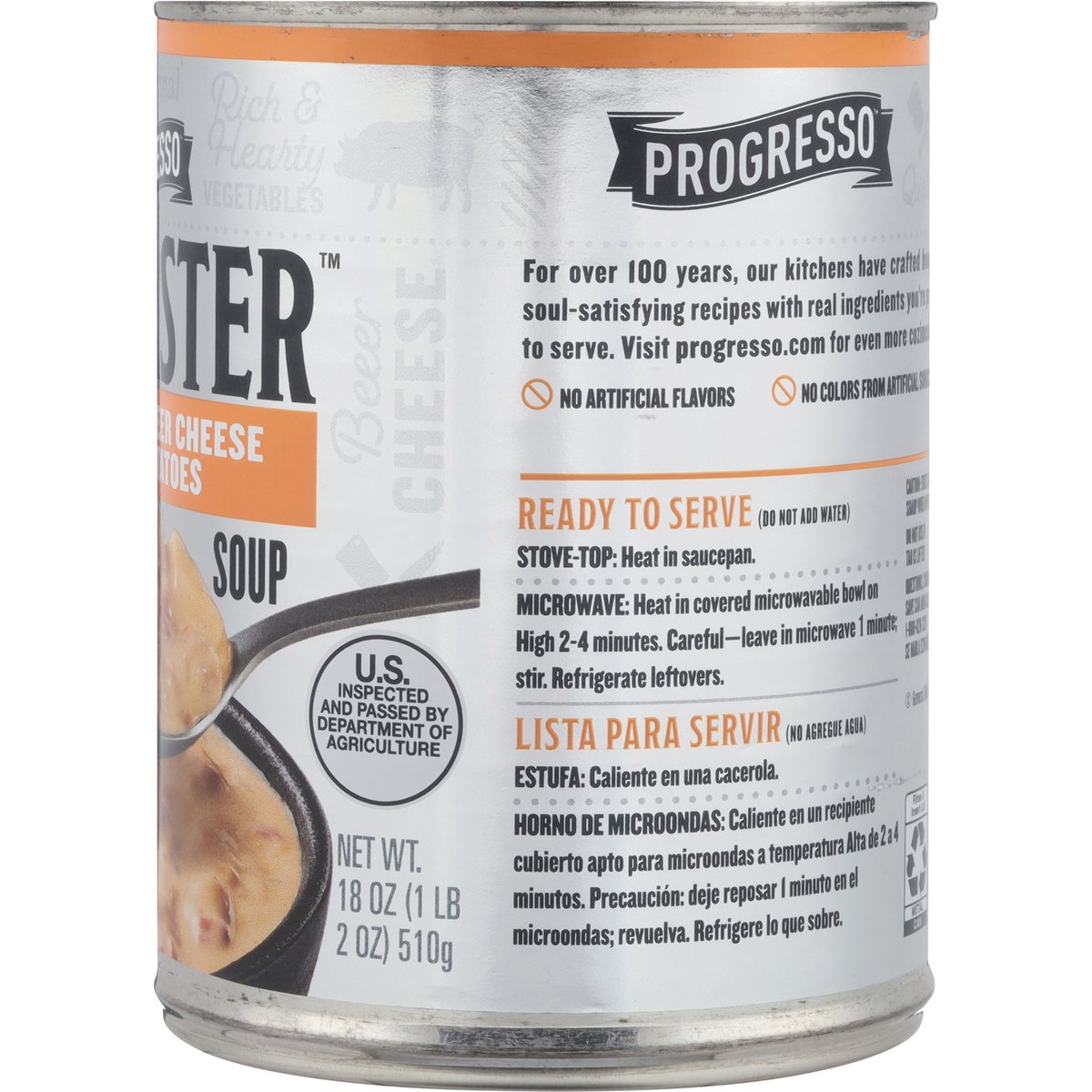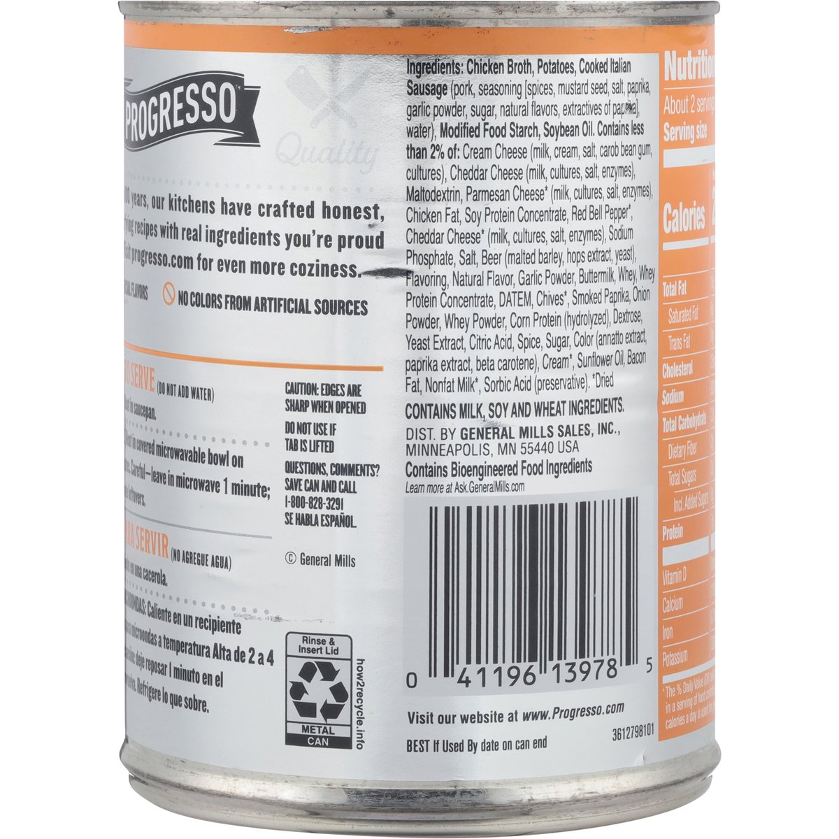 Sausage & beer cheese with potatoes. No artifical flavors. 14 g protein per can. Per 1 Cup Serving: 260 calories; 6 g sat fat (28% DV); 920 mg sodium (40% DV); 0 g added sugars (0% DV). See nutrition information for fat, saturated fat and sodium content. Contains bioengineered food ingredients. Learn more at Ask.GeneralMills.com. For over 100 years, our kitchens have crafted honest, soul-satisfying recipes with real ingredients you’re proud to serve. No colors from artificial sources. U.S. inspected and passed by Department of Agriculture. www.progresso.com. how2recycle.info. Ask.GeneralMills.com. Questions, comments? Save can and call 1-800-828-3291. Visit progresso.com for even more coziness. Visit our website at www.progresso.com.
