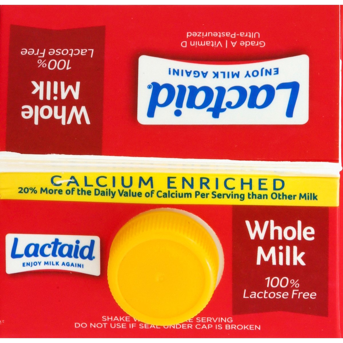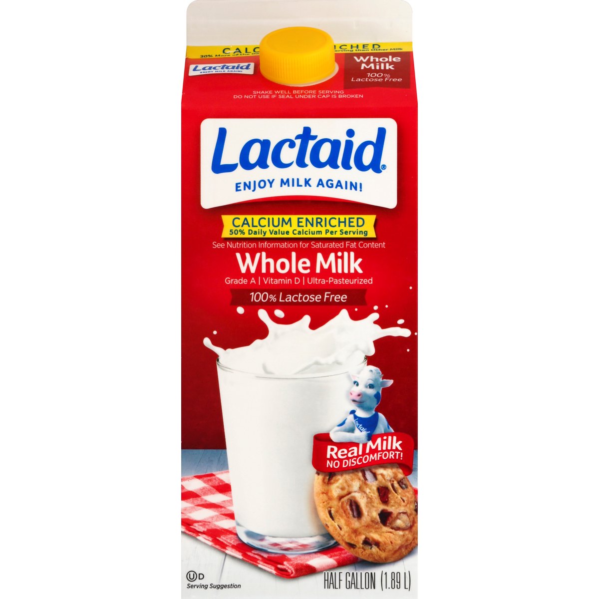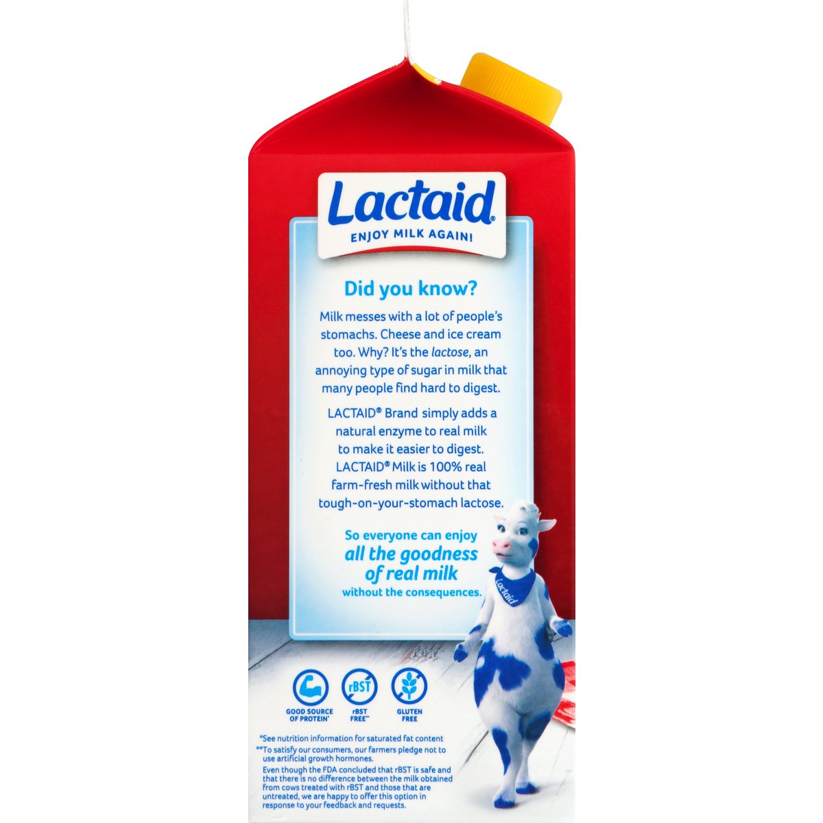 100% lactose free. Grade A. Vitamins A & D. Ultra pasteurized. 500 mg Lactaid Milk Calcium Enriched vs up to 350 mg Fortified Orange Juice (Amongst leading brands). 300 mg regular milk. Lactaid Calcium Enriched Milk has more calcium per serving than fortified orange juice (Amongst leading brands) or regular milk. Calcium Enriched: 50% daily value calcium per serving. 20% more of the daily value of calcium per serving than other milk. Calcium Enriched: 50% daily value calcium per serving. See nutrition information for saturated fat. 20% more of the daily value of calcium per serving than other milk. Just 2 servings = 100% daily value of calcium. More calcium. No lactose. Good source of protein (See nutrition information for saturated fat content. rBST free (to satisfy our consumers, our farmers pledge not to use artificial growth hormones). Gluten free. Enjoy milk again! Real milk. No discomfort! For more of your dairy favorites, check out our nutritious cottage cheese! Delicious, easy to digest milk with more calcium per serving. With Lactaid Calcium Enriched Milk, you are getting 100% farm-fresh milk with all of the nutrients of milk and 500 mg of calcium per serving. Even though the FDA concluded that rBST is safe and that there is no difference between the milk obtained from cows treated with rBST and those that are untreated, we are happy to offer this option in response to your feedback and requests. If you have any questions or comments in English or Spanish, call us toll free at 1-800-Lactaid or visit us at lactaid.com. Ultra-pasteurized and homogenized at plant stamped on top.