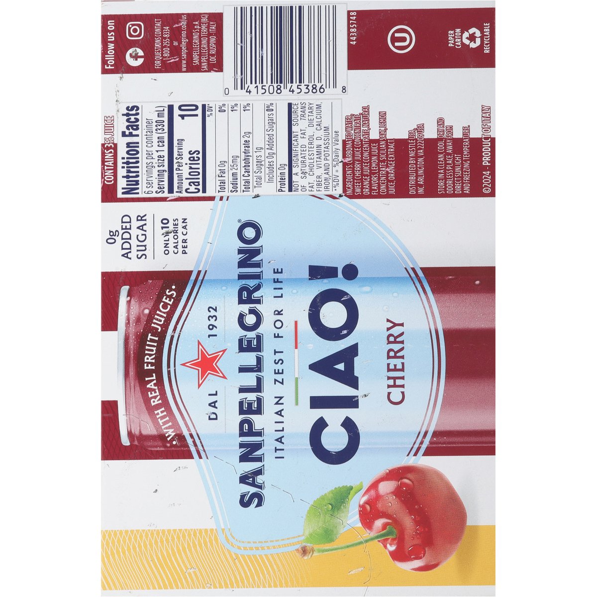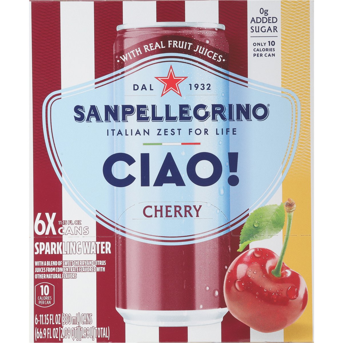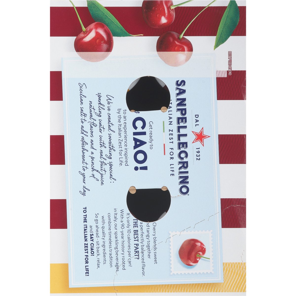 Sparkling water with a blend of sweet cherry and citrus juices from concentrate flavored with other natural flavors. 0 g added sugar. Only 10 calories per can. 10 calories per can. 1932. Italian zest for life. How do we say cherry in Italy?Ciliegia. Get ready to Say Ciao! to an experience inspired by the Italian Zest for Life. We've created something special: sparkling water with real fruit juice. natural flavors and a pinch of Sicilian salt to add refreshment to your day. Our cherry blends sweet and tangy together to deliver a perfectly balanced flavor. The best part? It's only 10 calories per can! With a 90-year history rooted in Italy, our sparkling beverages combine timeless tradition with quality ingredients. So go ahead - sit back, relax, and say Ciao! To the Italian zest for life! www.sanpellegrino.com/us. Follow us on Facebook. Instagram. For questions contact 1-800-255-8334 or www.sanpellegrino.com/us. Paper carton recyclable. Product of Italy.