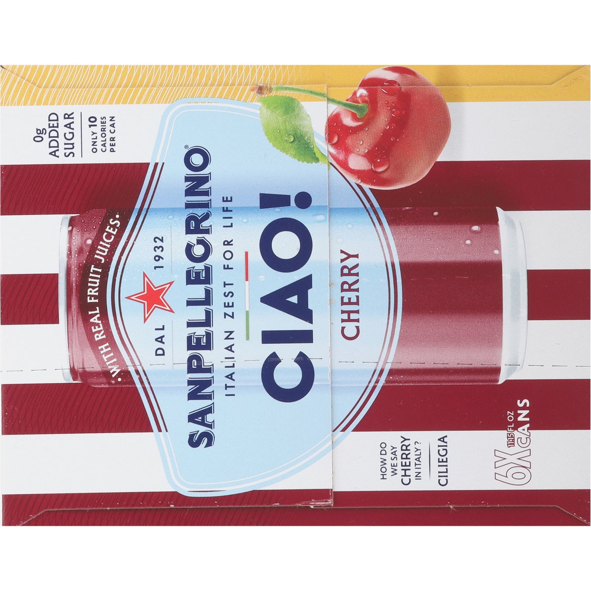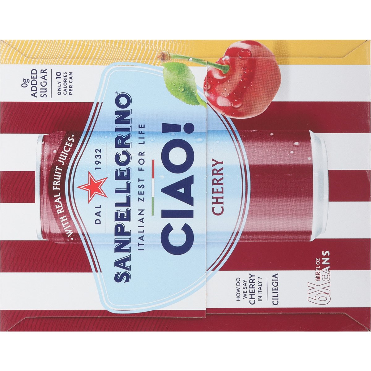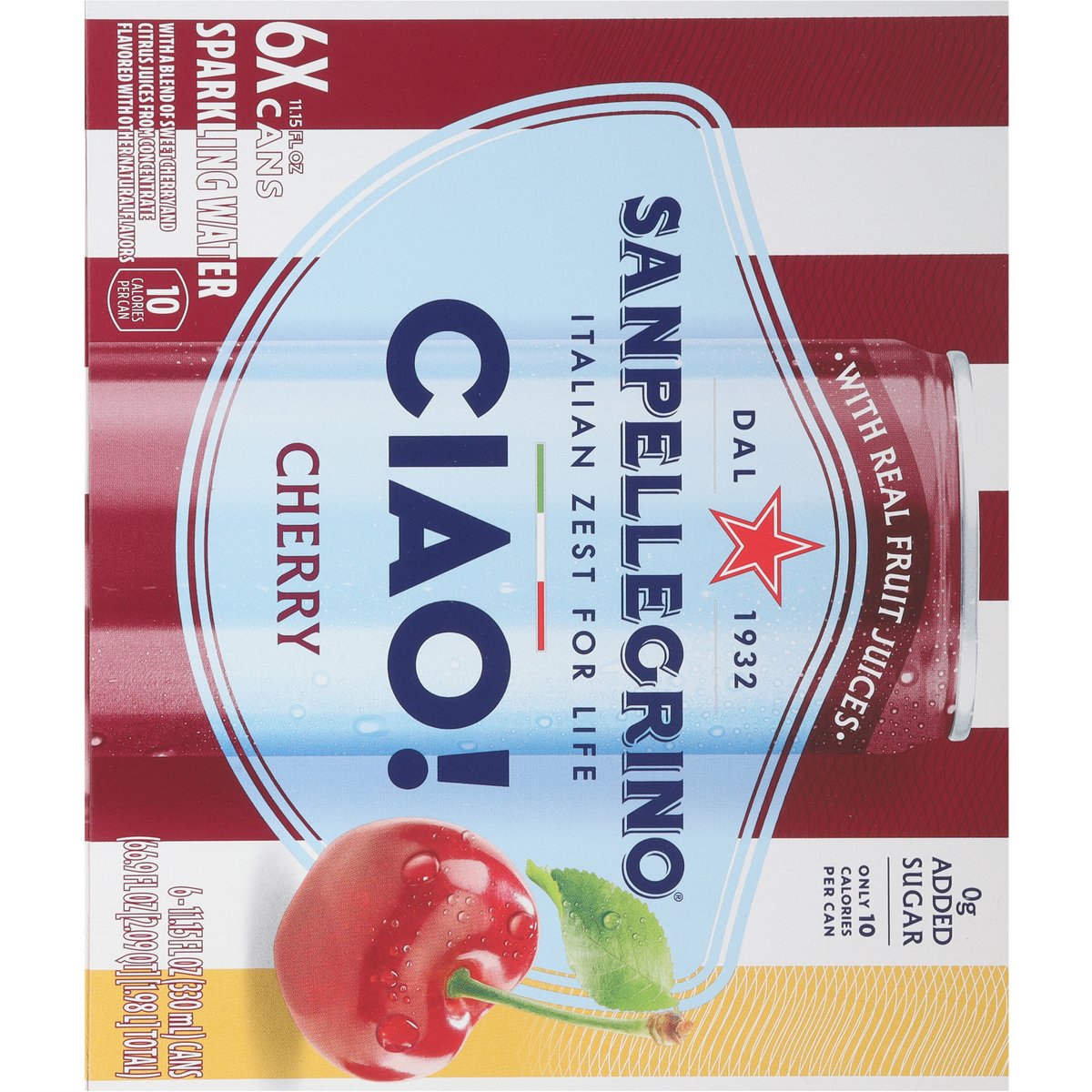 Sparkling water with a blend of sweet cherry and citrus juices from concentrate flavored with other natural flavors. 0 g added sugar. Only 10 calories per can. 10 calories per can. 1932. Italian zest for life. How do we say cherry in Italy?Ciliegia. Get ready to Say Ciao! to an experience inspired by the Italian Zest for Life. We've created something special: sparkling water with real fruit juice. natural flavors and a pinch of Sicilian salt to add refreshment to your day. Our cherry blends sweet and tangy together to deliver a perfectly balanced flavor. The best part? It's only 10 calories per can! With a 90-year history rooted in Italy, our sparkling beverages combine timeless tradition with quality ingredients. So go ahead - sit back, relax, and say Ciao! To the Italian zest for life! www.sanpellegrino.com/us. Follow us on Facebook. Instagram. For questions contact 1-800-255-8334 or www.sanpellegrino.com/us. Paper carton recyclable. Product of Italy.