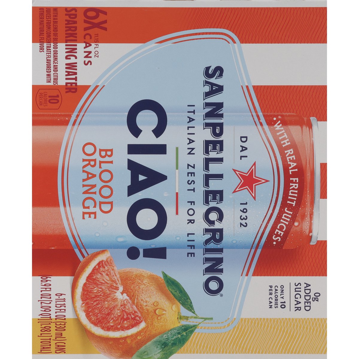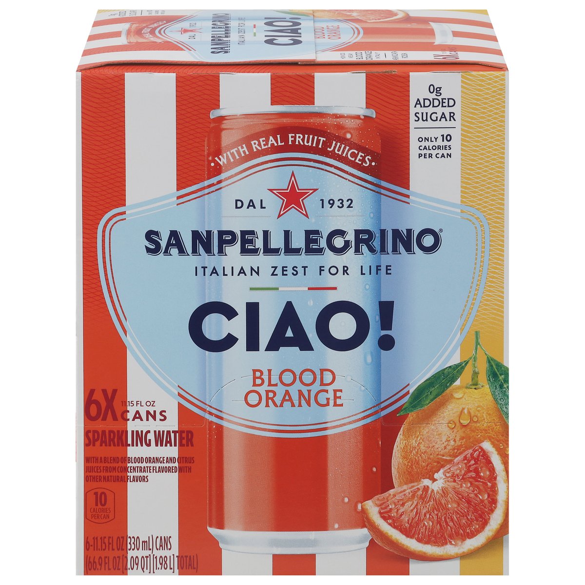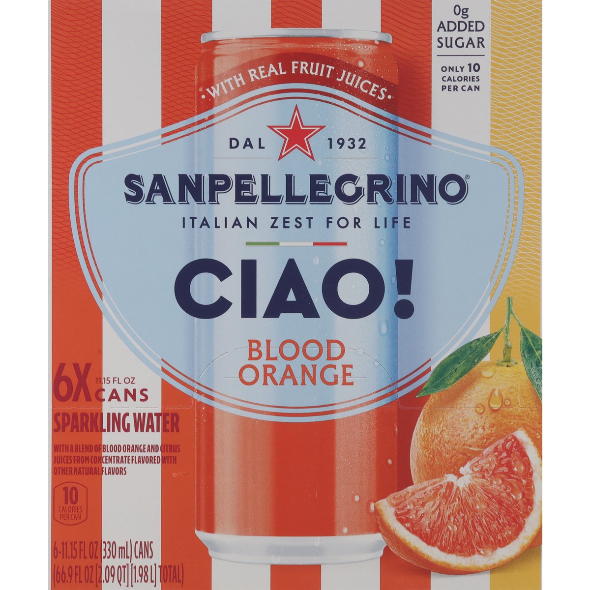 Sparkling water with a blend of blood orange and citrus juices from concentrate flavored with other natural flavors. 0 g added sugars. Only 10 calories per can. 10 calories per can. Dal 1932. Italian zest for life. Get ready to Say Ciao! to an experience inspired by the Italian Zest for Life. We've created something special: sparkling water with real fruit juice, natural flavors and a pinch of Sicilian salt to add refreshment to your day. Our blood orange blends sweet and tart together to deliver a perfectly balanced flavor. The best part? It's only 10 calories per can! With a 90-year history rooted in Italy, our sparkling beverages combine timeless traditions with quality ingredients. So go ahead - sit back, relax, and say Ciao! To the Italian zest for life! How do we say blood orange in Italy? www.sanpellegrino.com/us. Follow us on Facebook. Instagram. For questions contact 1-800-255-8334 or www.sanpellegrino.com/us. Paper carton recyclable. Product of Italy.