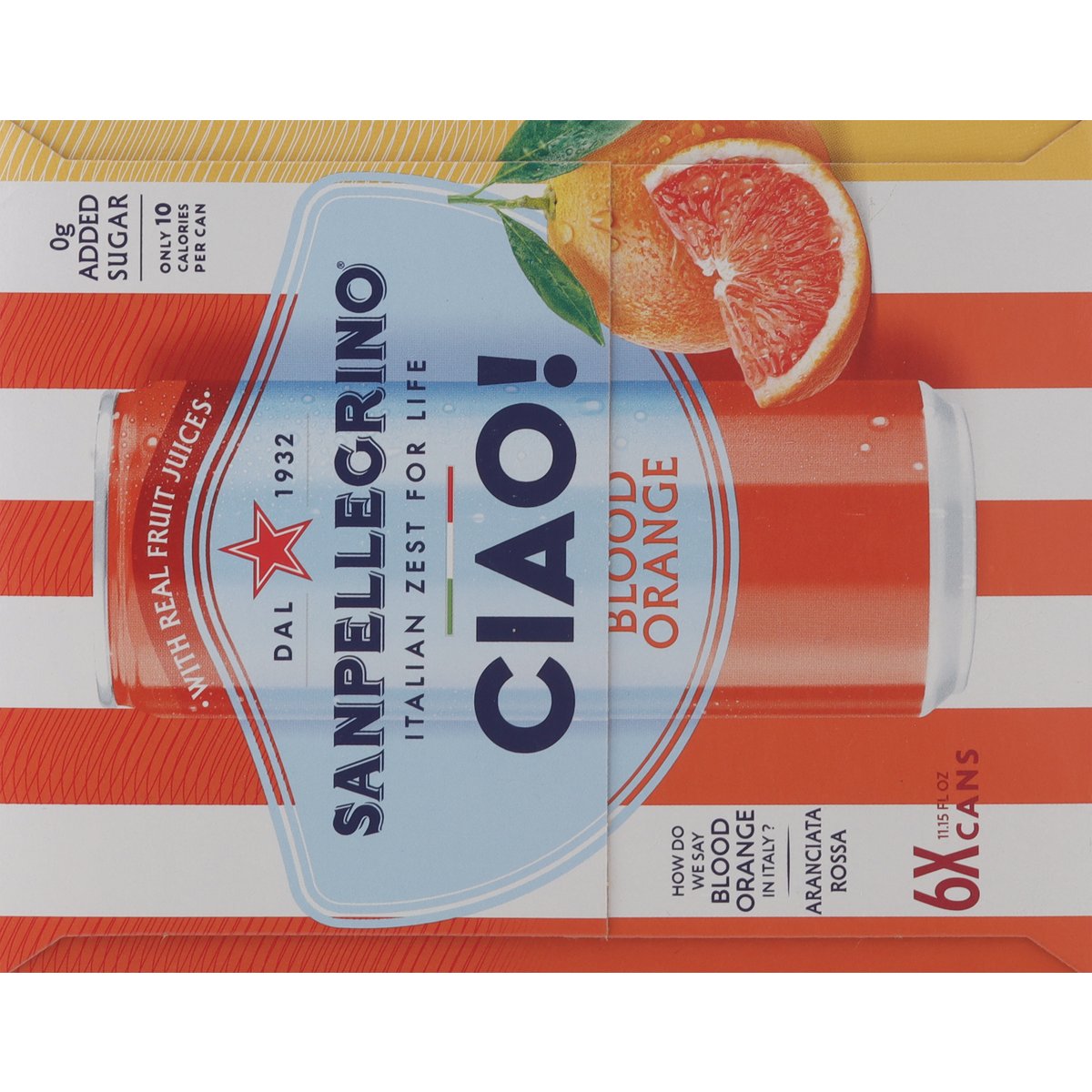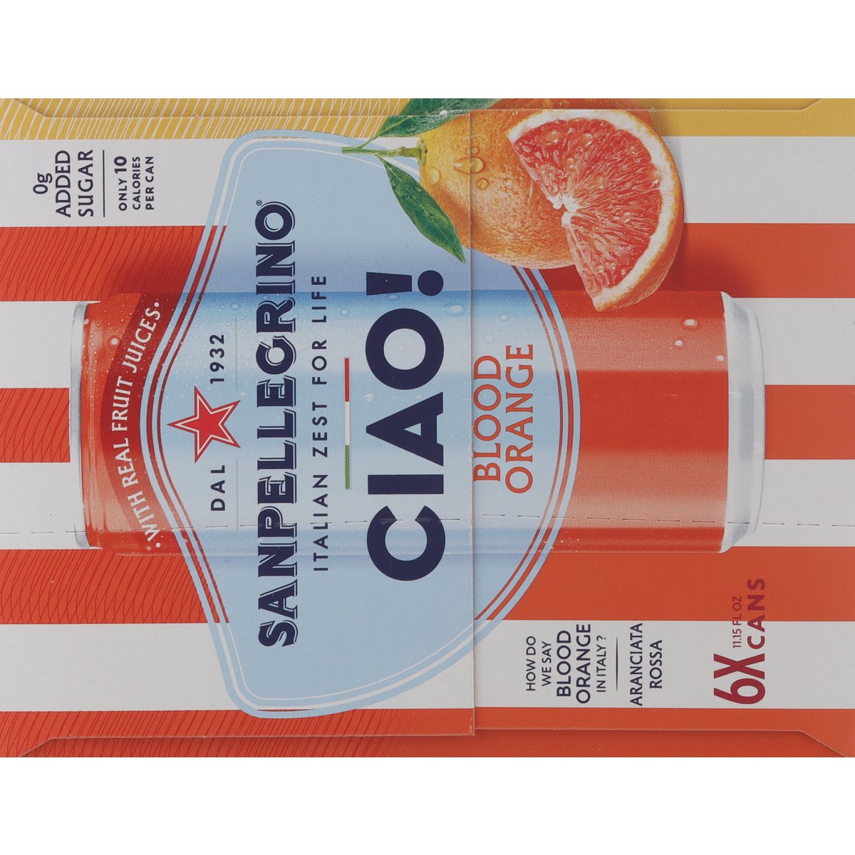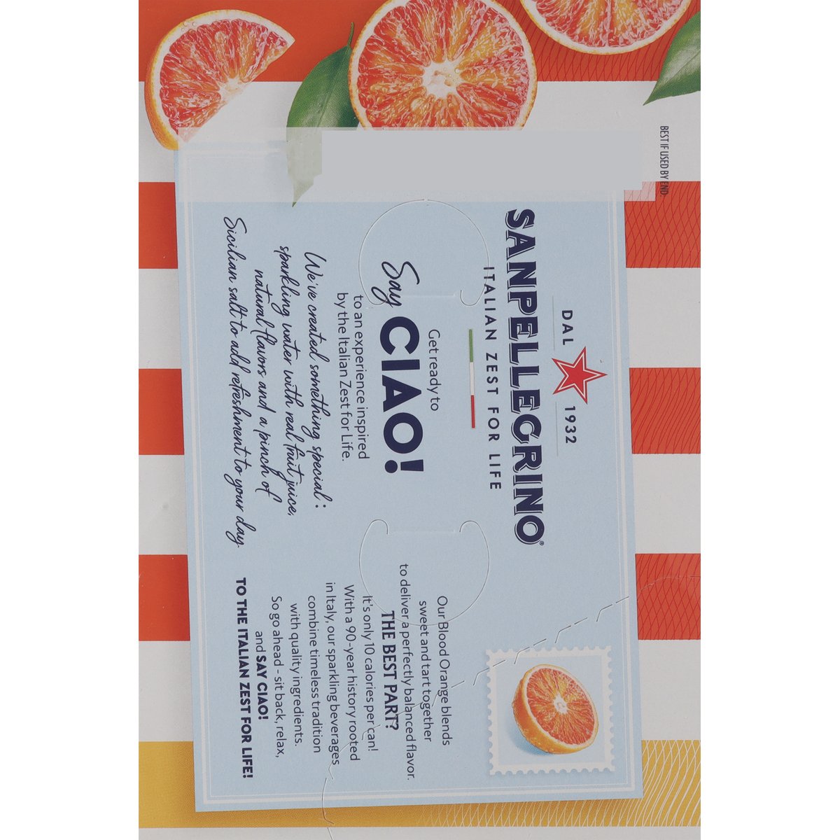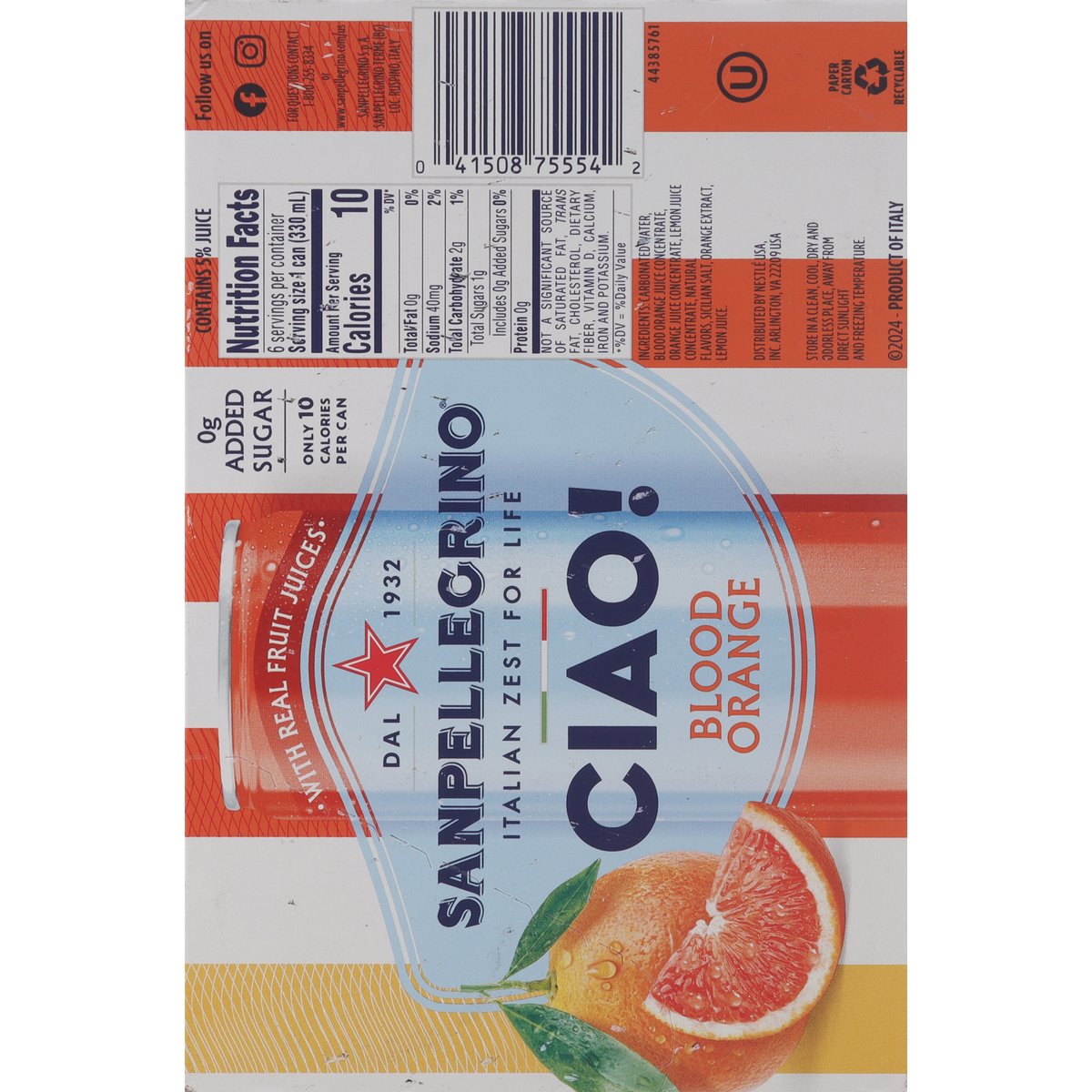 Sparkling water with a blend of blood orange and citrus juices from concentrate flavored with other natural flavors. 0 g added sugars. Only 10 calories per can. 10 calories per can. Dal 1932. Italian zest for life. Get ready to Say Ciao! to an experience inspired by the Italian Zest for Life. We've created something special: sparkling water with real fruit juice, natural flavors and a pinch of Sicilian salt to add refreshment to your day. Our blood orange blends sweet and tart together to deliver a perfectly balanced flavor. The best part? It's only 10 calories per can! With a 90-year history rooted in Italy, our sparkling beverages combine timeless traditions with quality ingredients. So go ahead - sit back, relax, and say Ciao! To the Italian zest for life! How do we say blood orange in Italy? www.sanpellegrino.com/us. Follow us on Facebook. Instagram. For questions contact 1-800-255-8334 or www.sanpellegrino.com/us. Paper carton recyclable. Product of Italy.