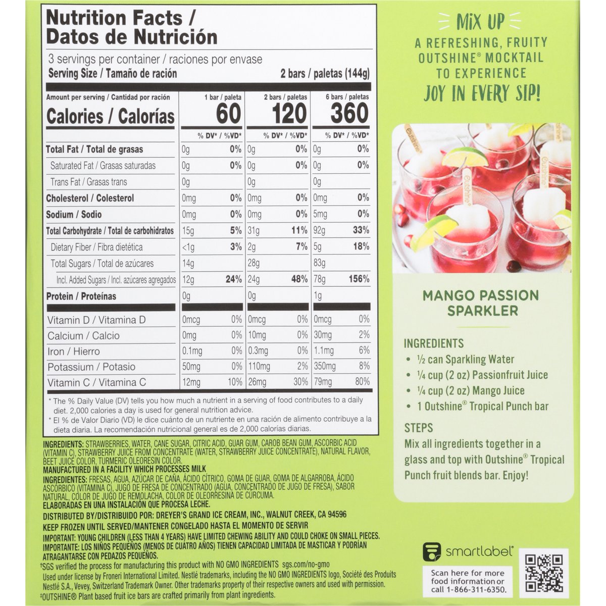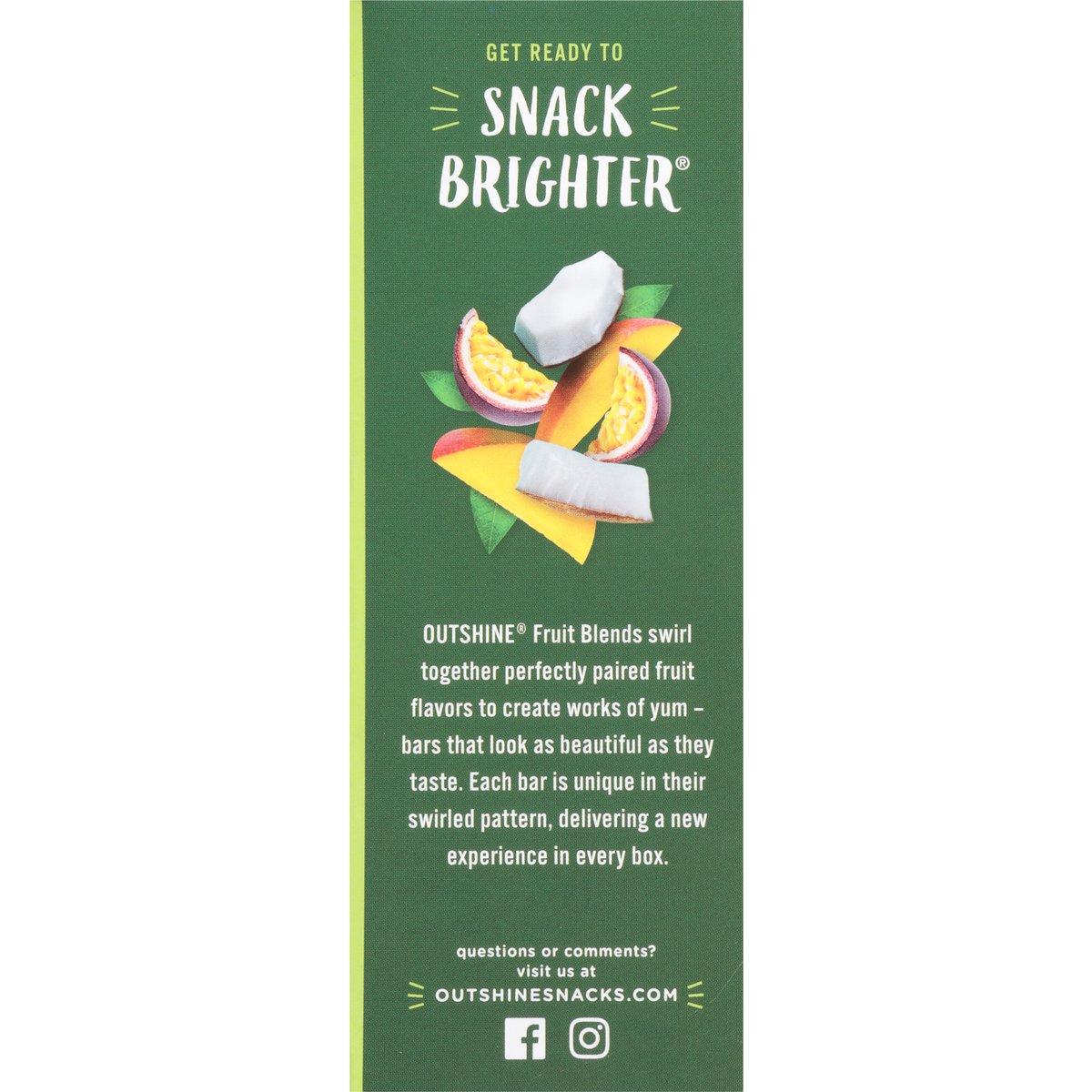 No artificial colors or flavors*. * Added colors from natural sources. Fat free. Gluten free. Good source of vitamin C per 1 bar. No GMO ingredients(b). (b) SGS verified the process for manufacturing this product with no GMO ingredients. sgs.com/no-GMO. Plant based(a). New! Mix Up: A refreshing, fruity Outshine mocktail to experience joy in every sip! Get Ready to Snack Brighter: Outshine Fruit Blends swirl together perfectly paired fruit flavors to create works of yum - bars that look as beautiful as they taste. Each bar is unique in their swirled pattern, delivering a new experience in every box. No high fructose corn syrup. (a) Added colors from natural sources. Facebook. Instagram. SmartLabel: Scan for more food information or call 1-866-311-6350. Facebook. Instagram. Questions or comments? visit us at Outshinesnacks.com. 866-311-6350. Please recycle this carton.