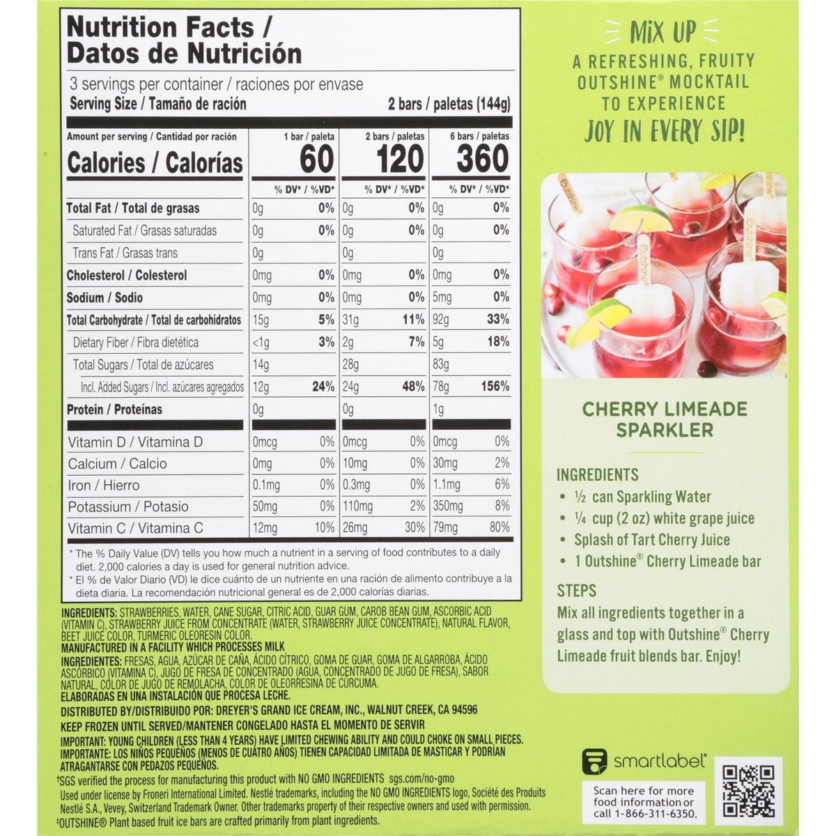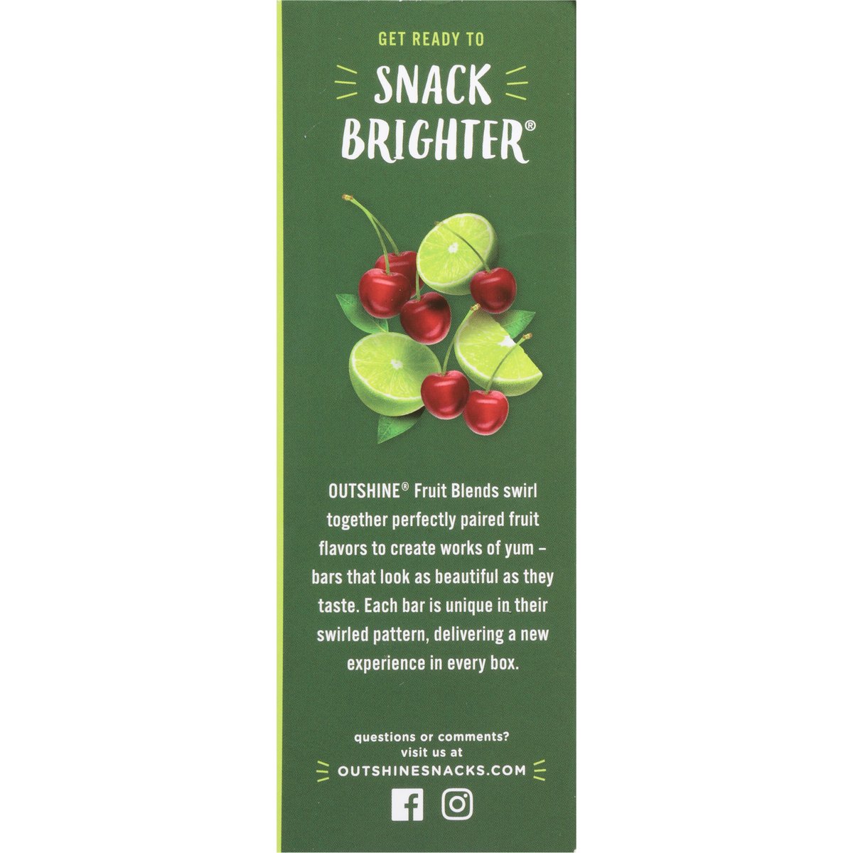 No artificial colors or flavors+. + Added colors from natural sources. Gluten free. Fat free. Good source of vitamin C per 1 bar. No GMO ingredients(b). (b) SGS verified the process for manufacturing this product with no GMO ingredients. sgs.com/no-GMO. Plant based(a). New! Mix Up: A refreshing, fruity Outshine mocktail to experience joy in every sip! Get Ready to Snack Brighter: Outshine Fruit Blends swirl together perfectly paired fruit flavors to create works of yum - bars that look as beautiful as they taste. Each bar is unique in their swirled pattern, delivering a new experience in every box. No high fructose corn syrup. (a) Added colors from natural sources. outshinesnacks.com. SmartLabel: Scan for more food information or call 1-866-311-6350. Facebook. Instagram. Questions or comments? Visit us at outshinesnacks.com. 1-866-311-6350. Please recycle this carton.
