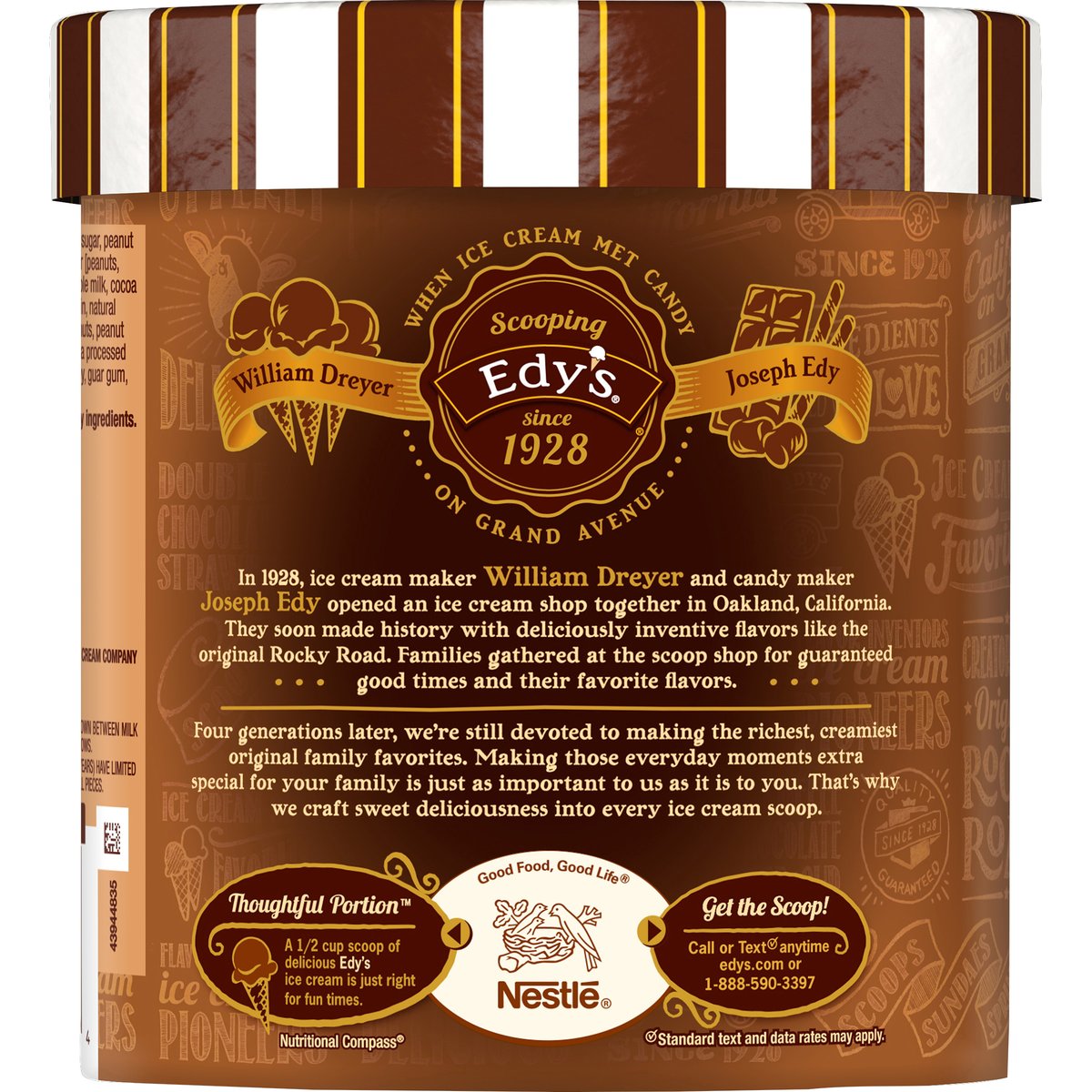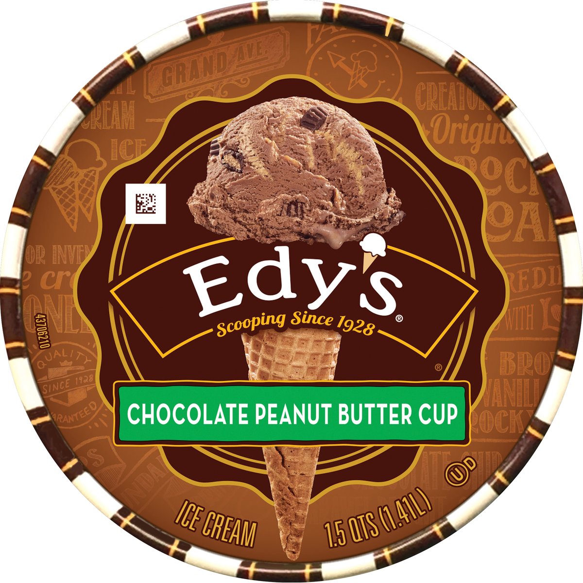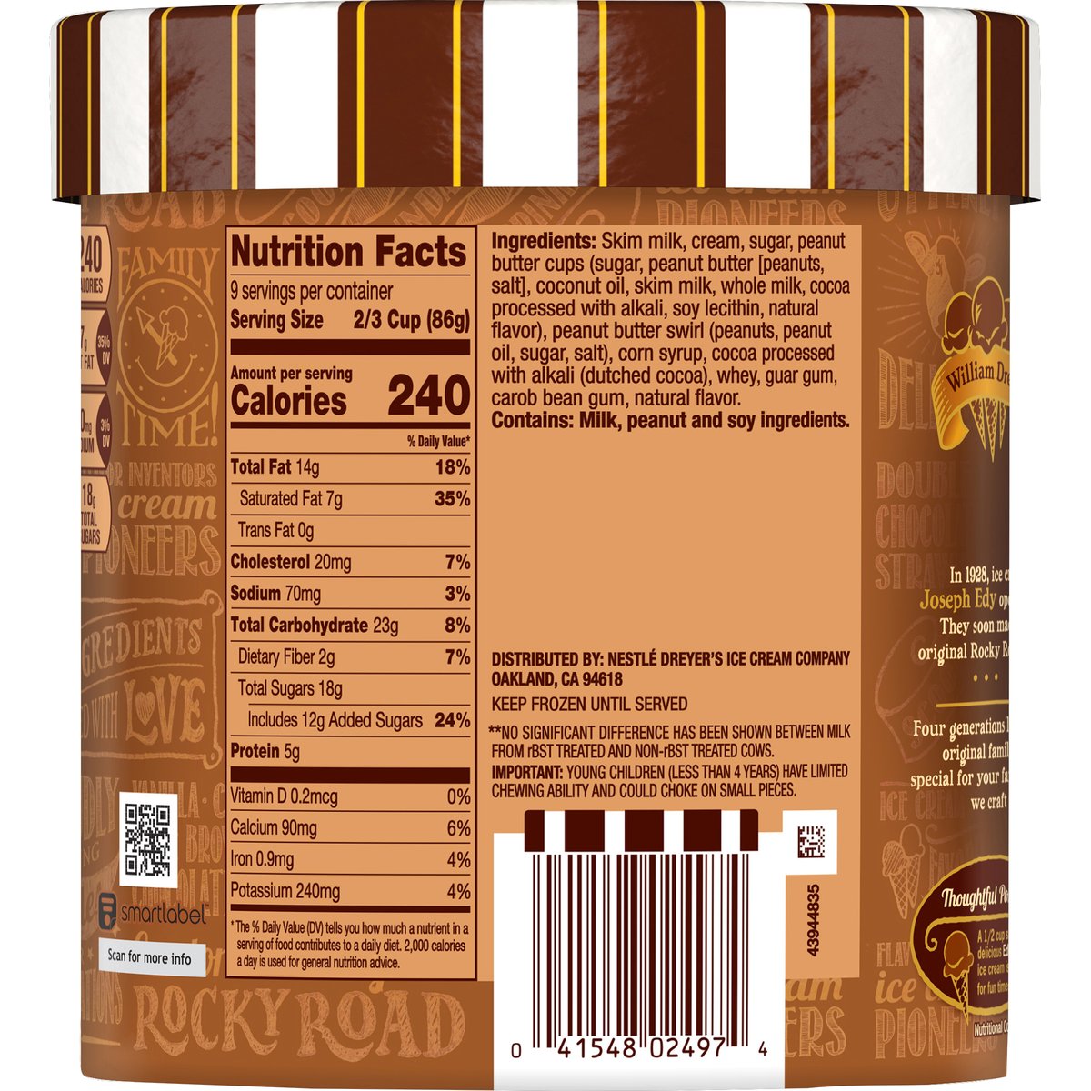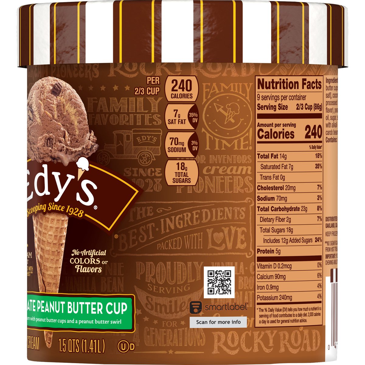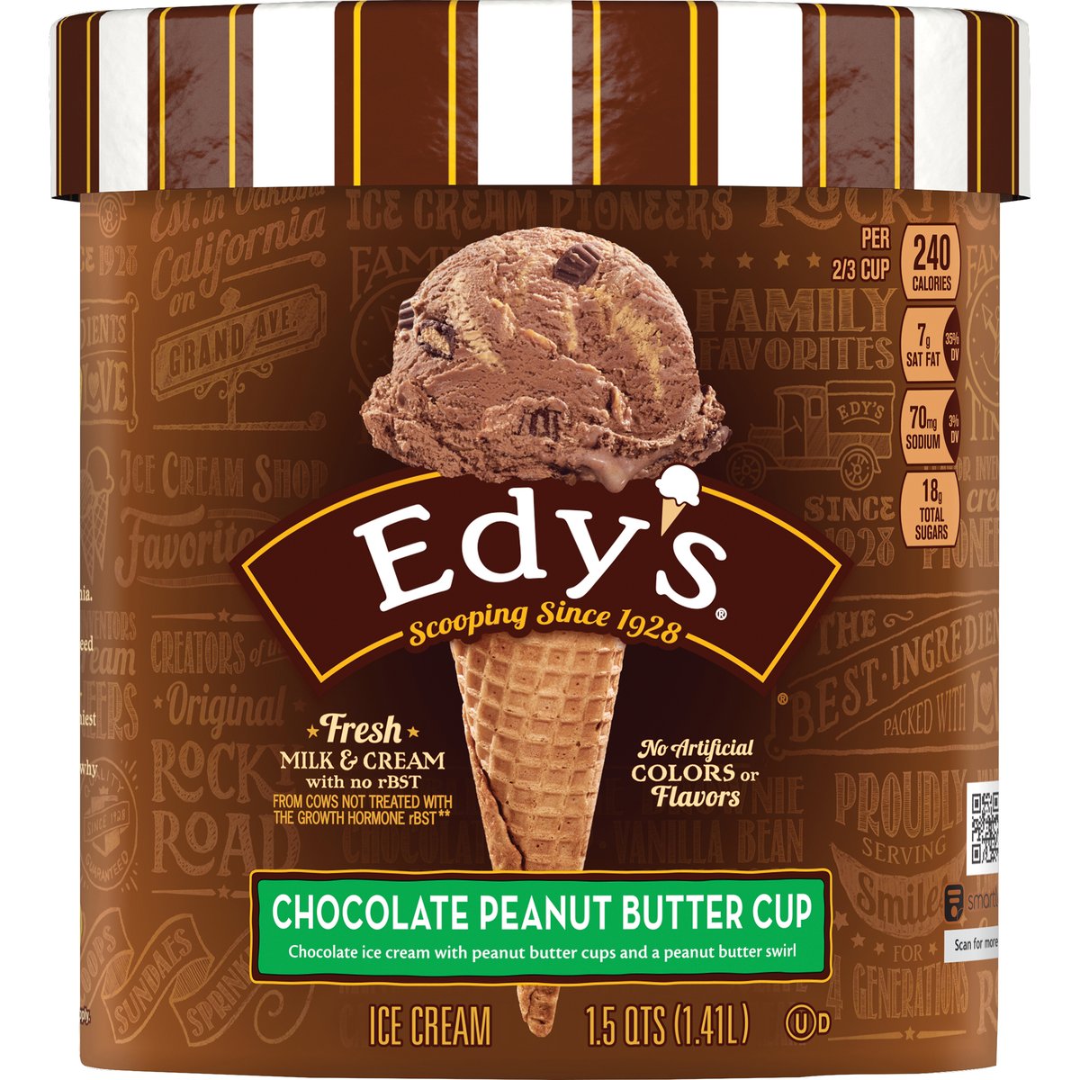 Chocolate ice cream with peanut butter cups and a peanut butter swirl. Per 1/2 Cup: 240 calories; 7 g sat fat (35% DV); 70 mg sodium (3% DV); 18 g total sugars. Fresh milk & cream with no rBST. From cows not treated with the growth hormone rBST (No significant difference has been shown between milk from rBST treated and non-rBST treated cows). Scooping since 1928. When ice cream met candy on Grand Avenue. William Dreyer. Joseph Edy. In 1928, ice cream maker William Dreyer and candy maker Joseph Edy opened an ice cream shop together in Oakland, California. They soon made history with deliciously inventive flavors like the original Rocky Road. Families gathered at the scoop shop for guaranteed good times and their favorite flavors. Four generations later, we're still devoted to making the richest, creamiest original family favorites. Making those everyday moments extra special for your family is just as important to us as it is to you. That's why we craft sweet deliciousness into every ice cream scoop. Nutritional Compass: Good food, good life. Thoughtful Portion: A 1/2 cup scoop of delicious Edy's ice cream is just right for fun times. Get the Scoop! Call or text (Standard text and data rates may apply) anytime edys.com or 1-888-590-3397. SmartLabel: Scan for more info.