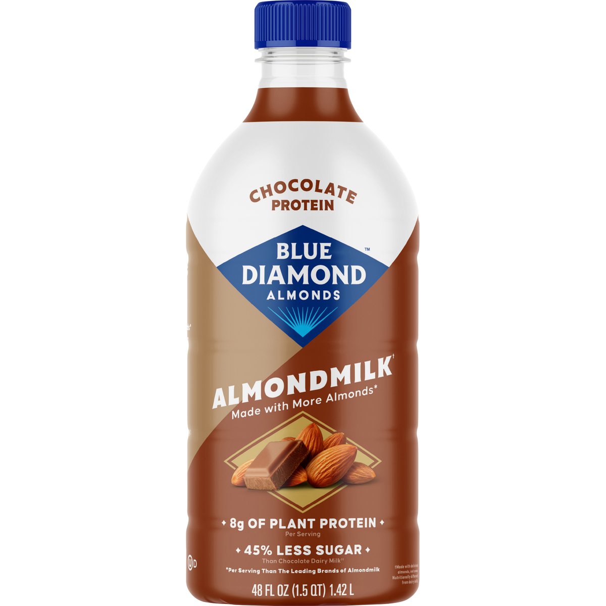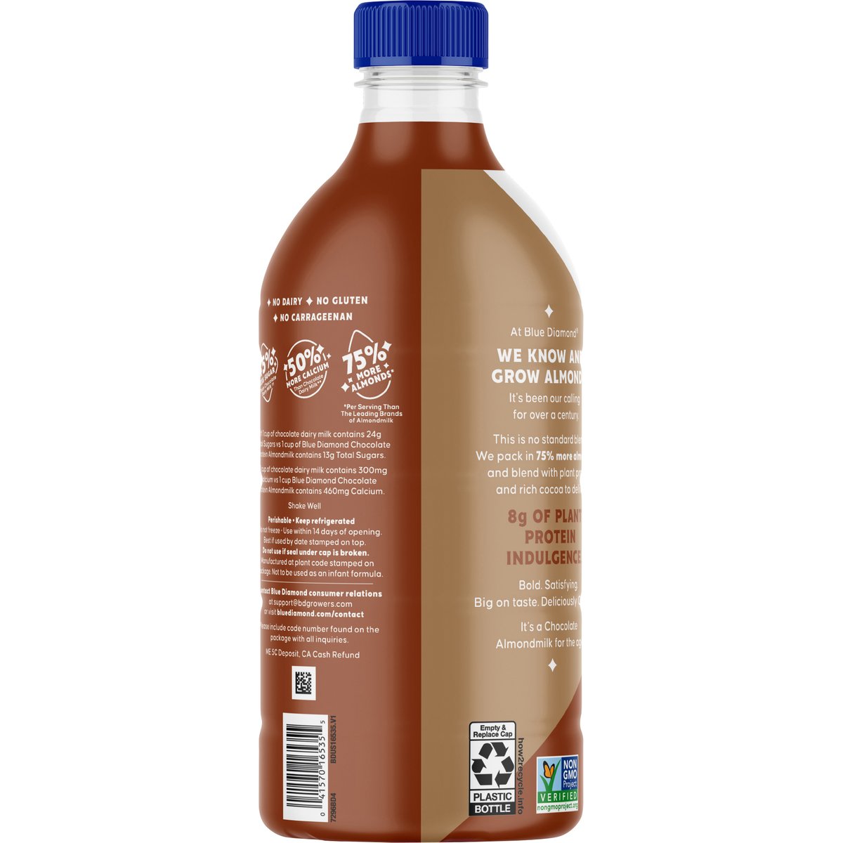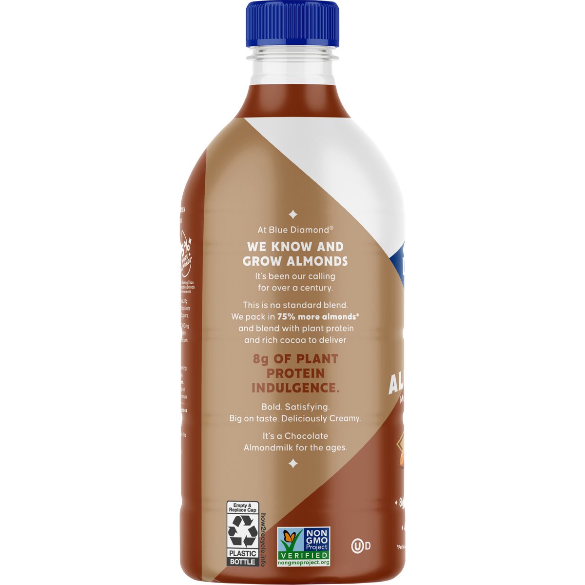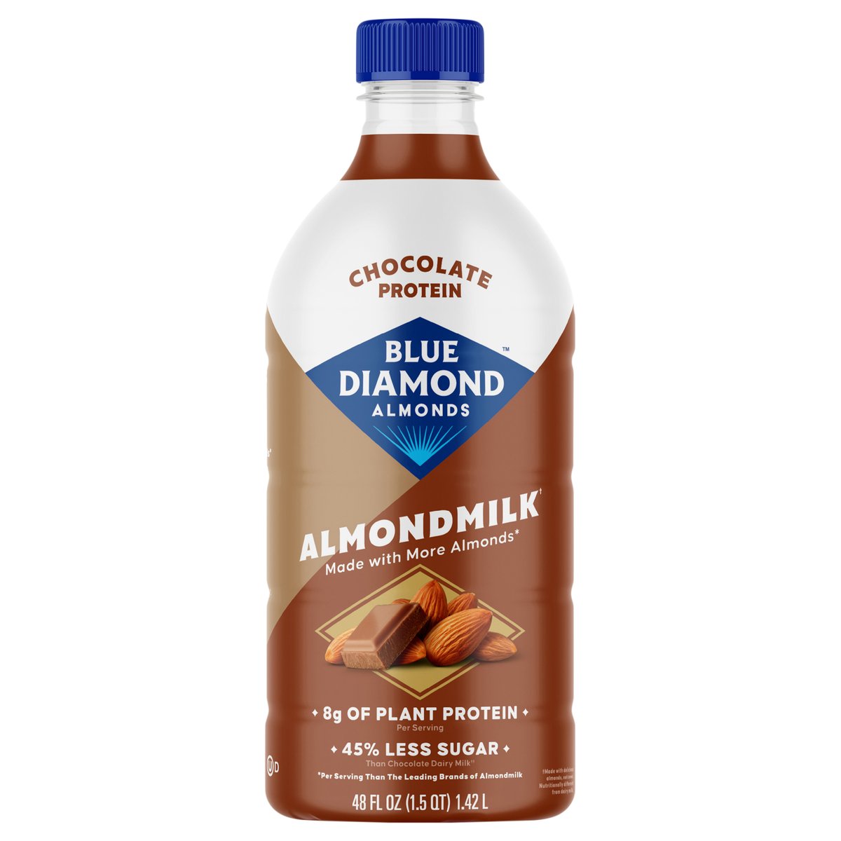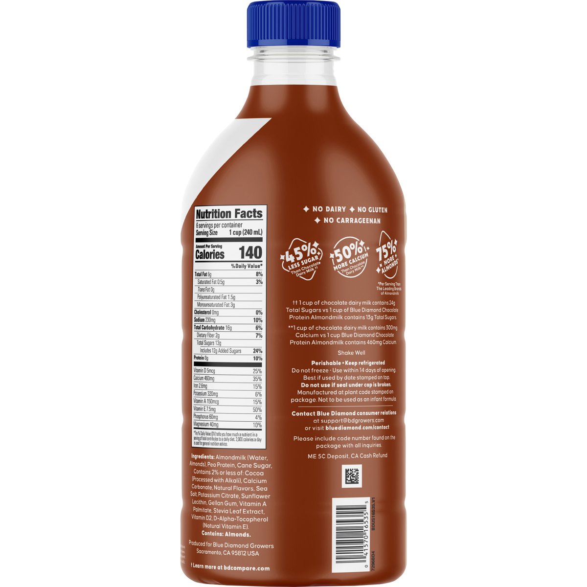 8 g of plant protein per serving. No gluten. 45% less sugar than chocolate dairy milk(b). 50% more calcium than chocolate dairy milk**. 75% more almonds*. * Per Serving Than The Leading Brands of Almondmilk. (b) 1 cup of chocolate dairy milk contains 24 g Total Sugars vs 1 cup of Blue Diamond Chocolate Protein Almondmilk contains 13 g Total Sugars. ** 1 cup of chocolate dairy milk contains 300 mg Calcium vs 1 cup Blue Diamond Chocolate Protein Almondmilk contains 460 mg Calcium. Non-GMO Project verified. nongmoproject.org. Unsweetened simple. No oils. No gums. No fillers. No carrageenan. No dairy. At Blue Diamond we know and grow almonds. It's been our calling for over a century. This is no standard blend. We pack in 75% more almonds* and blend with plant protein and rich cocoa to deliver. Bold. Satisfying. Big on taste. Deliciously creamy. It's a chocolate almondmilk for the ages. Manufactured at plant code stamped on package. * Per serving than the leading brands of Almondmilk. bdcompare.com. bluediamond.com/contact. how2recycle.info. Contact Blue Diamond customer relations at support@bdgrowers.com or visit bluediamond.com/contact. Please include code number found on the package with all inquiries.