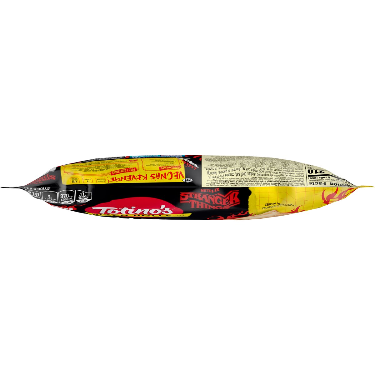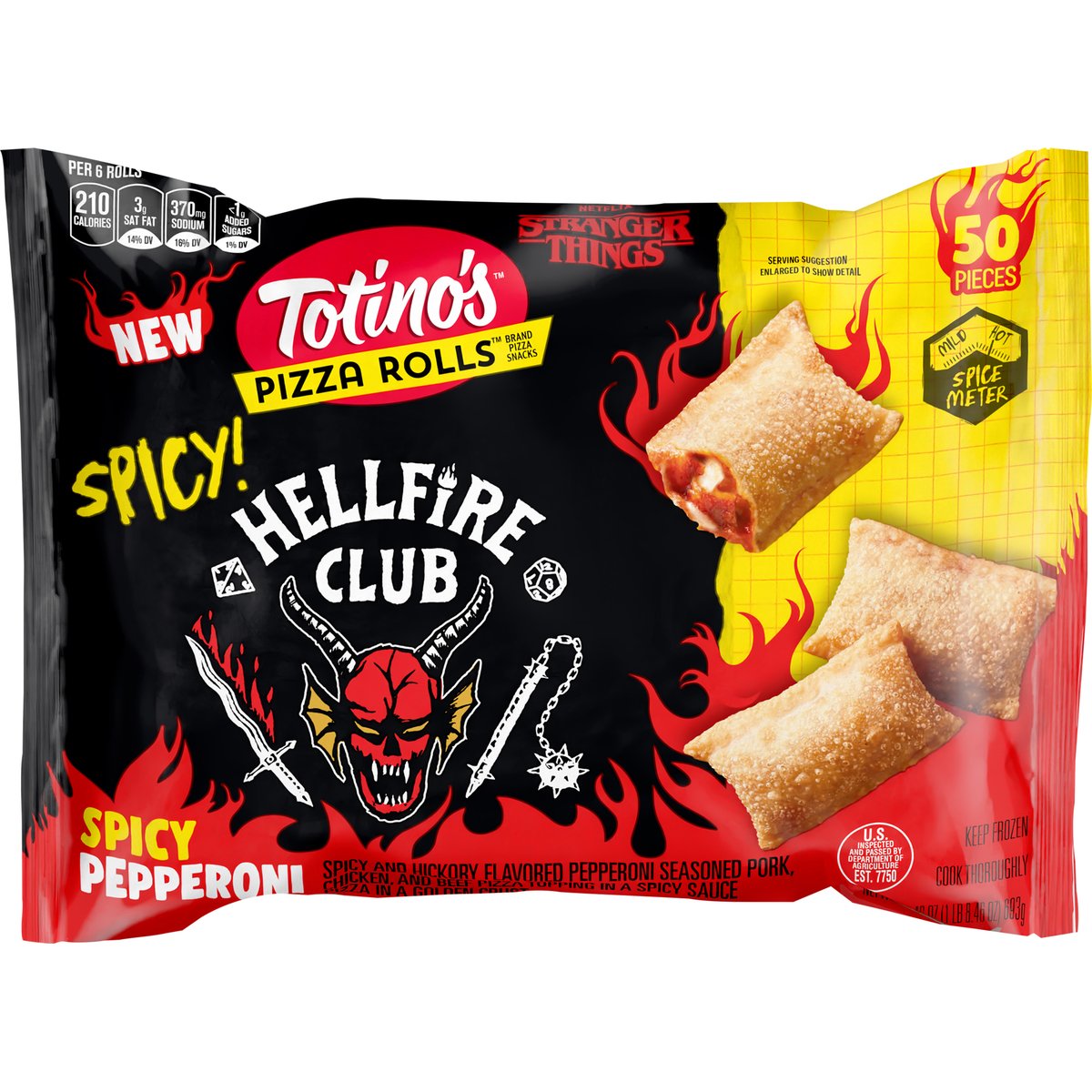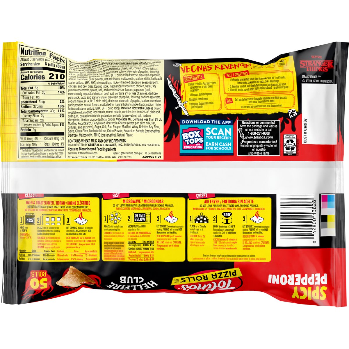 Spicy and hickory flavored pepperoni seasoned pork, chicken, and beef pizza topping in a spicy sauce pizza in a golden crust. Per 6 Rolls: 210 calories; 3 g sat fat (14% DV); 370 mg sodium (16% DV); <1 g added sugars (1% DV). Contains bioengineered food ingredients. Learn more at Ask.GeneralMills.com. Netflix: Stranger Things. New. Spicy Meter: Hot. Spicy! U.S. inspected and passed by Department of Agriculture. www.totinos.com. how2recycle.info. Ask.GeneralMills.com. Questions or comments? Save the package and visit us on our website or call 1-800-231-0308. www.totinos.com. Box Tops for Education: Download the app. Scan your receipt. Earn cash for schools.