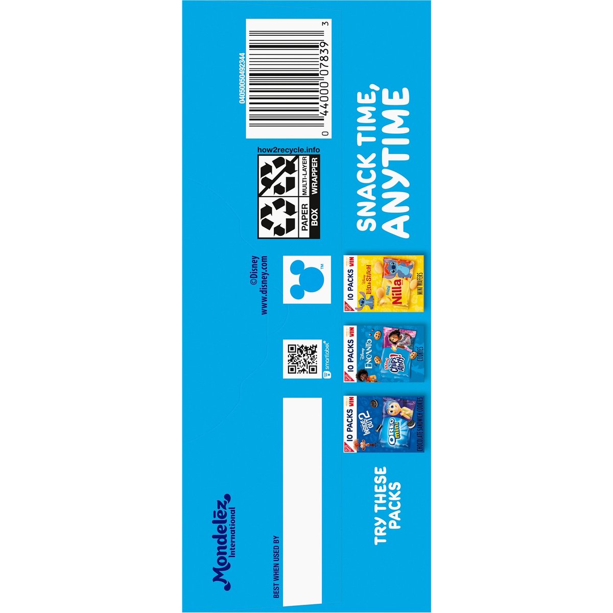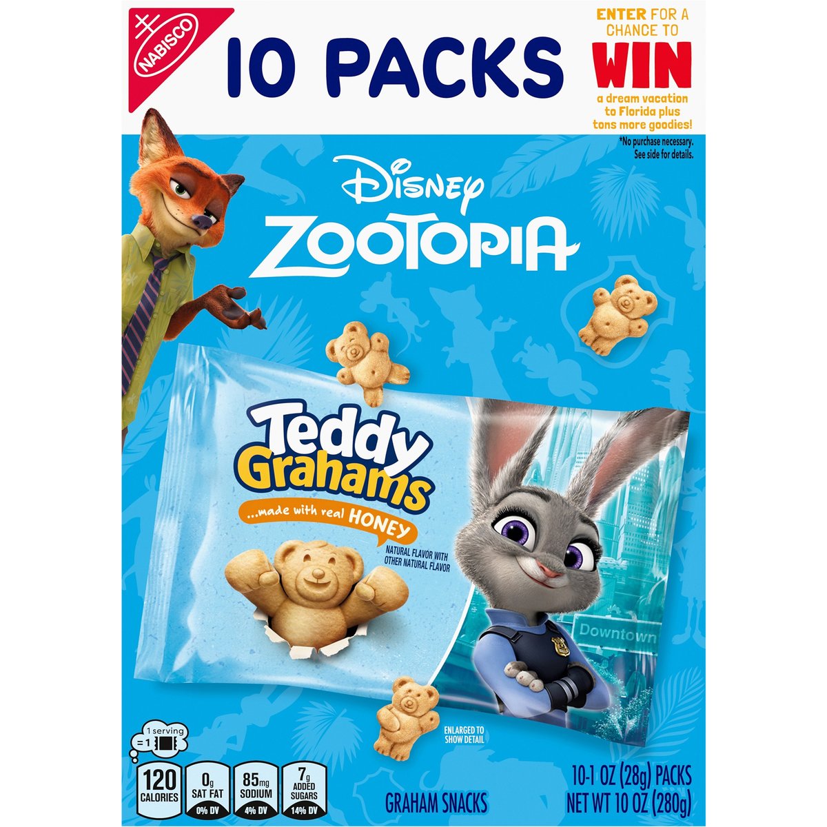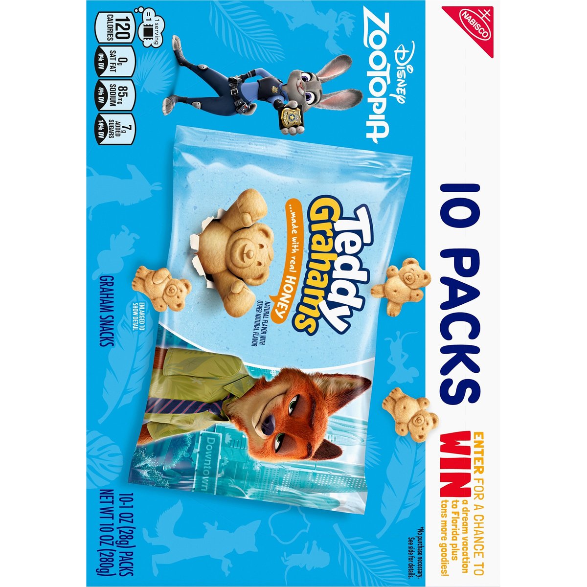No artificial flavors or colors. Natural flavor with other natural flavor. 1 Serving = 1: 120 calories; 0 g sat fat (0% DV); 85 mg sodium (4 % DV); 7 g added sugars (14% DV). 8 grams of whole grain per 28 serving. Whole Grain: 8 grams per serving. Eat 48 g or more of whole grains daily. WholeGrainCouncil.org. Teddy Grahams Graham Snacks Honey have 8 g of whole grain per 28 g serving. Nutritionists recommend eating 48 g or more of whole grains throughout the day. Good source of calcium. Ingredients derived from a bioengineered source. No high fructose corn syrup. Snack time, anytime. snackworks.com. how2recycle.info. SmartLabel. Visit us at: snackworks.com. 1-800-622-4726. Please have package available. Try These Packs: 20 Packs: 5 Oreo mini; 5 Ritz bits; 5 Nutter Butter bites; 5 Mini chips ahoy! 30 Packs: 10 Chips ahoy!; 10 Oreo; 10 Golden Oreo. Made in Mexico.