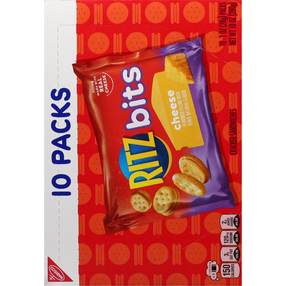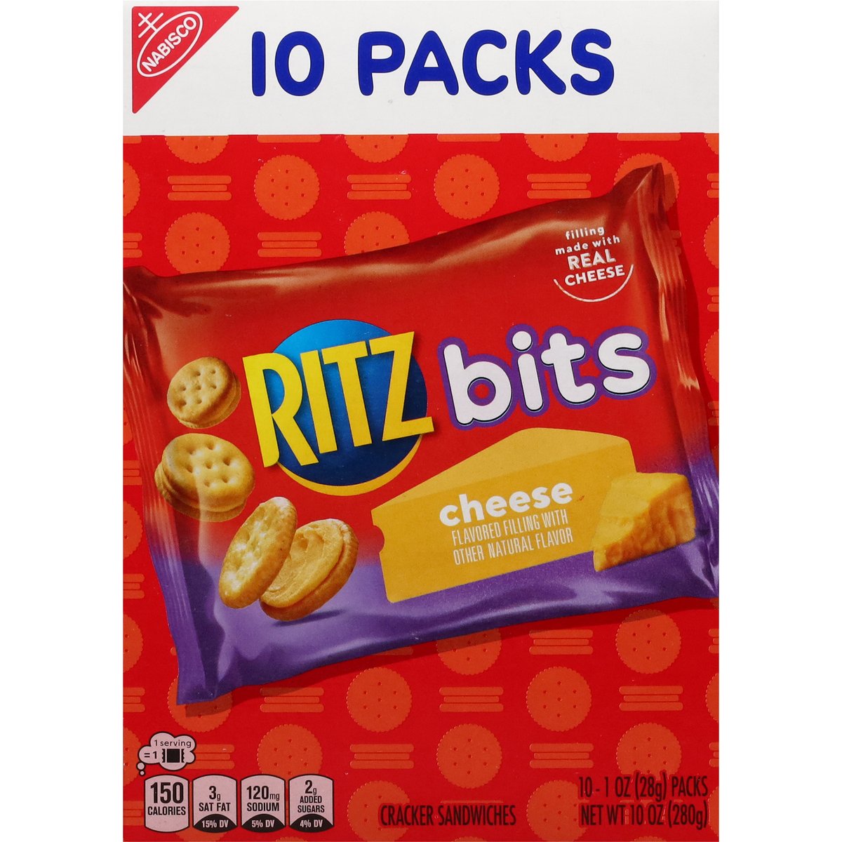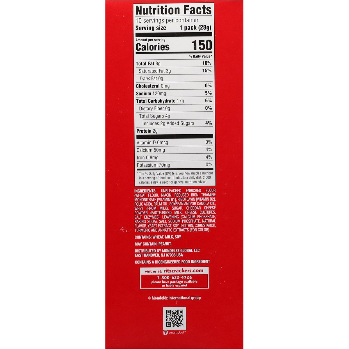Cheese flavored filling with other natural flavors. 140 calories; 2 g sat fat (10% DV); 110 mg sodium (5% DV); 11 g added sugars (22% DV). Contains a bioengineered food ingredient. ritzcrackers.com. how2recycle.info. Smartlabel. Visit us at: ritzcrackers.com. 1-800-622-4726 please have package available. Try these packs. 20 Packs: 5 oreo mini; 5 ritz bits; 5 nutter butter bites; 5 mini chips ahoy! 30 Packs: 10 chips ahoy! 10 oreo; 10 golden oreo. Snack time, anytime.