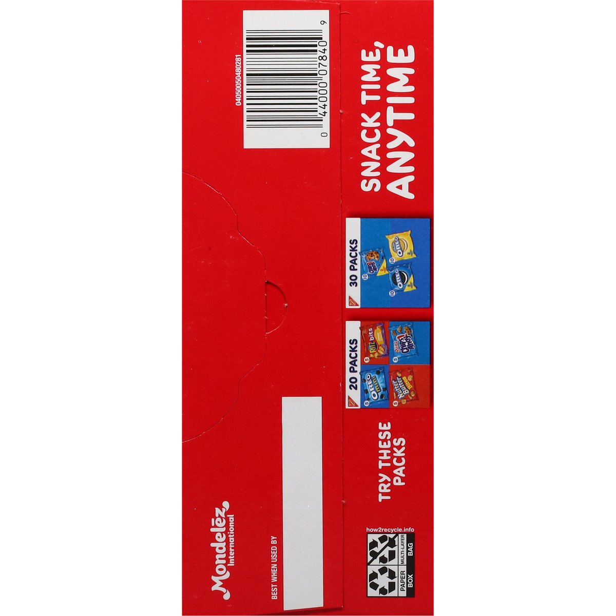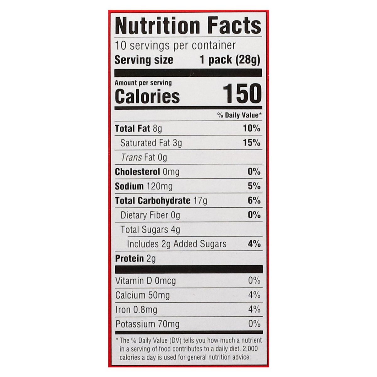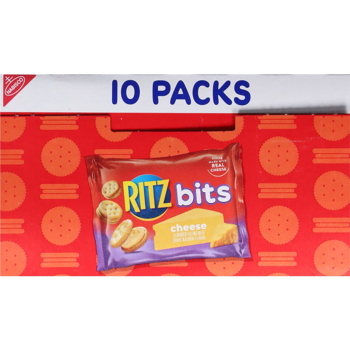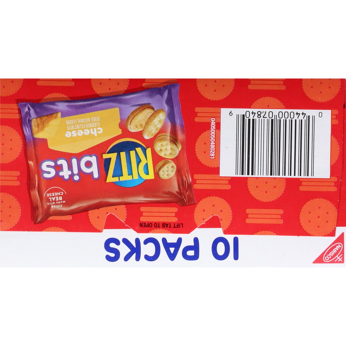 Cheese flavored filling with other natural flavors. 140 calories; 2 g sat fat (10% DV); 110 mg sodium (5% DV); 11 g added sugars (22% DV). Contains a bioengineered food ingredient. ritzcrackers.com. how2recycle.info. Smartlabel. Visit us at: ritzcrackers.com. 1-800-622-4726 please have package available. Try these packs. 20 Packs: 5 oreo mini; 5 ritz bits; 5 nutter butter bites; 5 mini chips ahoy! 30 Packs: 10 chips ahoy! 10 oreo; 10 golden oreo. Snack time, anytime.
