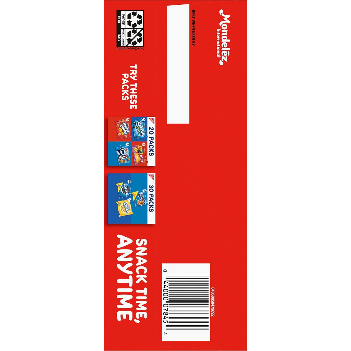 1 Serving = 1: 120 calories; 0.5 g sat fat (3% DV); 85 mg sodium (4% DV); 7 g added sugars (14% DV). Good source of calcium. Contains a bioengineered food ingredient. Nabisco. Snack time, anytime. snackworks.com. how2recycle.info. SmartLabel. Visit us at: snackworks.com. 1-800-622-4726. Please have package available. Try these packs. 20 Packs: 5 Oreo Mini; 5 Ritz Bits; 5 Nutter Butter Bites; 5 Mini Chips Ahoy! 30 Packs: 10 Chips Ahoy!; 10 Oreo; 10 Golden Oreo. Made in Mexico.