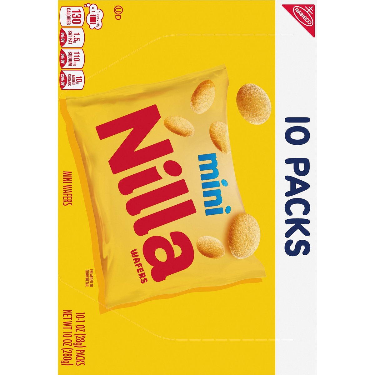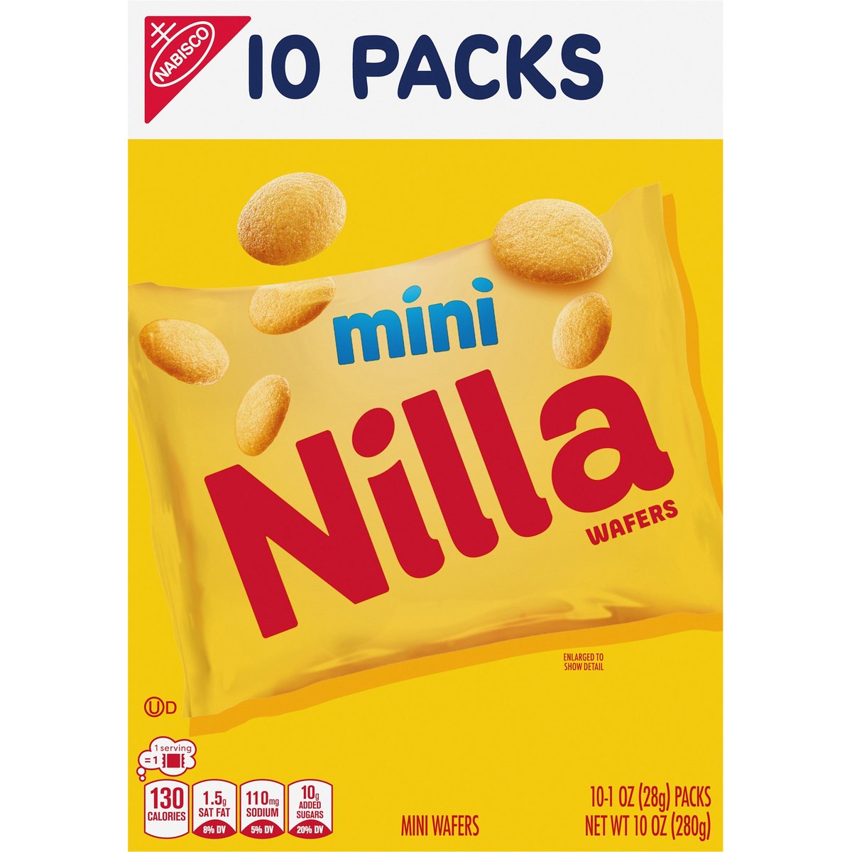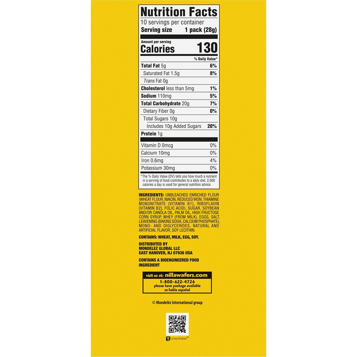 1 Serving = 1. 130 calories; 1.5 g sat fat (8% DV); 110 mg sodium (5% DV); 10 g added sugars (20% DV). Contains a bioengineered food ingredient. Nabisco. Snack time, anytime. The possibilities are endless. how2recycle.info. nillawafers.com. SmartLabel. Scan me. Visit us at: nillawafers.com. 1-800-622-4726. Please have package available. Try These Packs: 20 Packs: 5 Oreo mini; 5 Ritz bits; 5 Nutter Butter bites; 5 Mini chip ahoy! 30 Packs: 10 Chips Ahoy! 10 Oreo; 10 Golden Oreo.