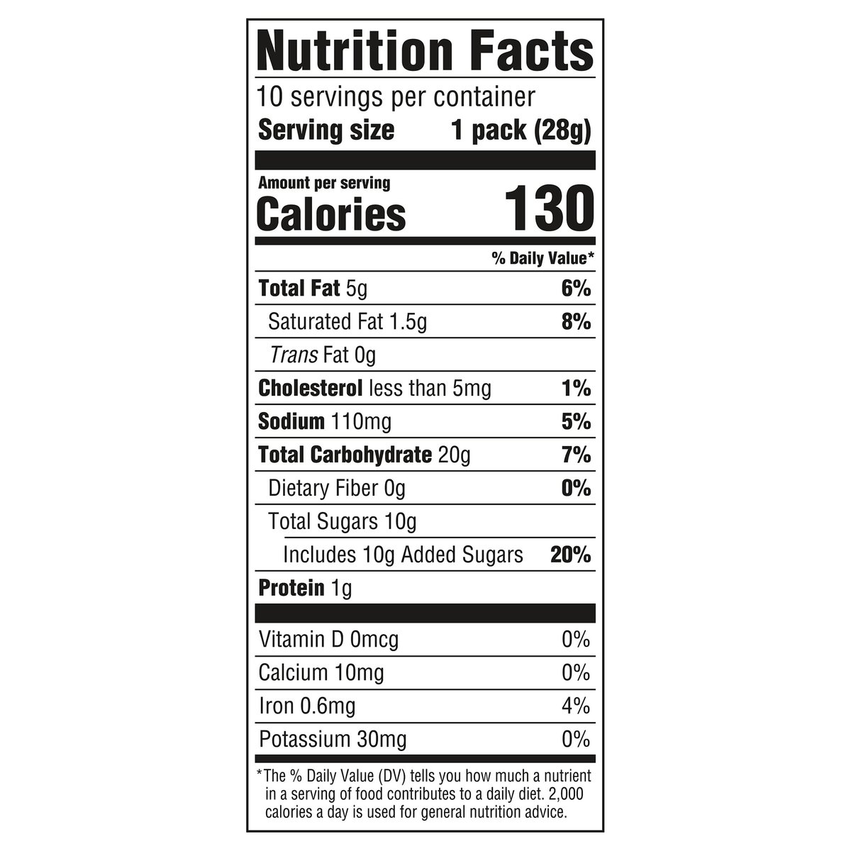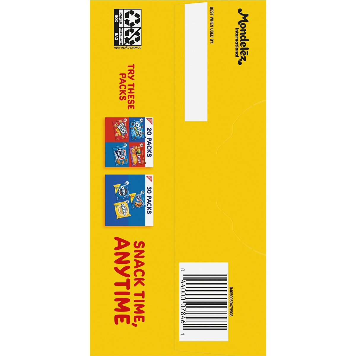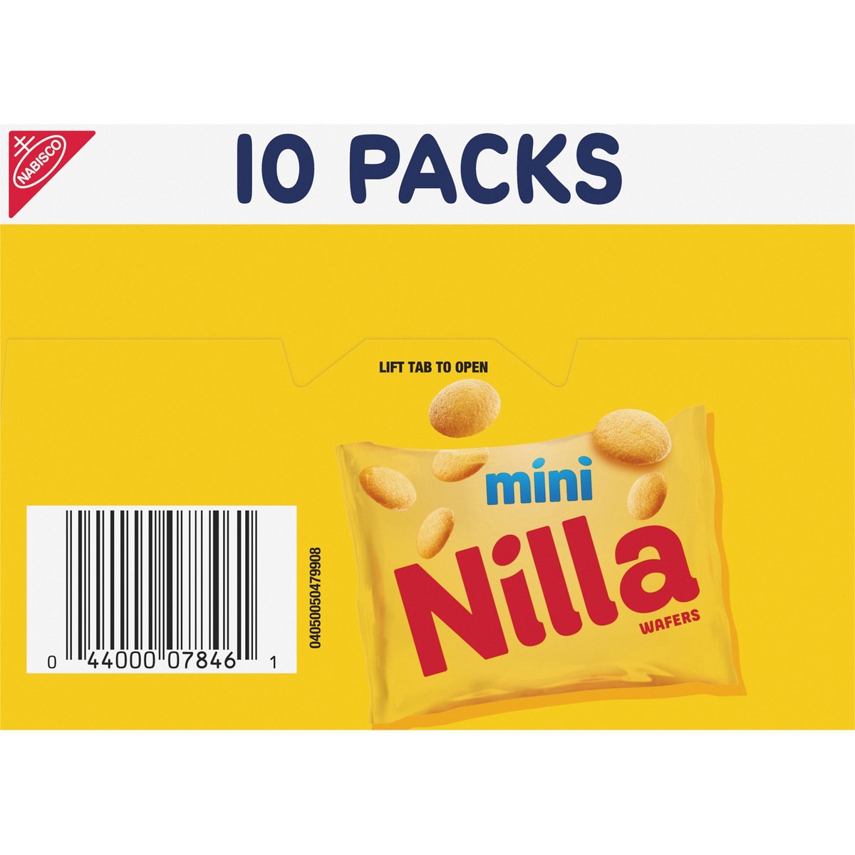 1 Serving = 1. 130 calories; 1.5 g sat fat (8% DV); 110 mg sodium (5% DV); 10 g added sugars (20% DV). Contains a bioengineered food ingredient. Nabisco. Snack time, anytime. The possibilities are endless. how2recycle.info. nillawafers.com. SmartLabel. Scan me. Visit us at: nillawafers.com. 1-800-622-4726. Please have package available. Try These Packs: 20 Packs: 5 Oreo mini; 5 Ritz bits; 5 Nutter Butter bites; 5 Mini chip ahoy! 30 Packs: 10 Chips Ahoy! 10 Oreo; 10 Golden Oreo.